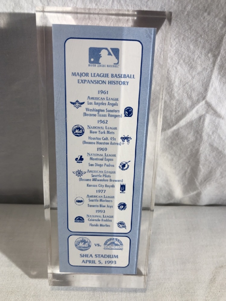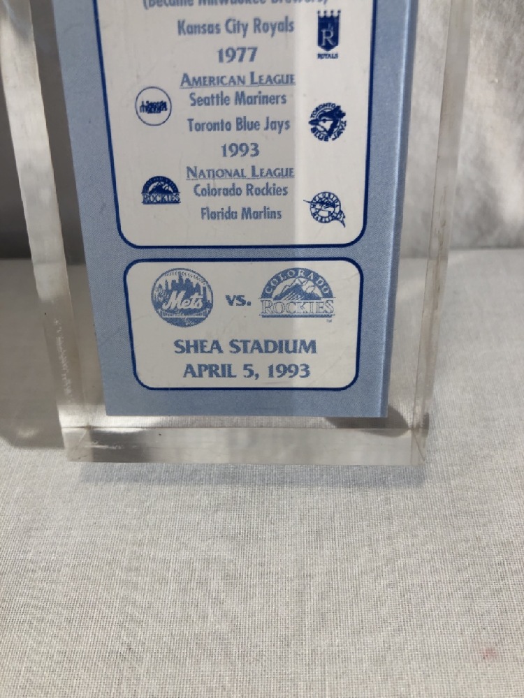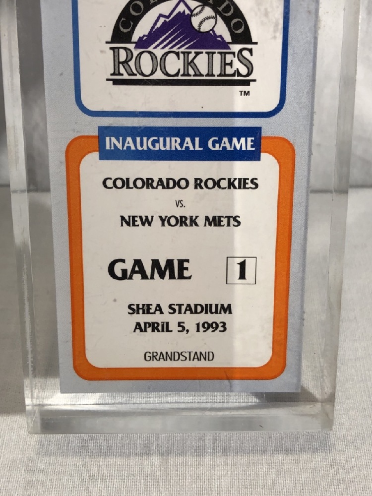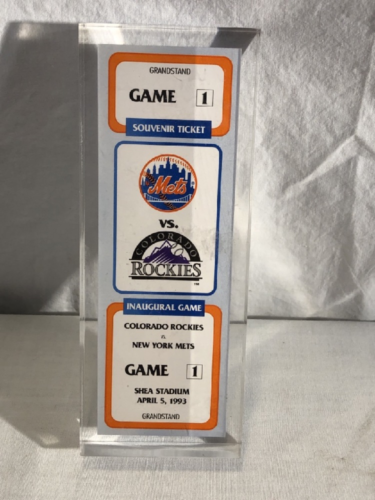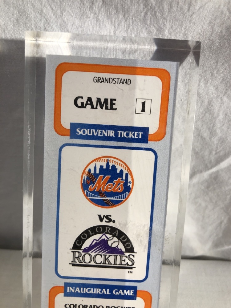 Inaugural Game 1 Mets Vs. Rockies Game Ticket Paperweight ~ The NL Expansion Colorado Rockies 1st ever Game at Shea Stadium - Lucite