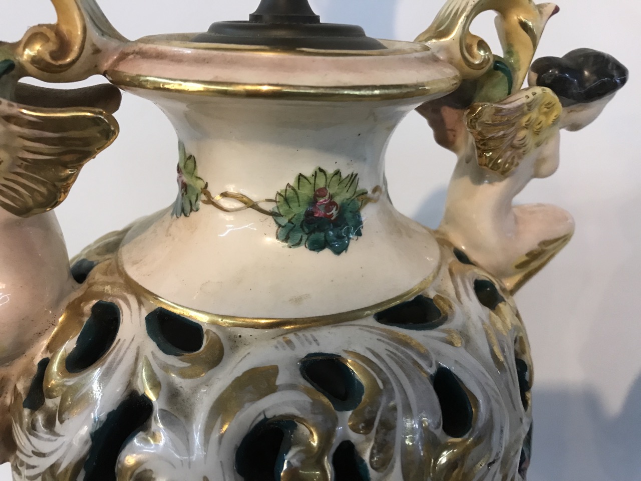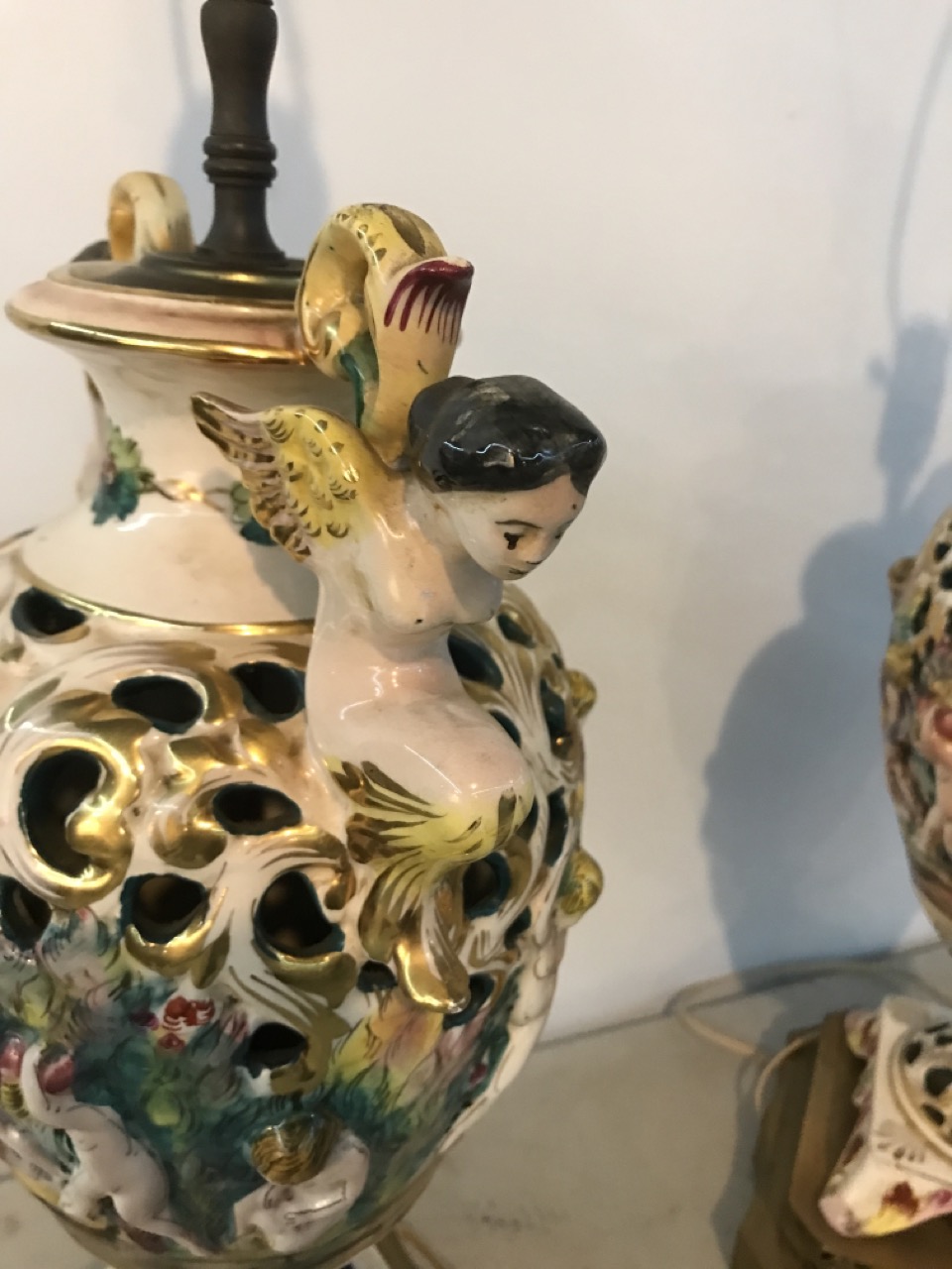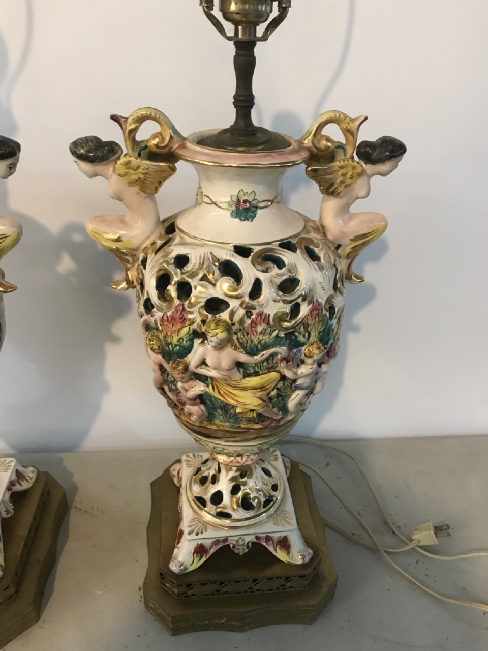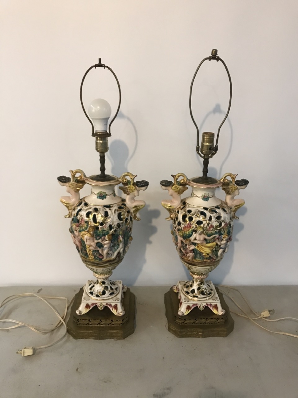 Pr. Antique Capodimonte Italian Cherubs Porcelain Lamps Signed on Brass Bases