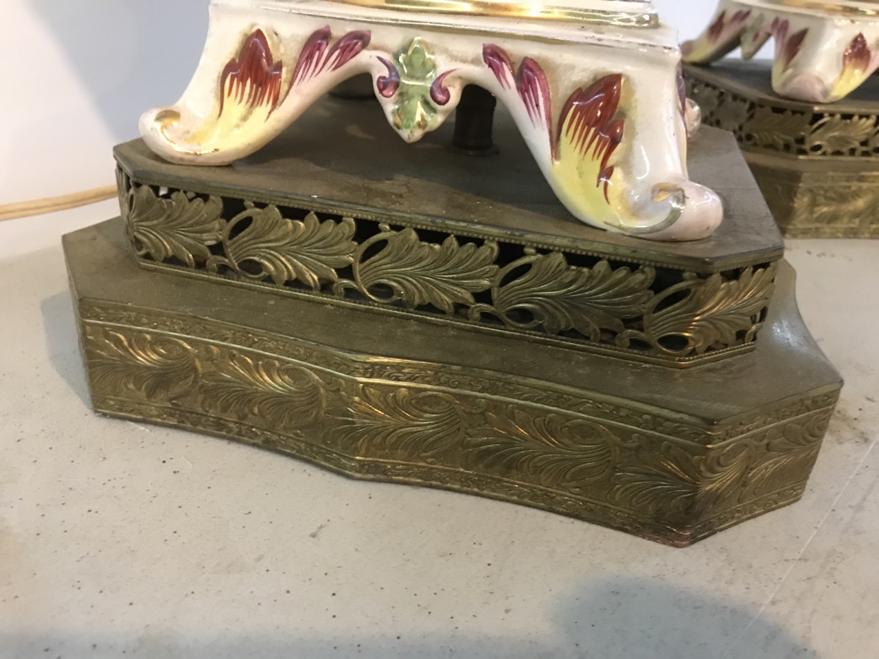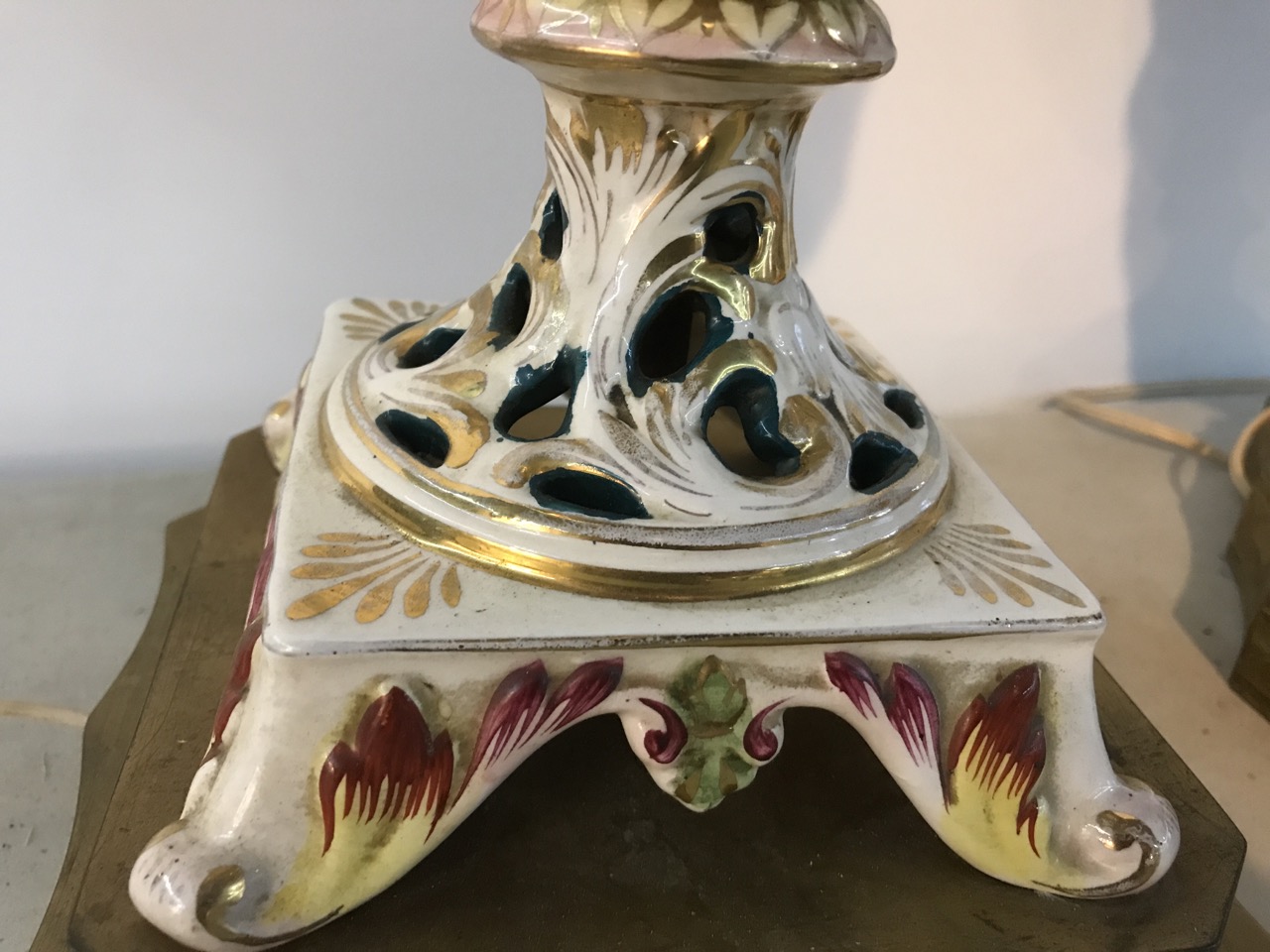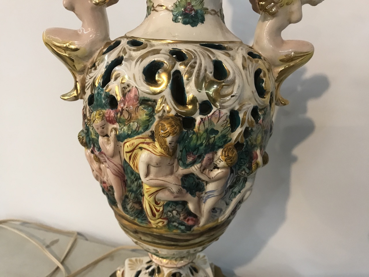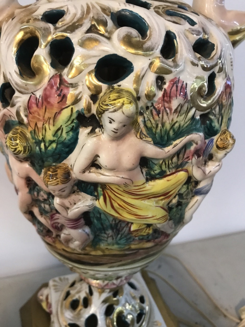 Pr. Antique Capodimonte Italian Cherubs Porcelain Lamps Signed on Brass Bases