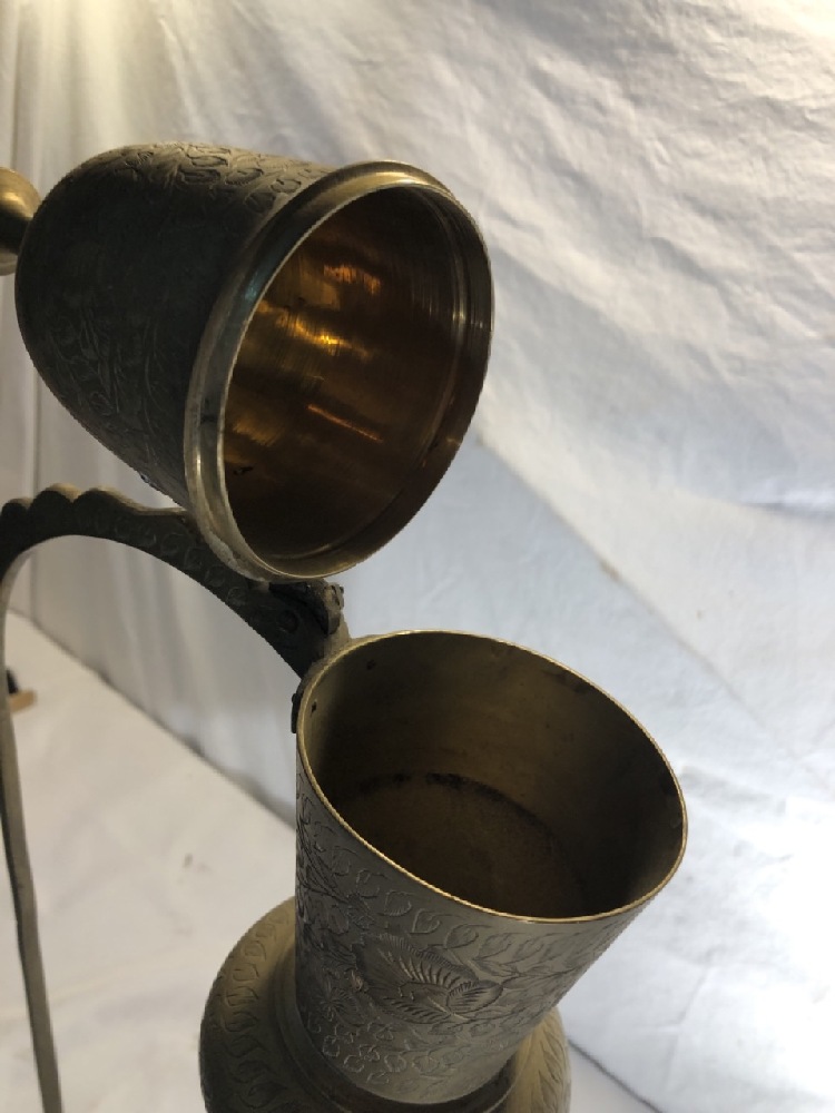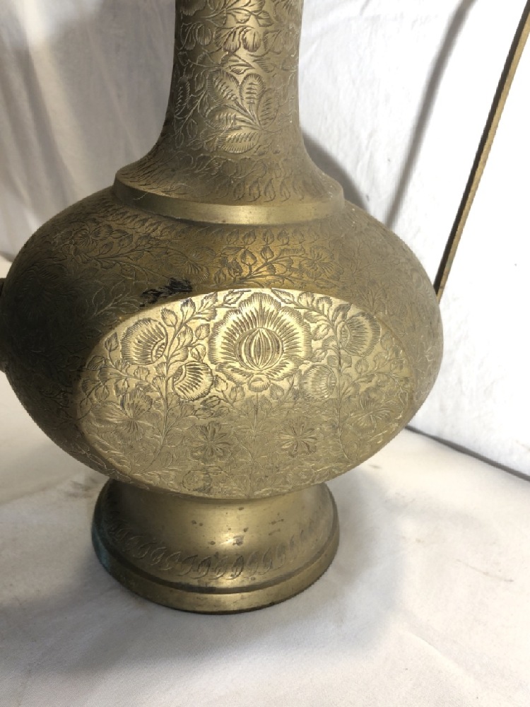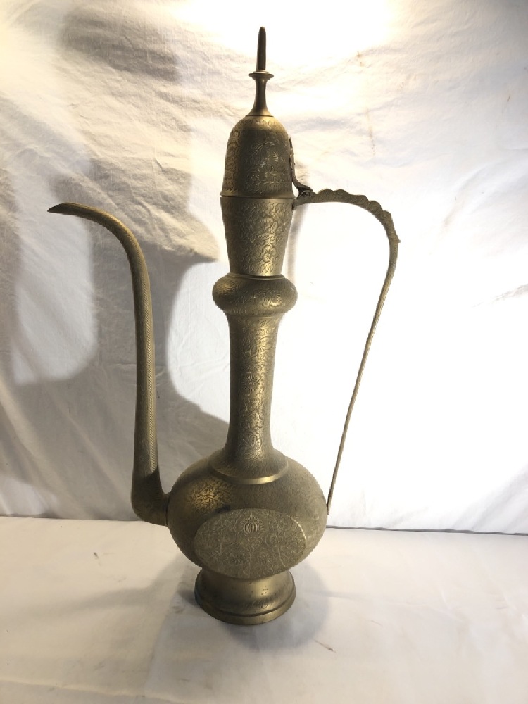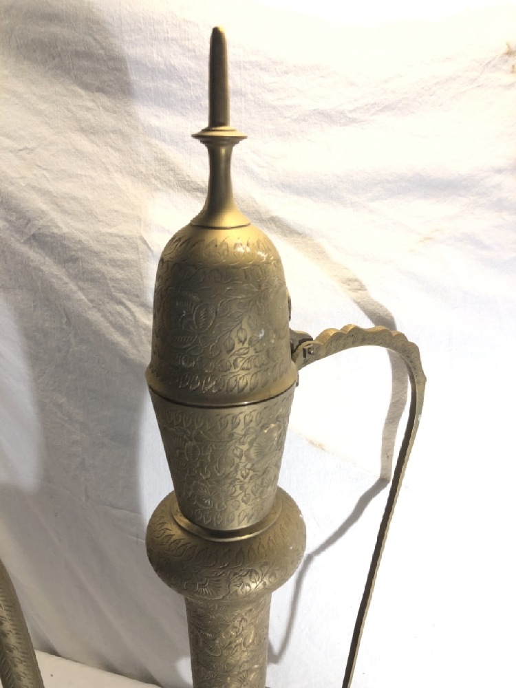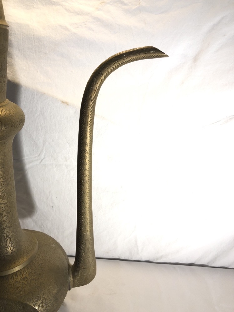 Vtg Tall Moorish Mughal Indian Brass Ewer- 27” T x 16” W from Spout To Handle
