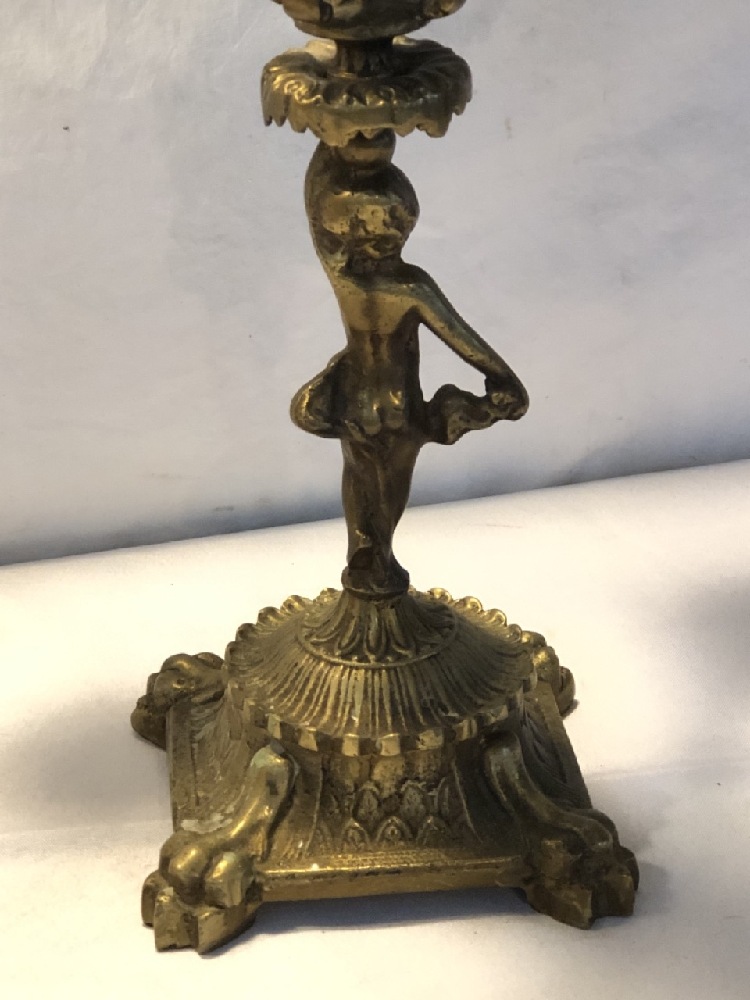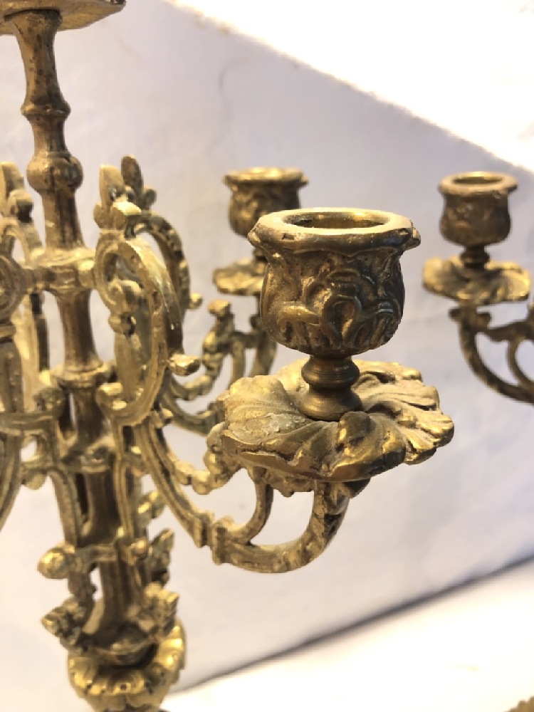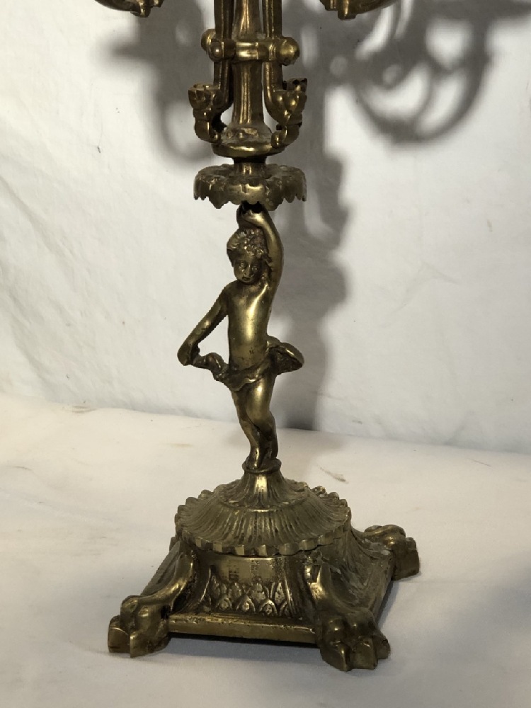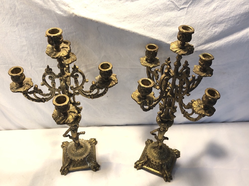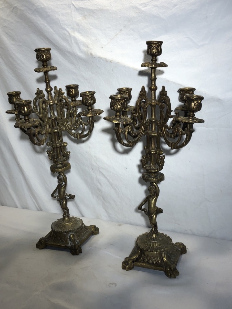Pr. Antique Brass 5 Arm Candelabras w/ Figural - 18” Tall