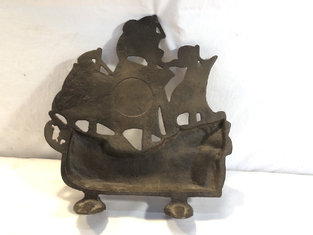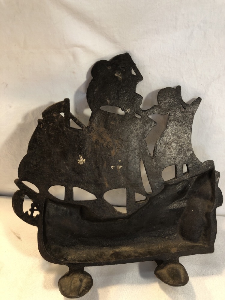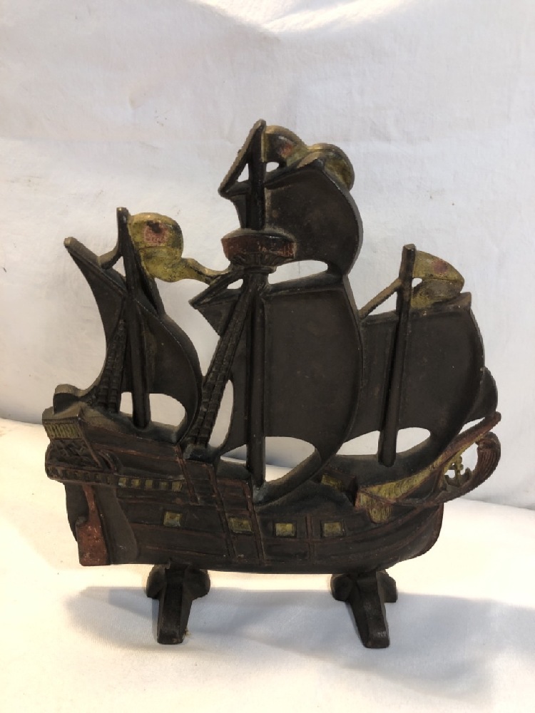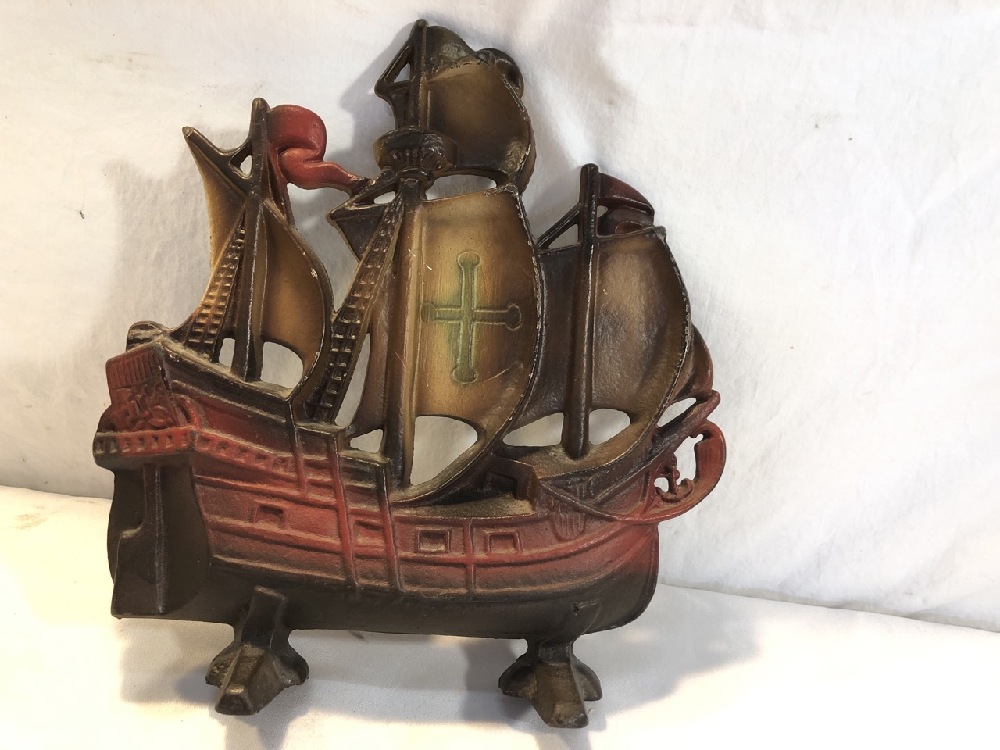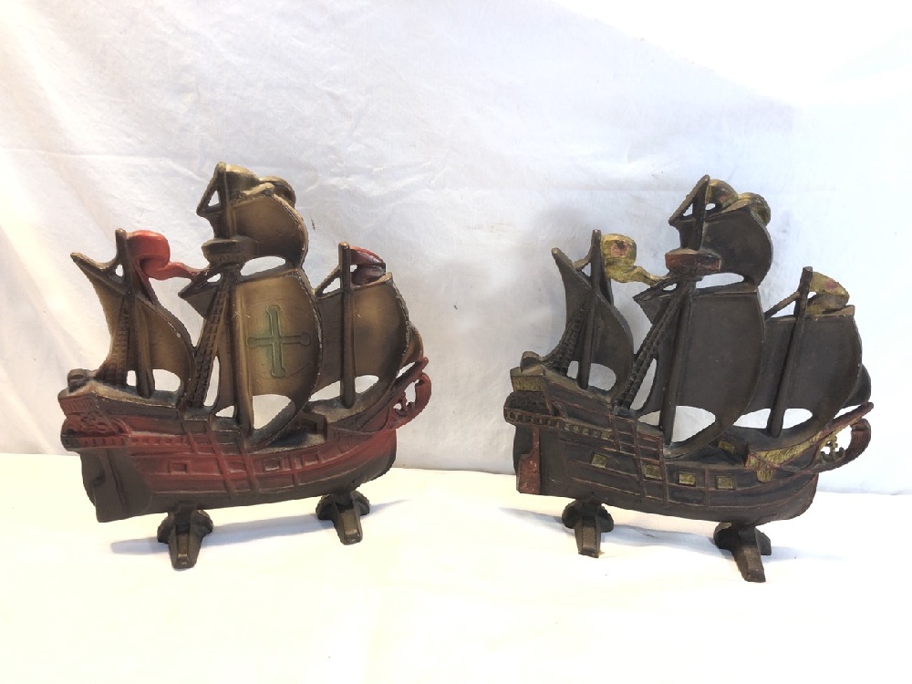 2- Antique Cast Iron Ship Door Stops including Galleon Cross Crusades- 11.5” T Each x 10.5” L Each