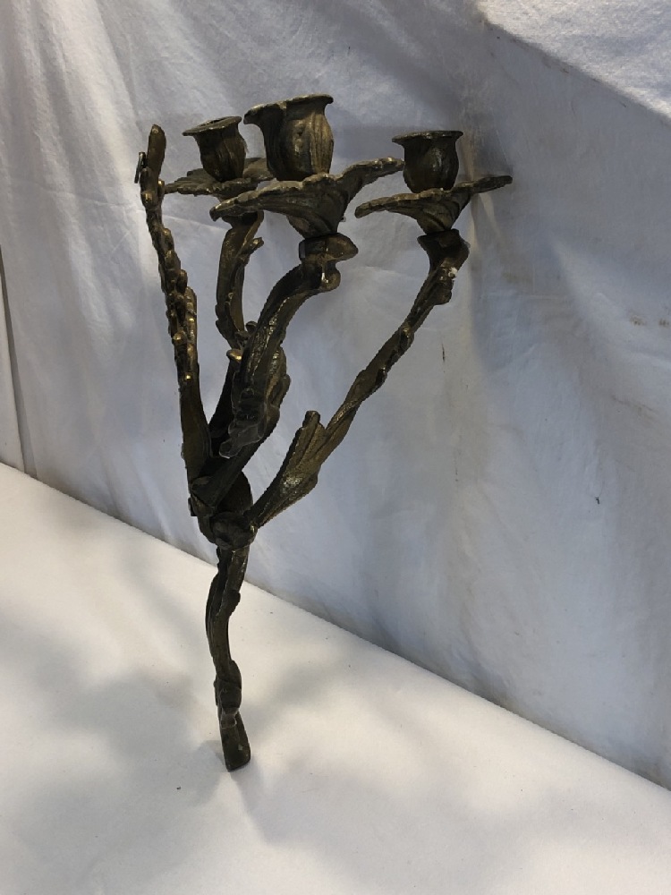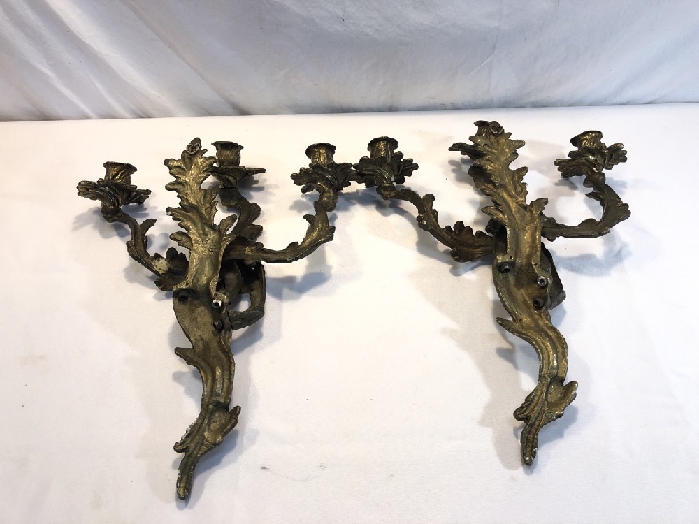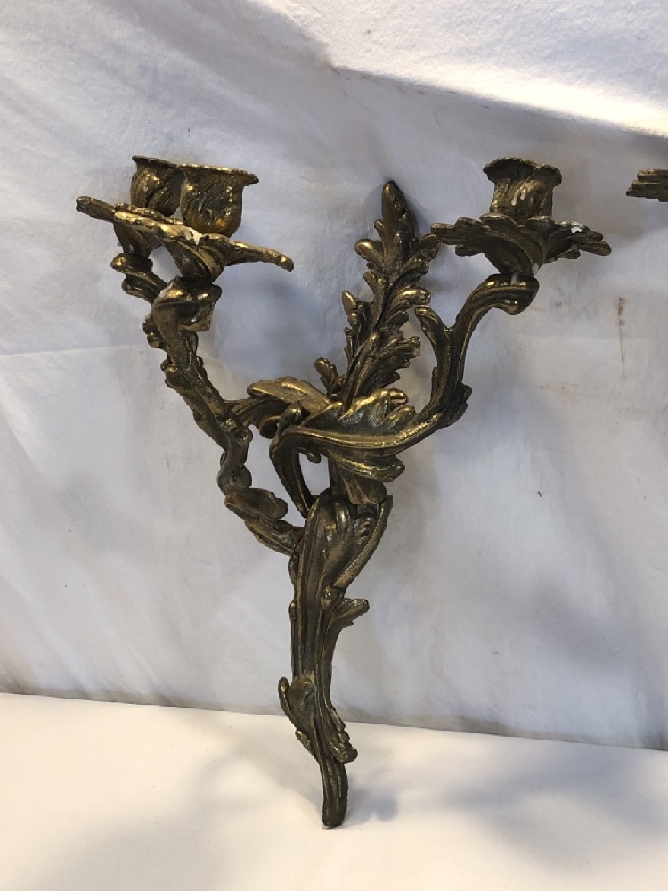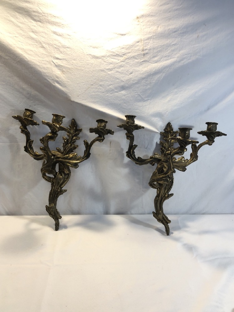 Pr. Gold Gilt Bronze/ Brass Rococo Style Sconces - 3 Arm Wall Hanging- 15” Tall x 14” Wide