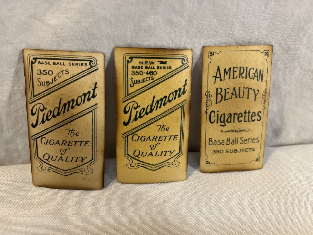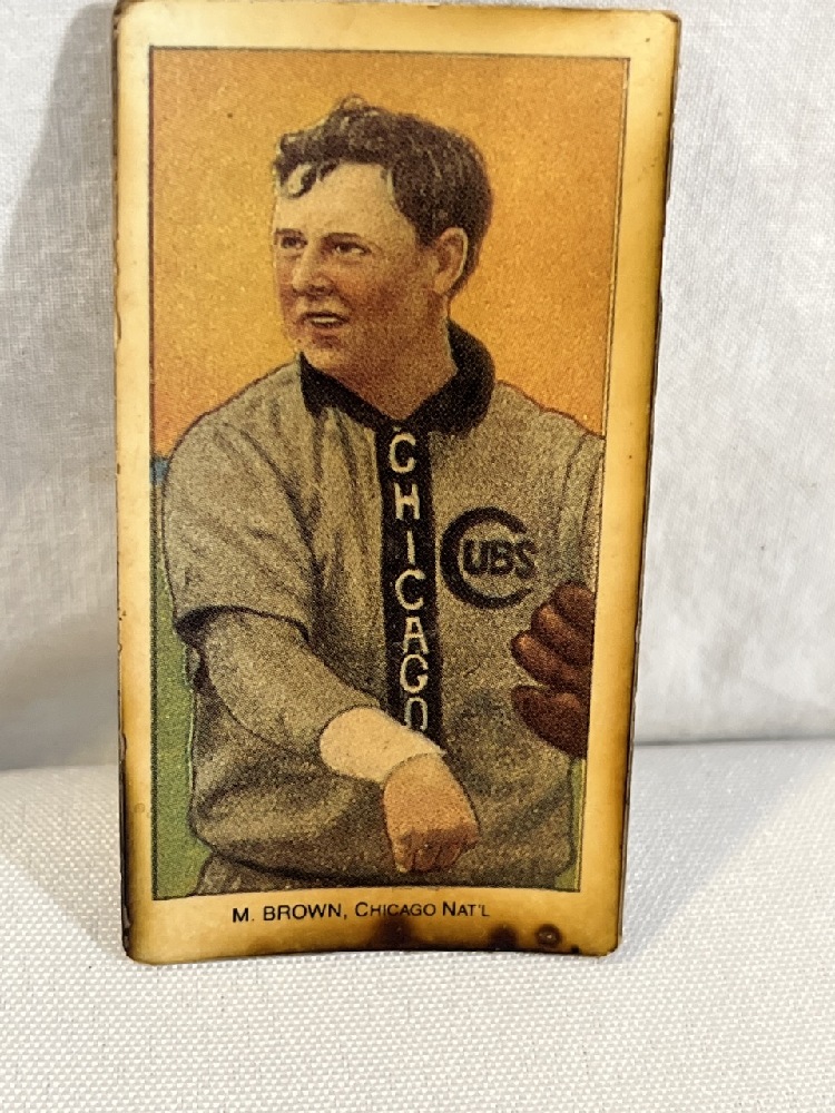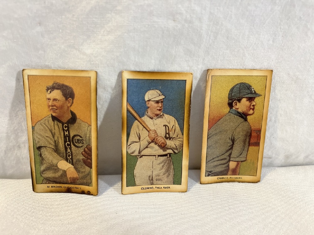 Three Antique Tobacco Cards / Piedmont Baseball Stamps - M. Brown “3 Finger Brown”, Camnitz and Rube Oldring