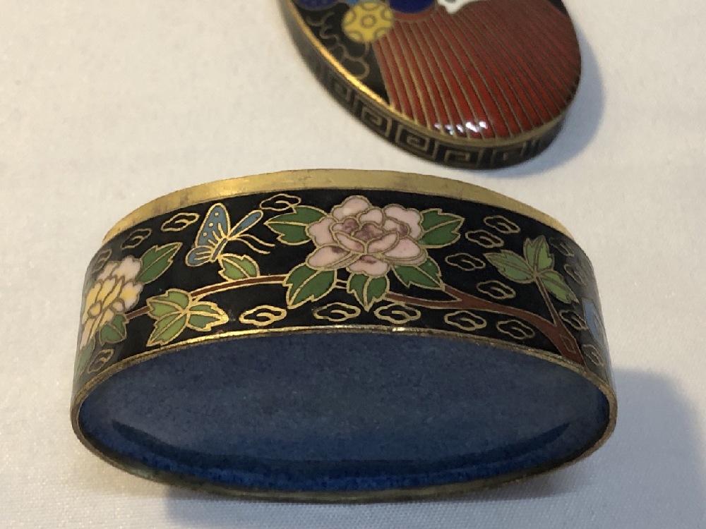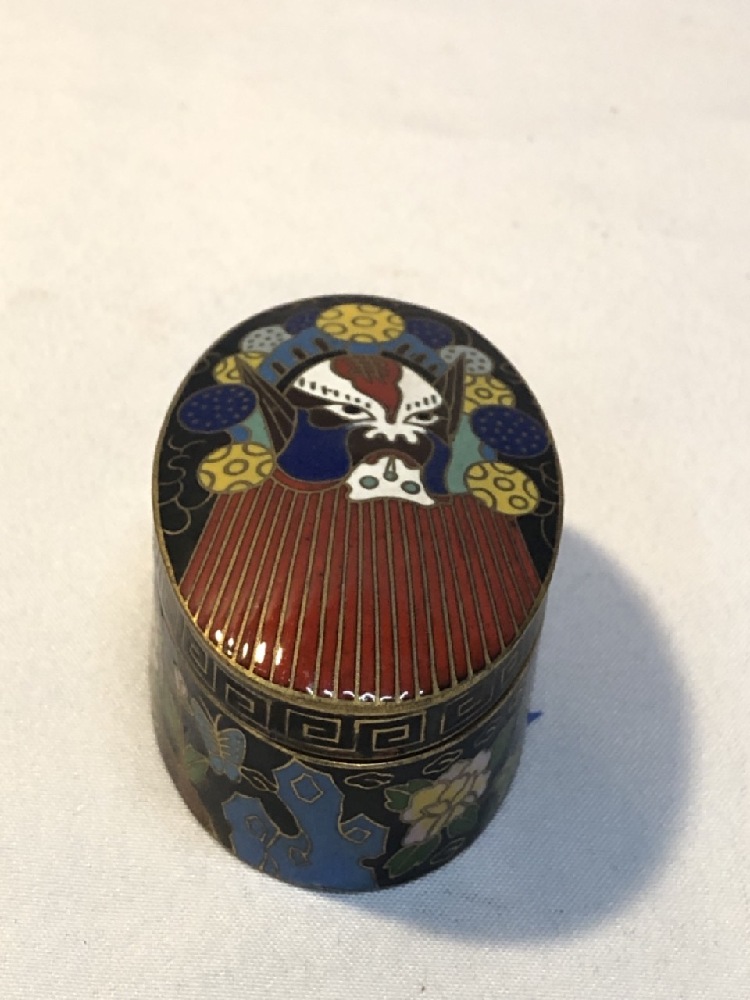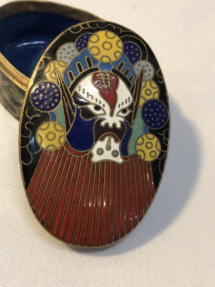 Rare Vtg Cloisonne Chinese Peking Opera Trinket Box~ Enamel Culture Mask~ 3” x 2” x 1 1/4” T