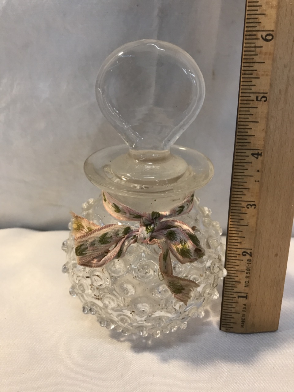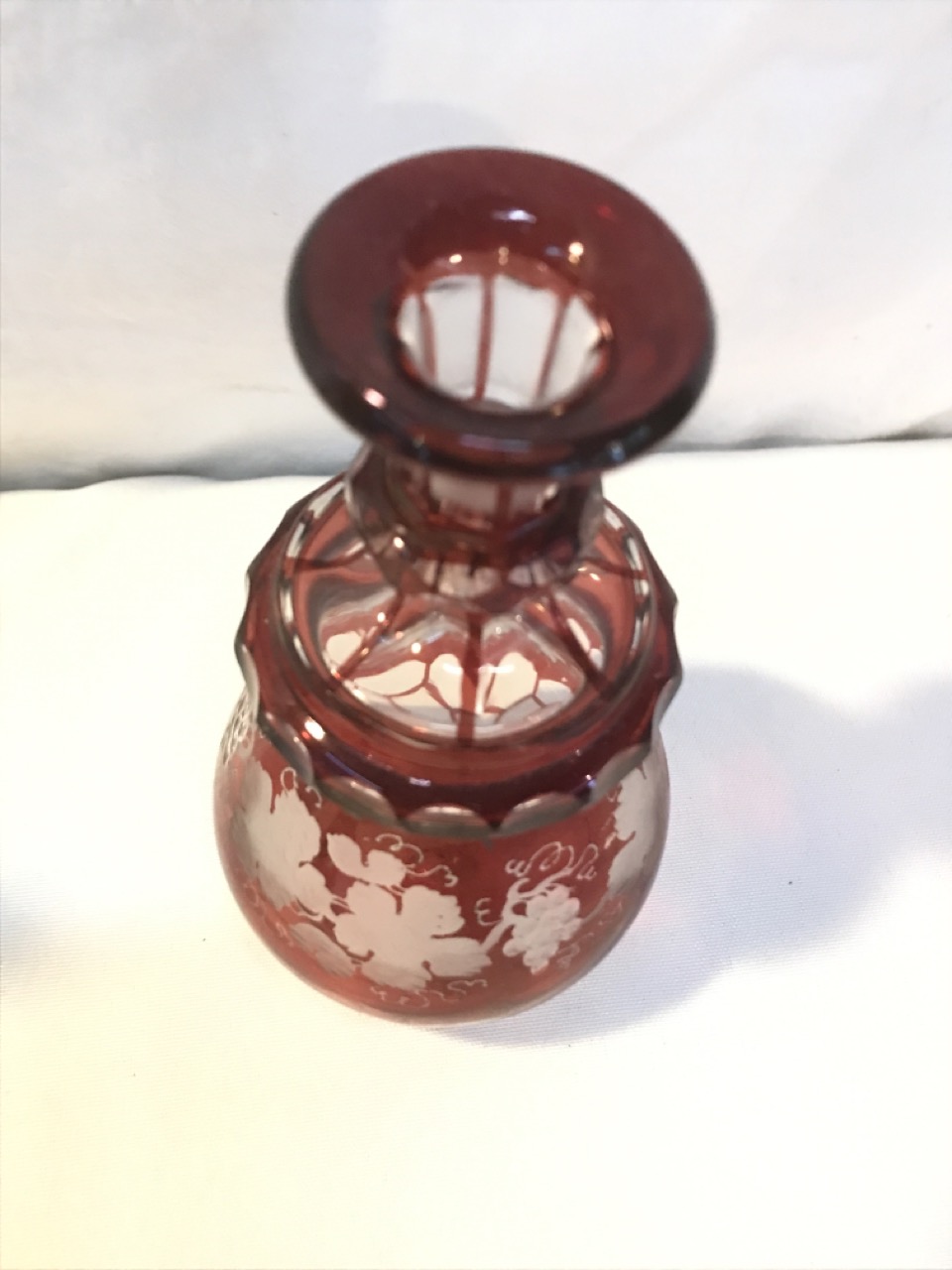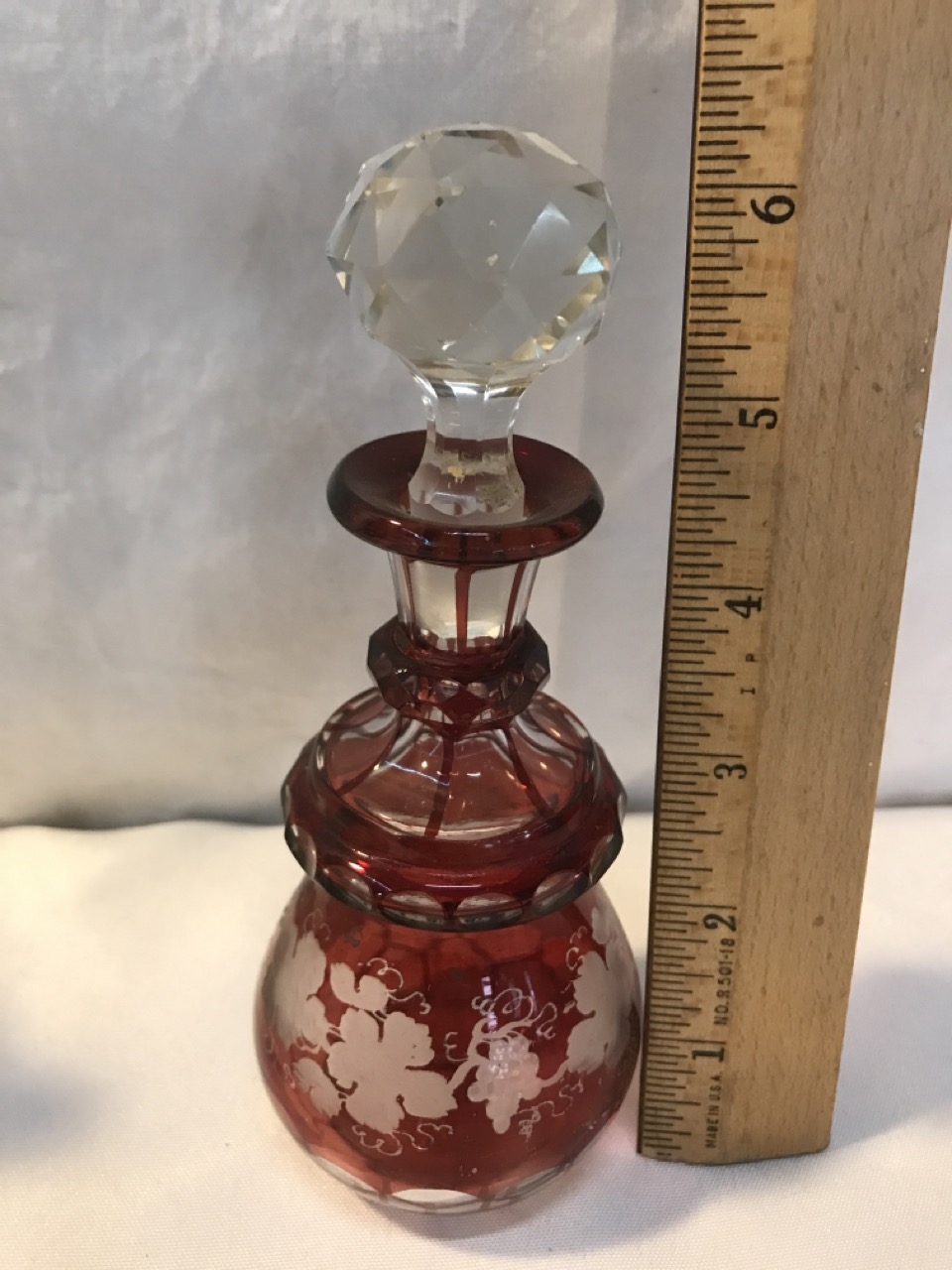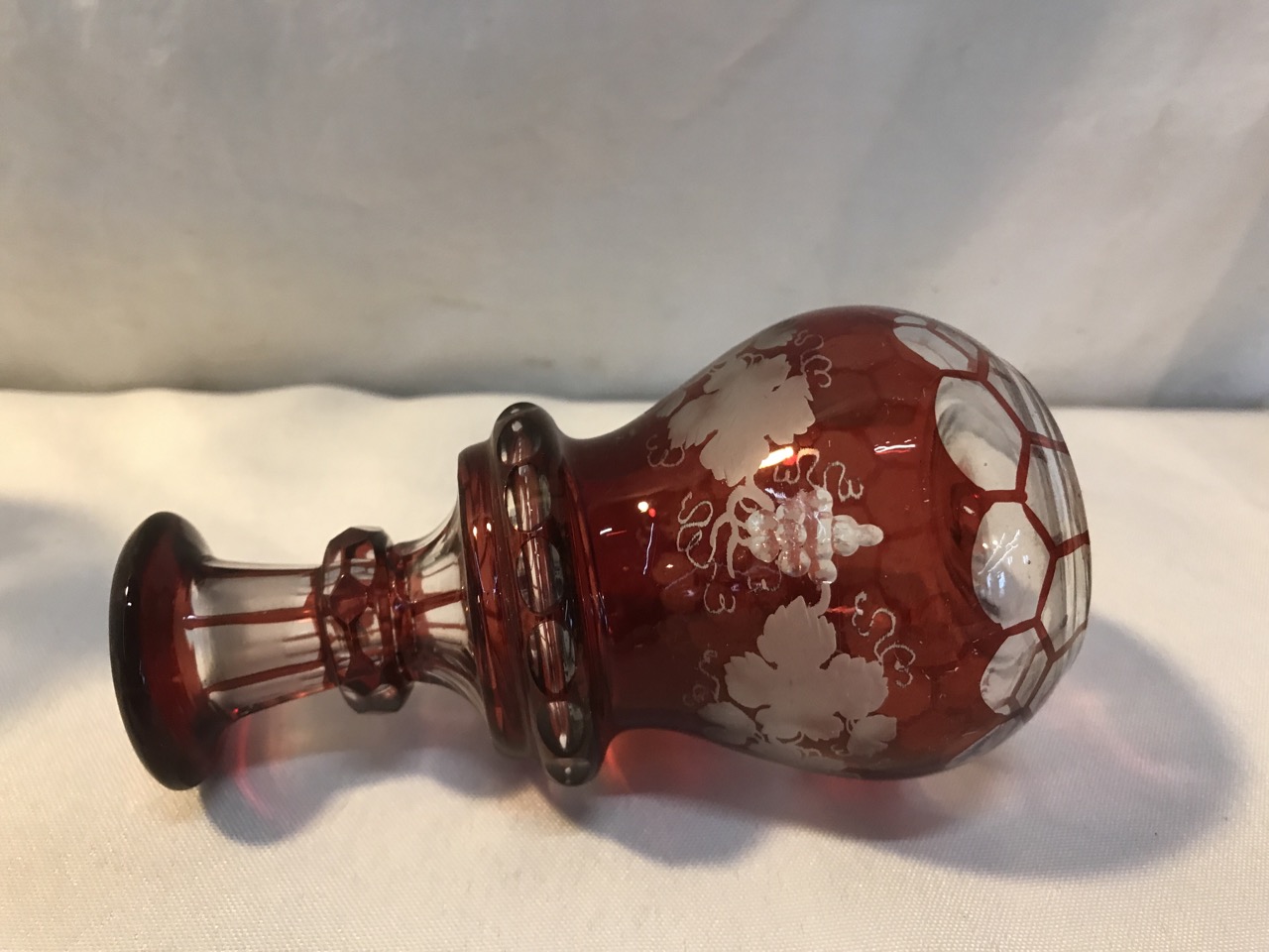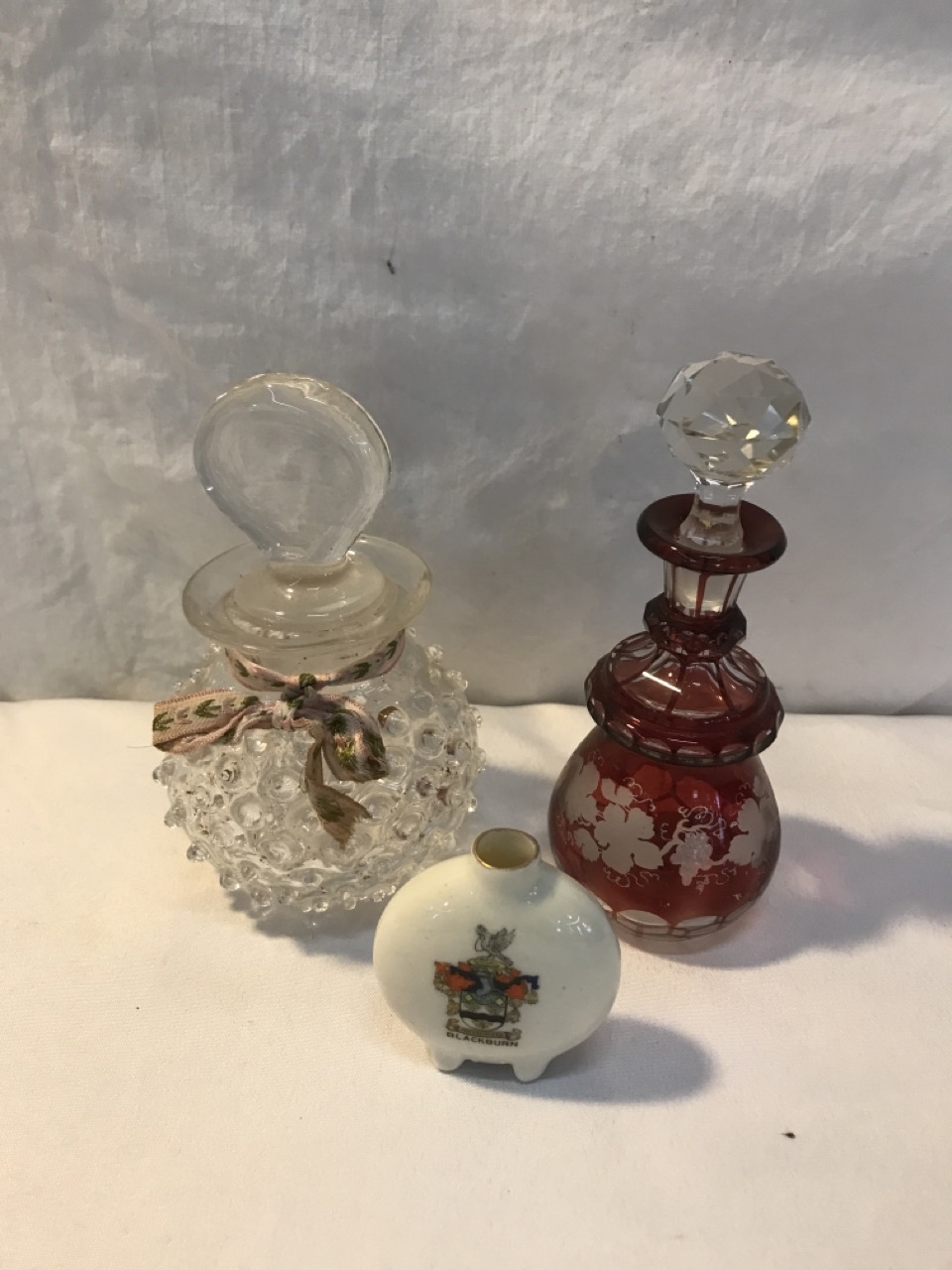 Vtg Bottles including Bohemian Cranberry Etched & Cut Crystal Colonge Bottle, Hobnail Bottle W/ Glass Stopper, & Shelley Porcelain Crest Blackburn 1 Stem Souvenir vase