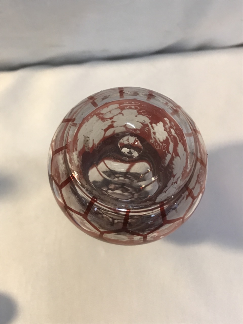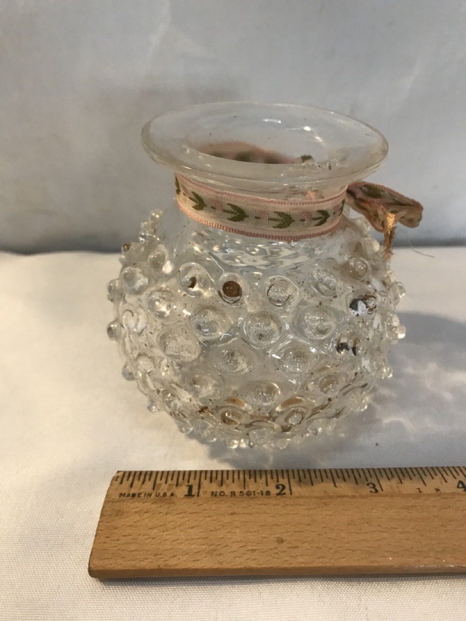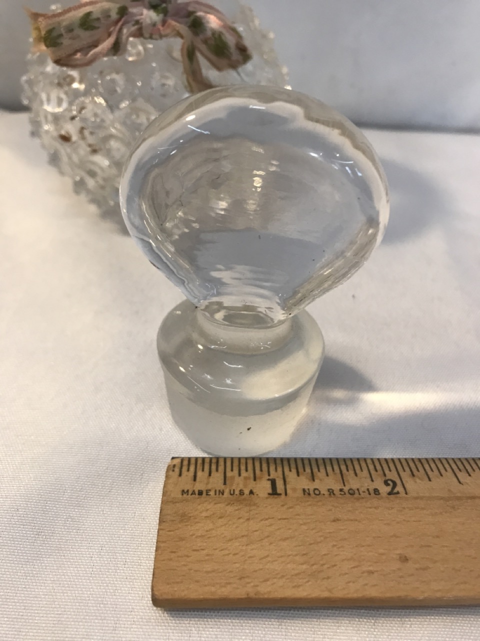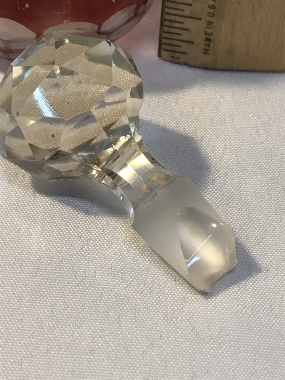 Vtg Bottles including Bohemian Cranberry Etched & Cut Crystal Colonge Bottle, Hobnail Bottle W/ Glass Stopper, & Shelley Porcelain Crest Blackburn 1 Stem Souvenir vase