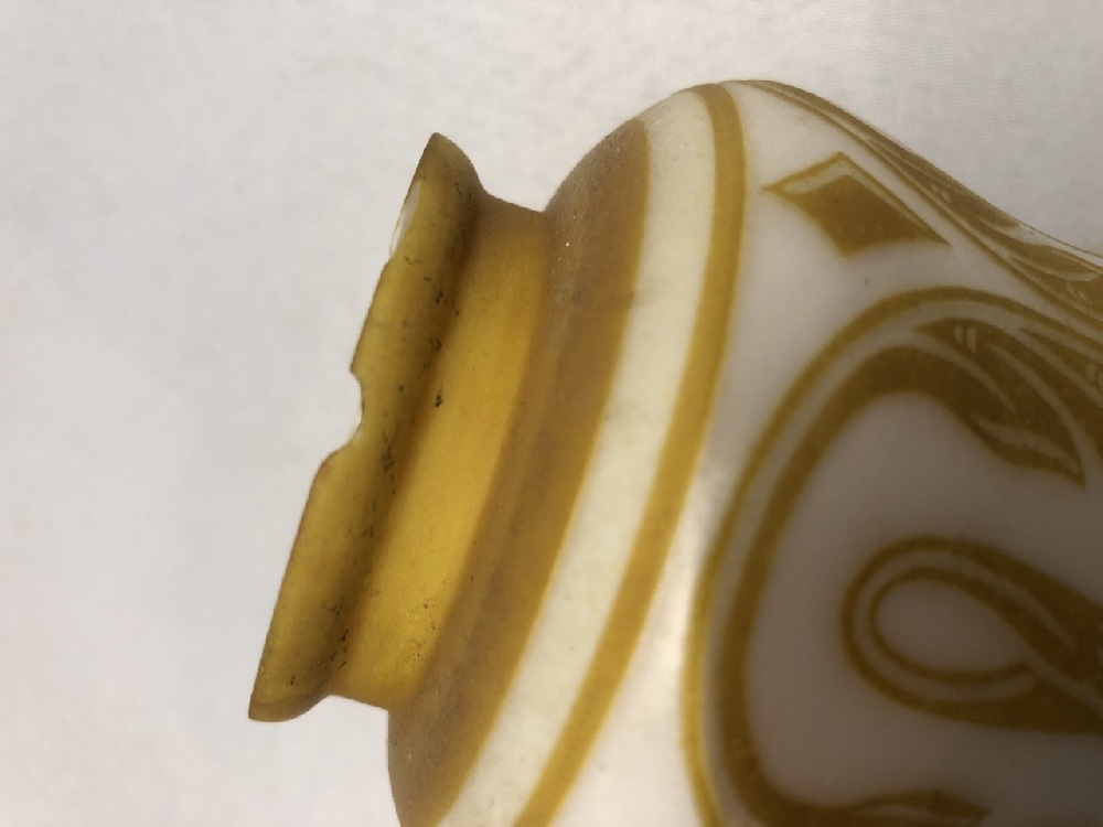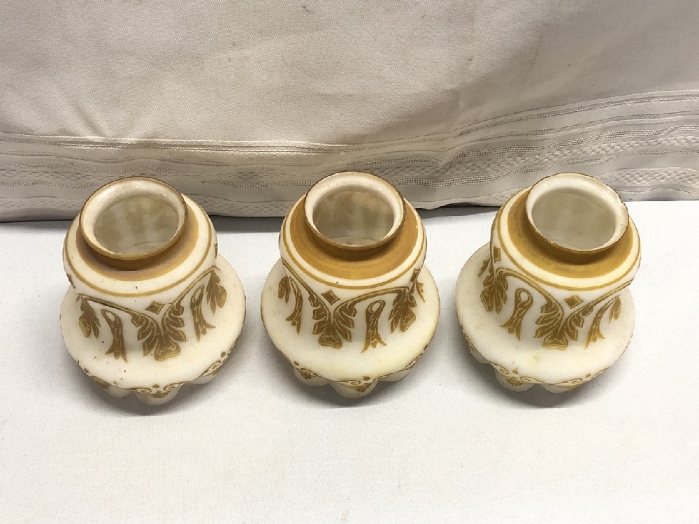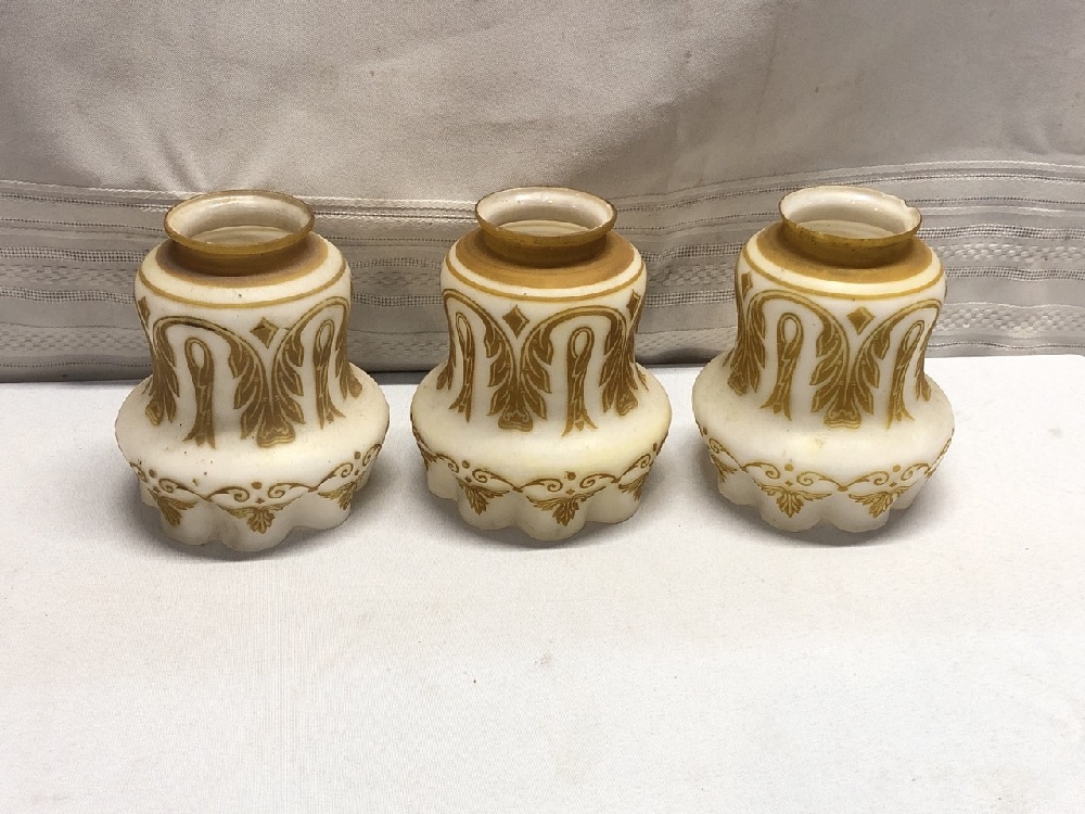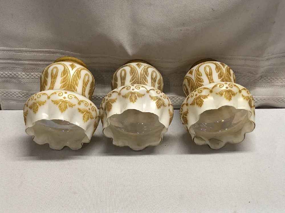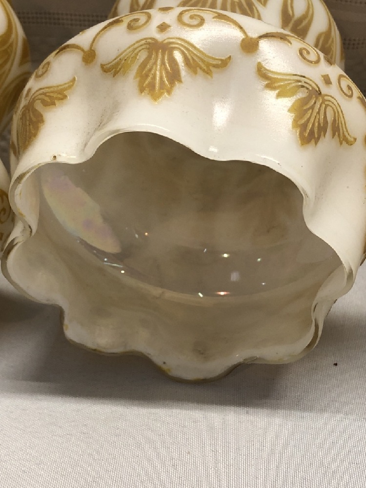 3 Vintage Glass Shades - 5 1/4” Tall- Opalescent Frosted w/ Gold Design / Ruffle bottom