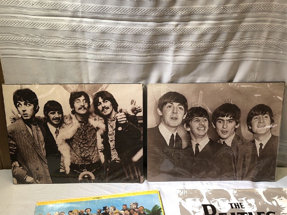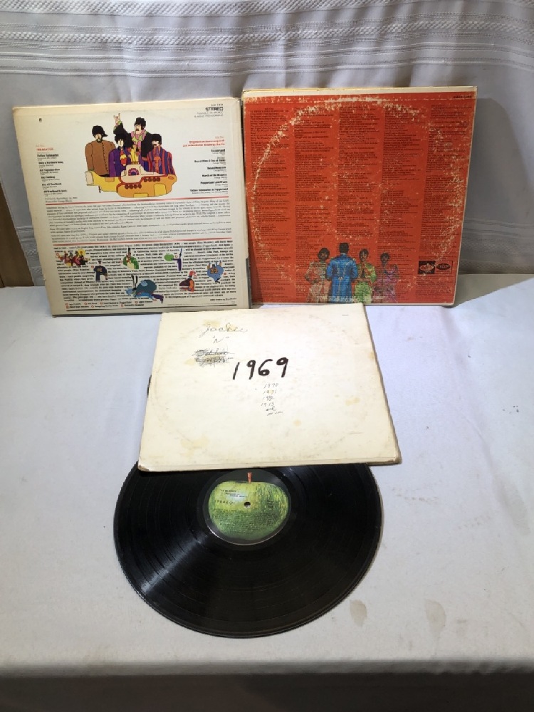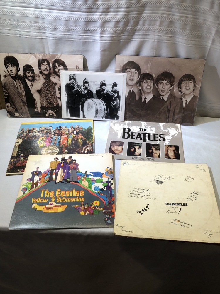 Beatles LPs ( Yellow Submarine, Lonely Hearts and White Album) , 3 Posters ( 2) 11” x 14” and 1) 8 x10) and 1997 Calendar