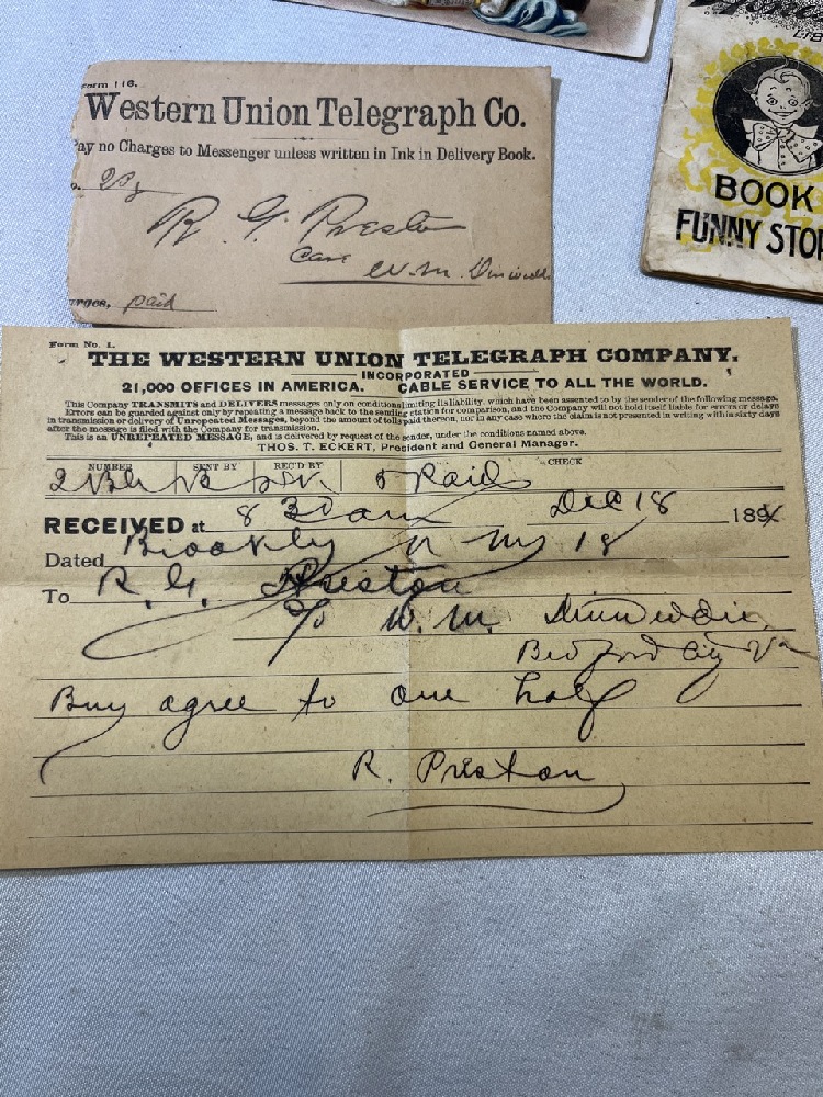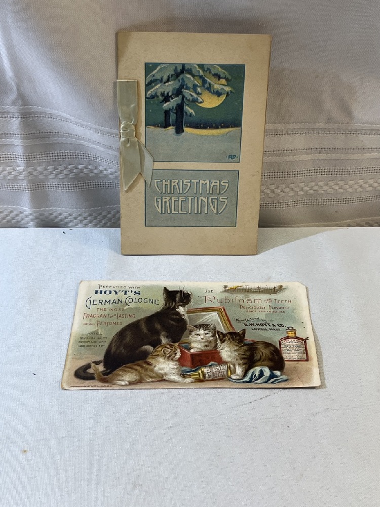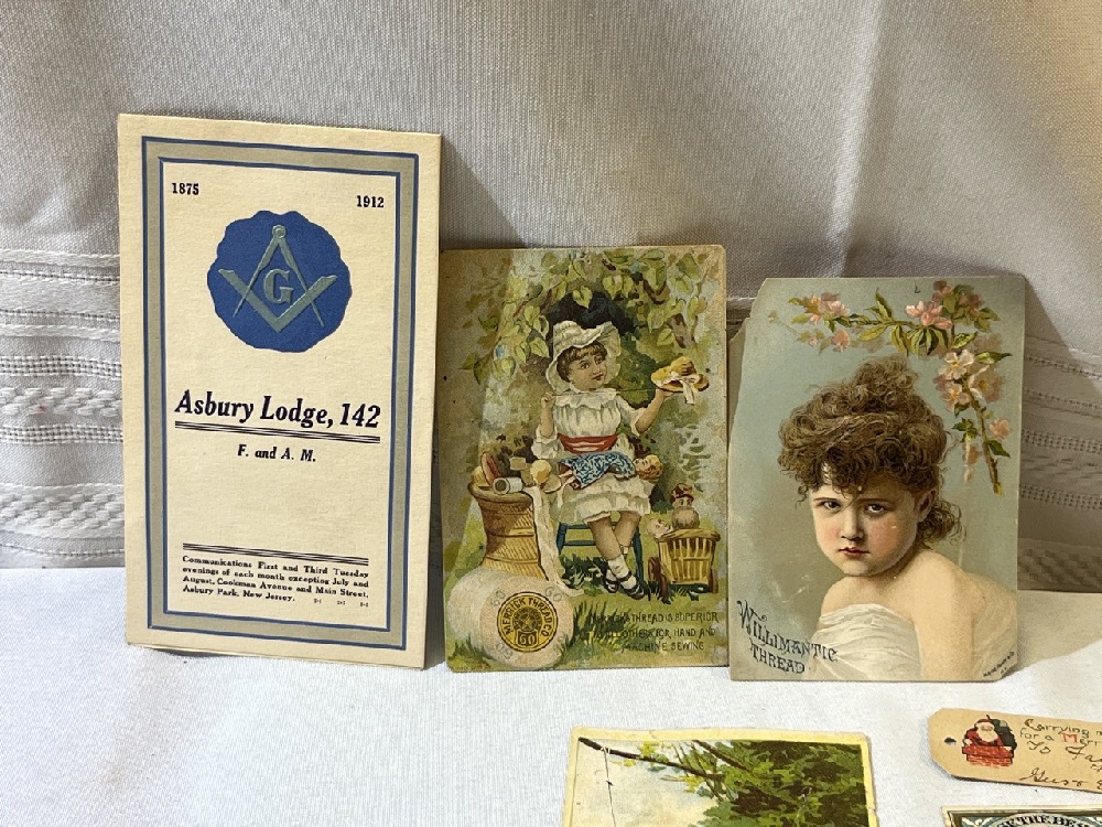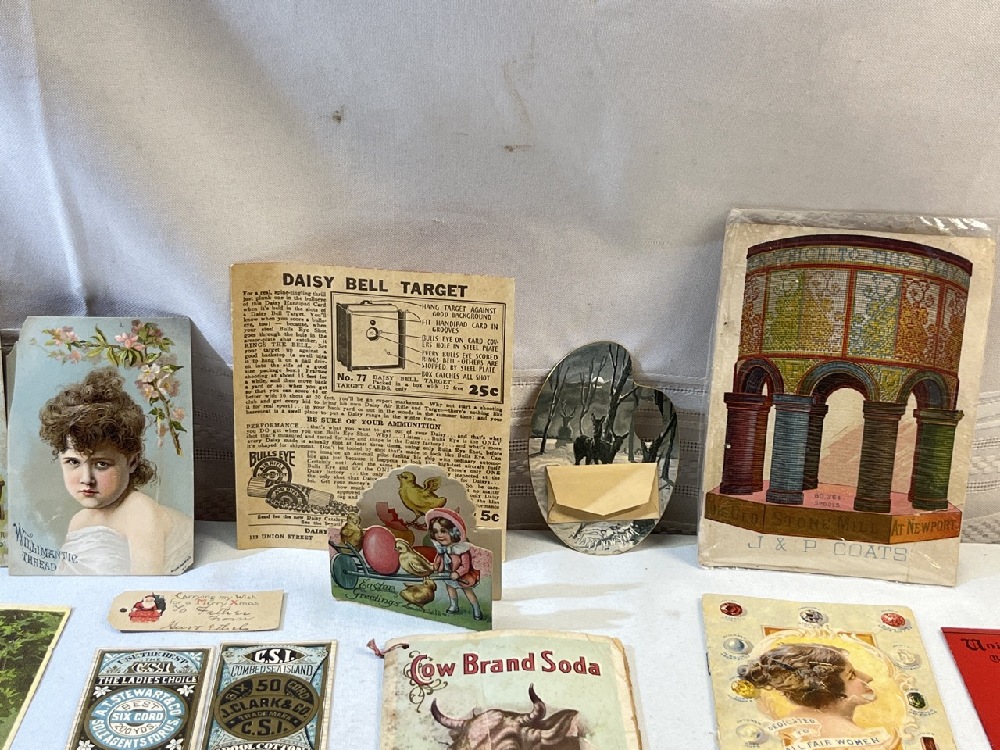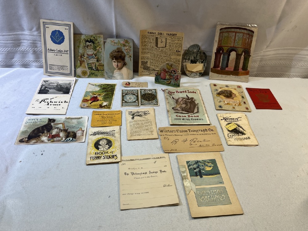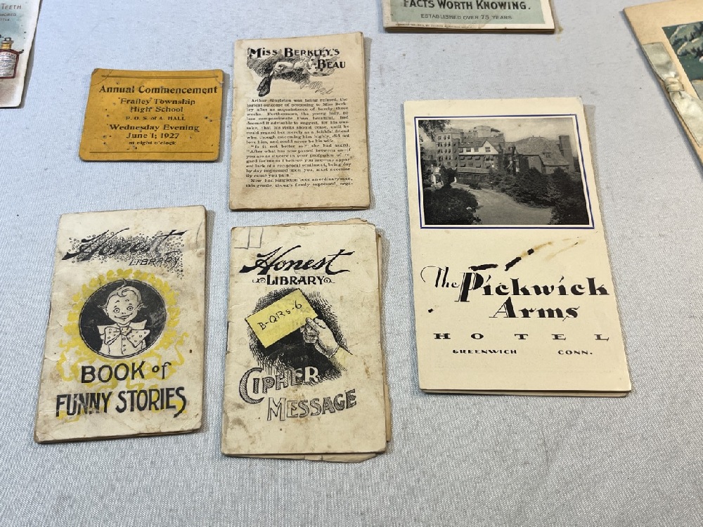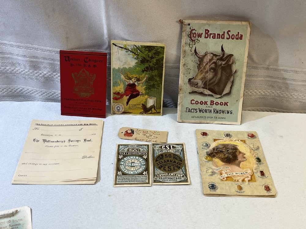Vtg. Advertising Including Cow Brand Soda Cookbook, Honest Library Book of Funny Stories/ Cipher Message , greeting Cards, Merrick Thread Co. and More
