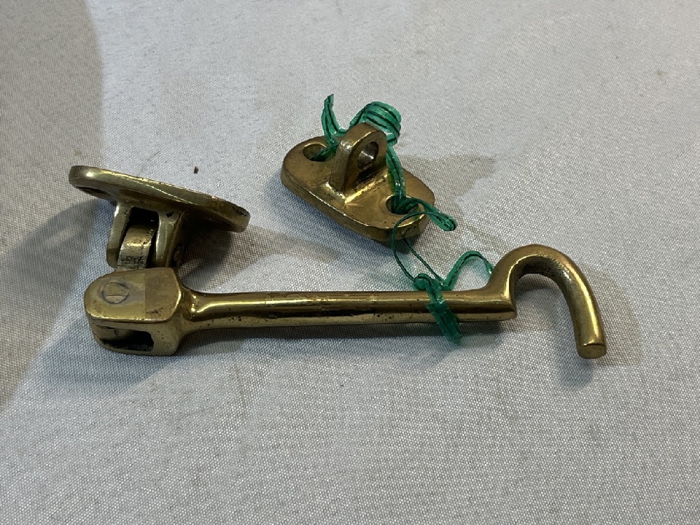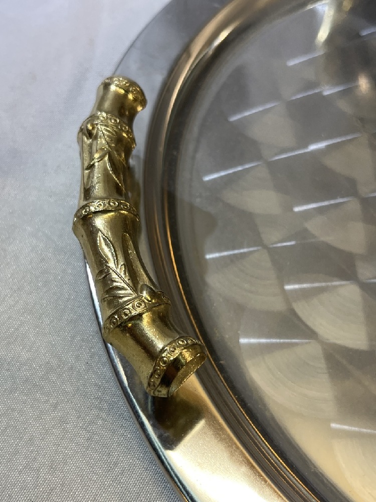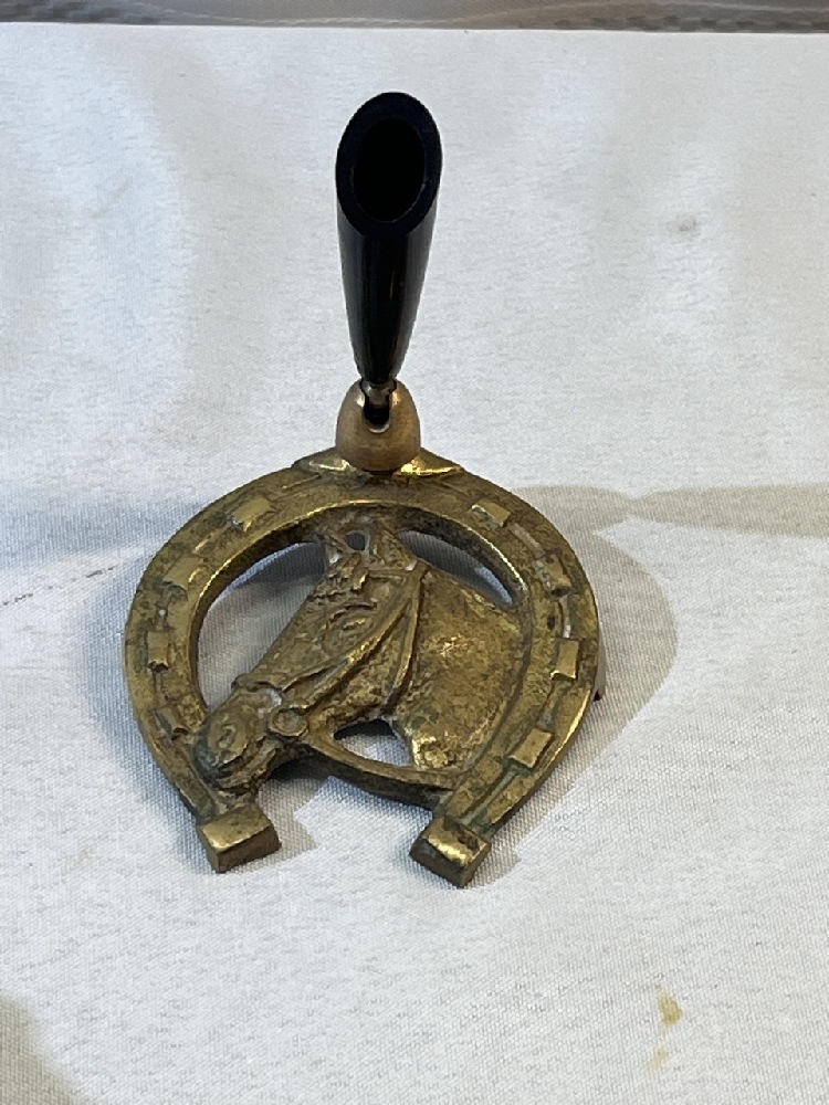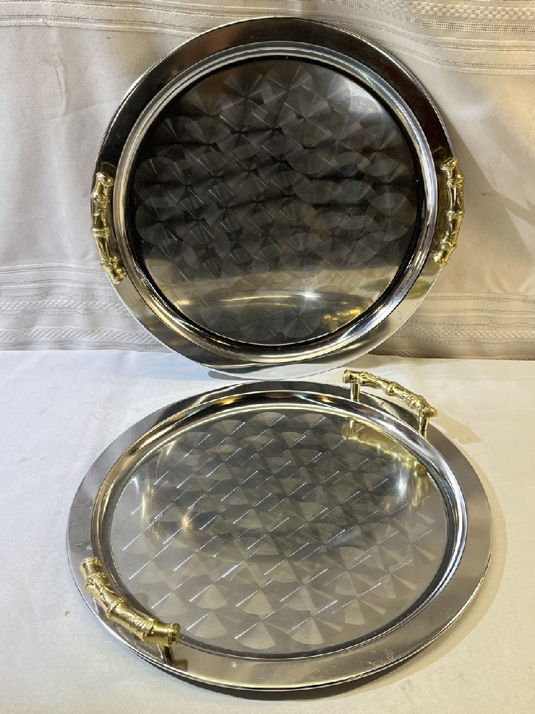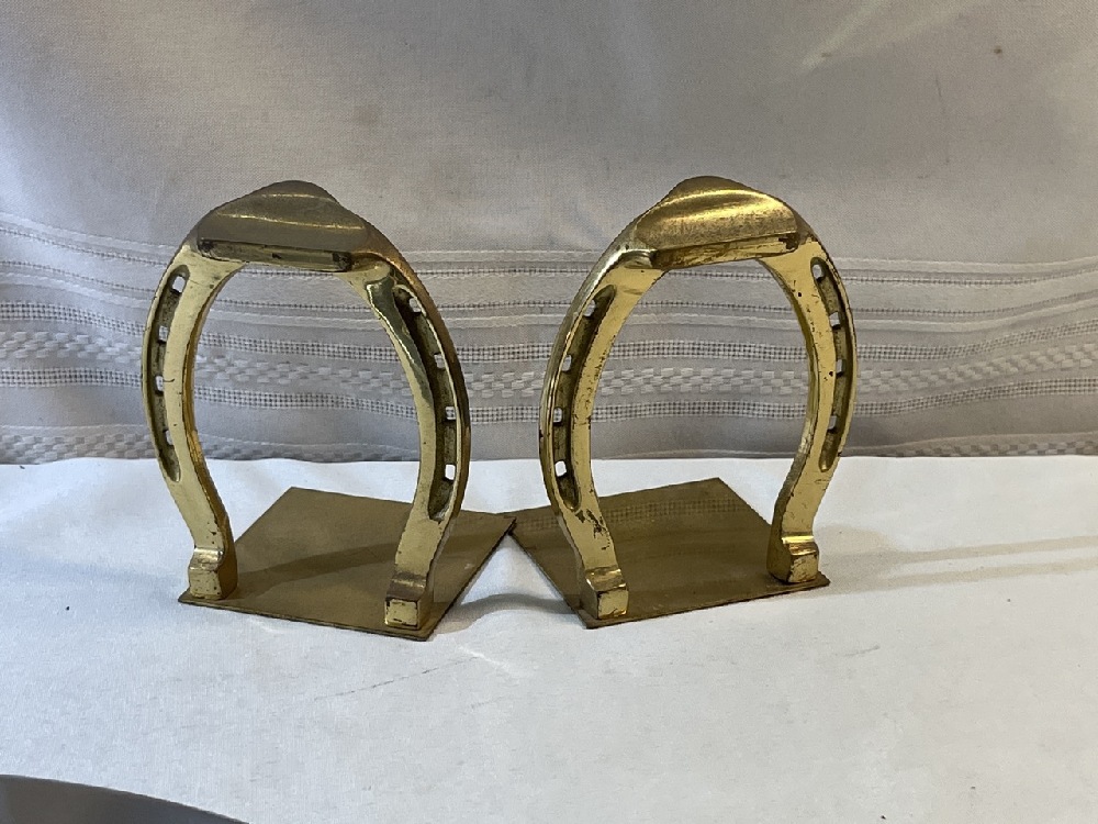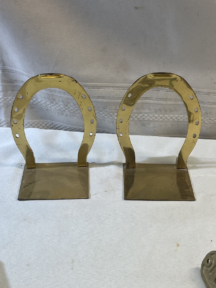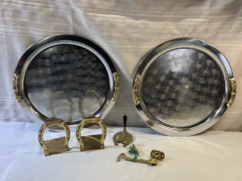 2 Stainless Trays with Brass Handles ( 13 1/2” round) , Horseshoe Brass Book Ends, Horseshoe / Horse Pen Holder and Door Latch