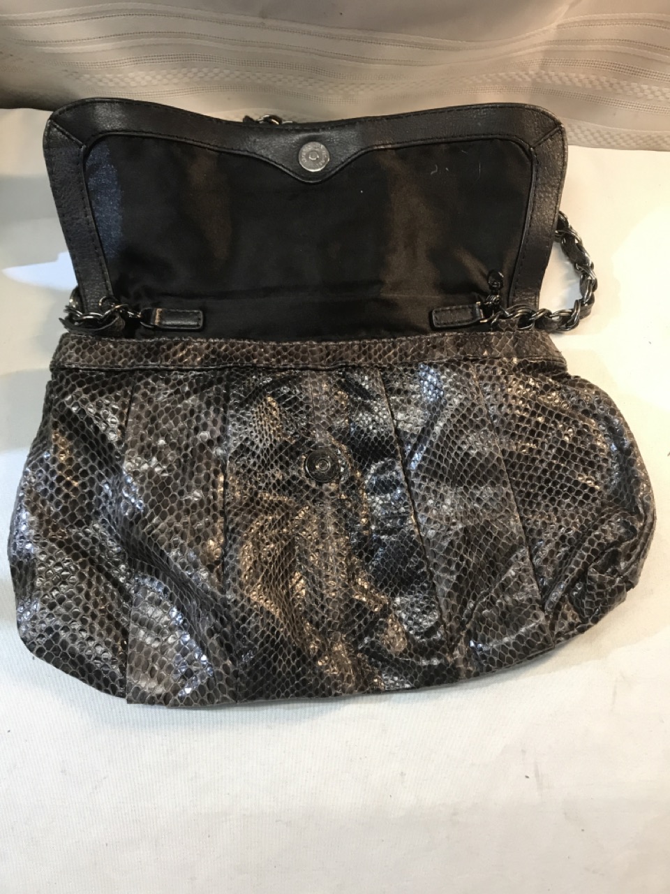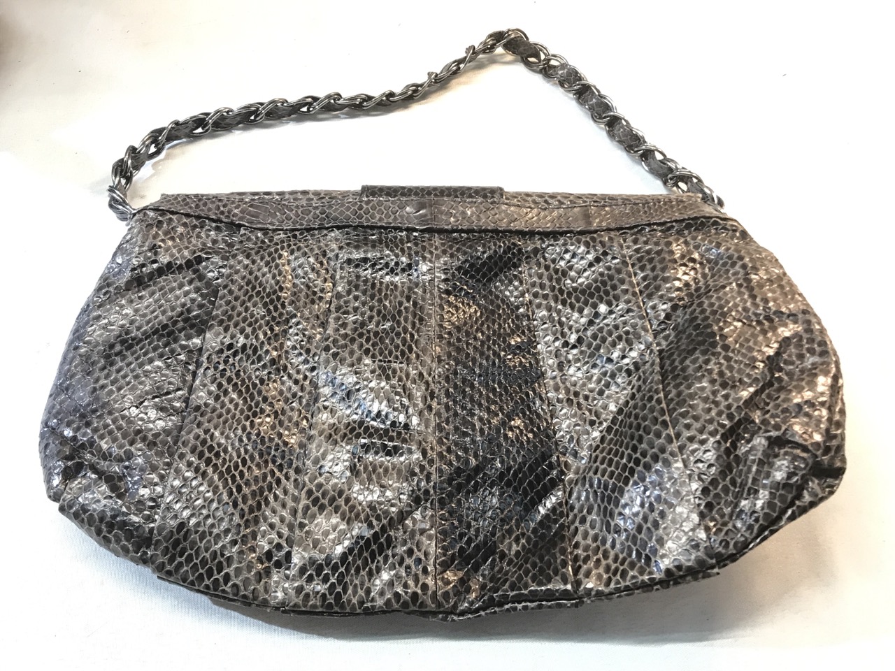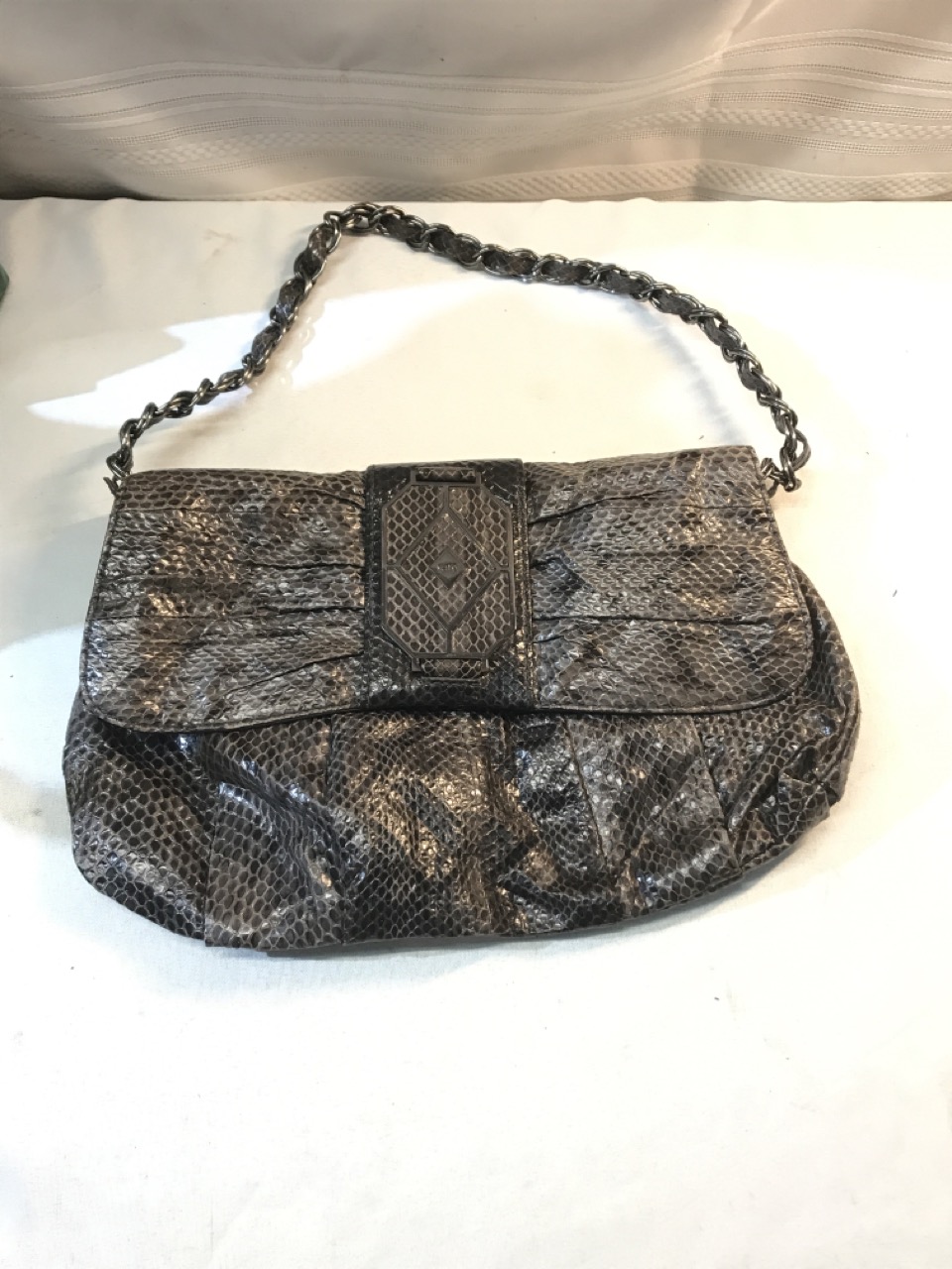 Vtg. Rafe' Snake Print Patent Leather Flap Chain Shoulder Bag - 13” x 9”