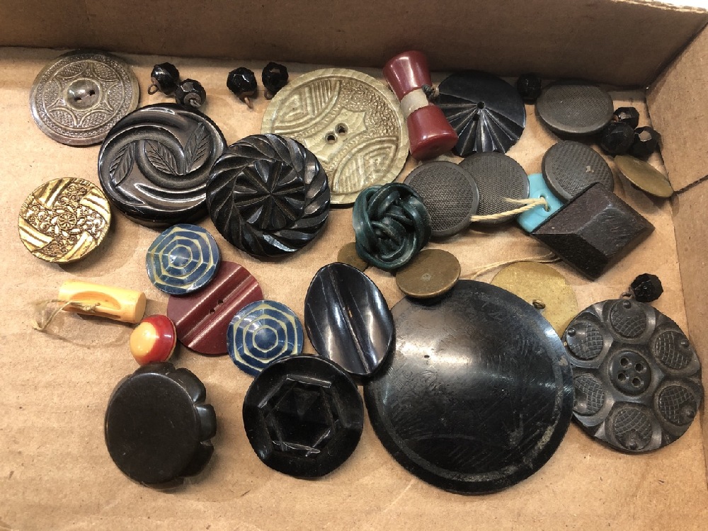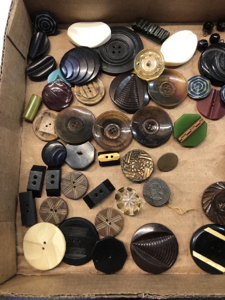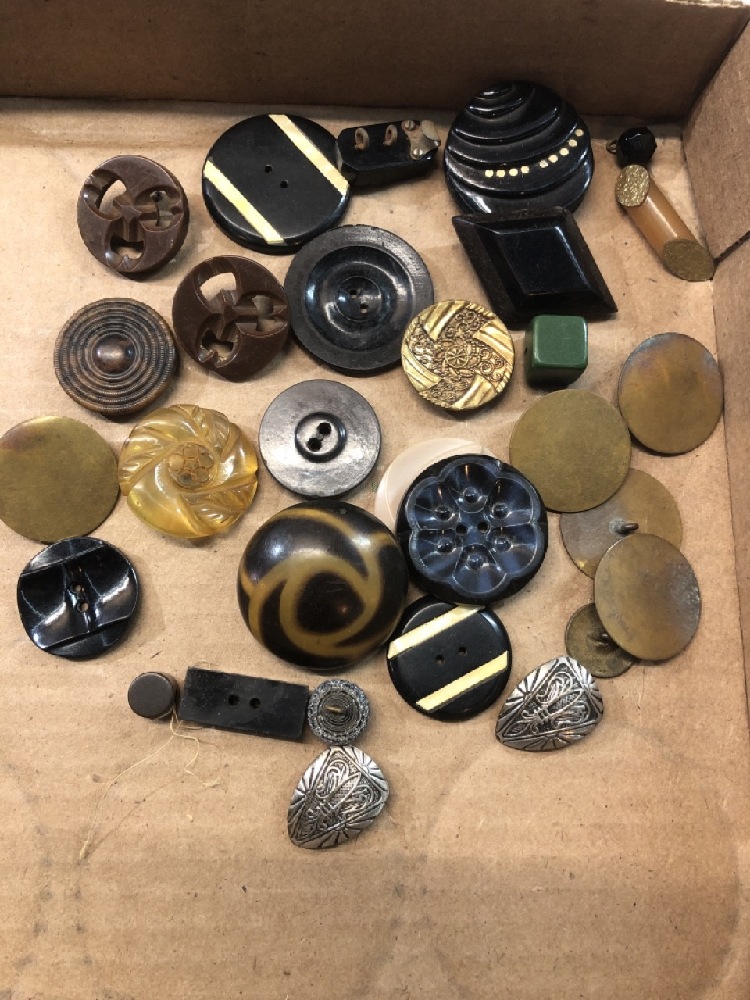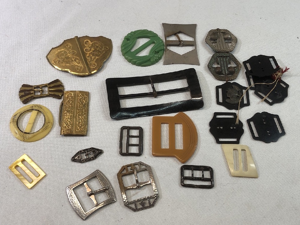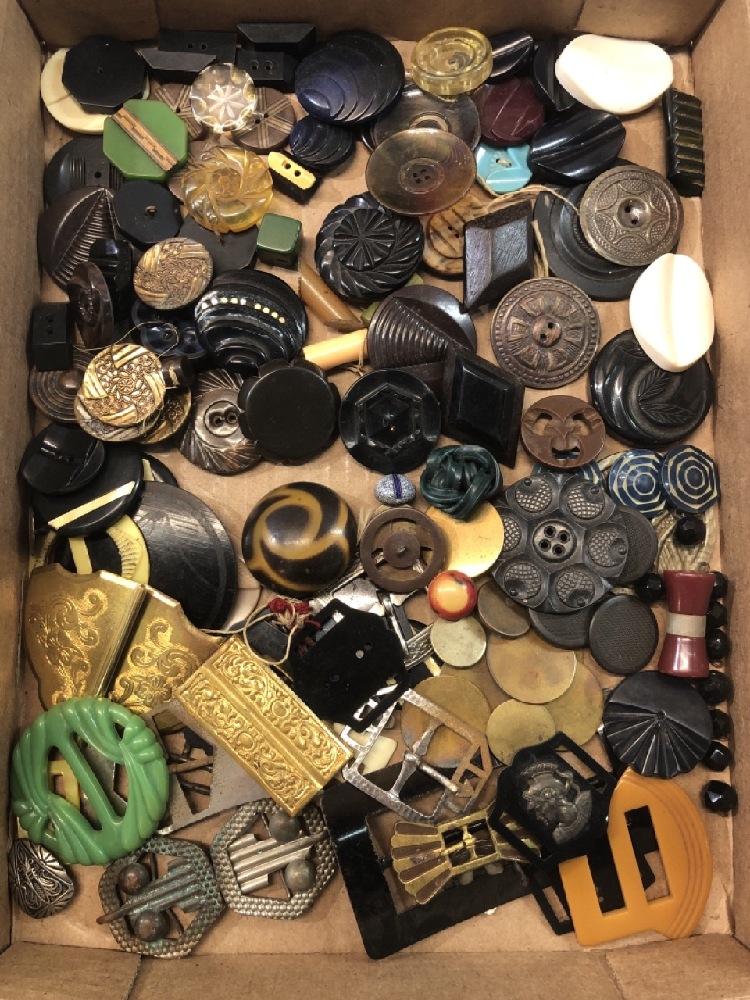 Vtg. Button and Belt Buckles including Celluloid, Brass, Bakelite, Metal and More.