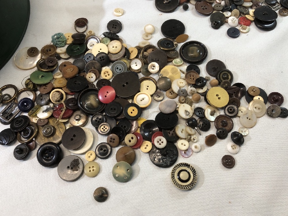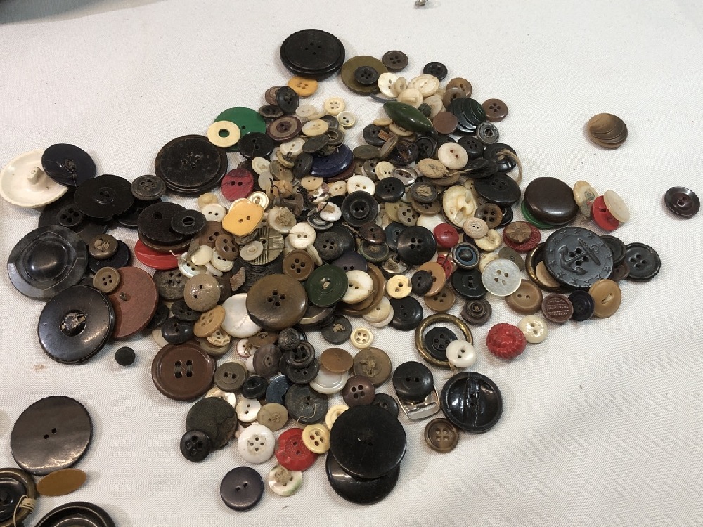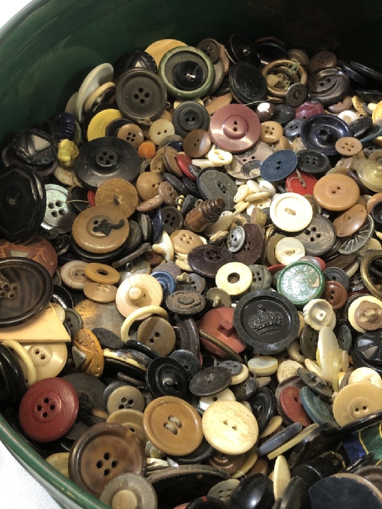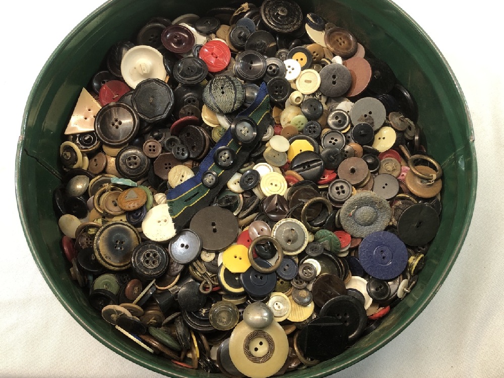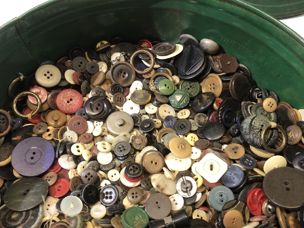 Large Tin With Various Vtg. Buttons including Celluloid, Brass, Bakelite, Metal and More.