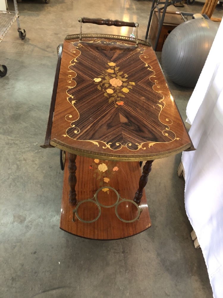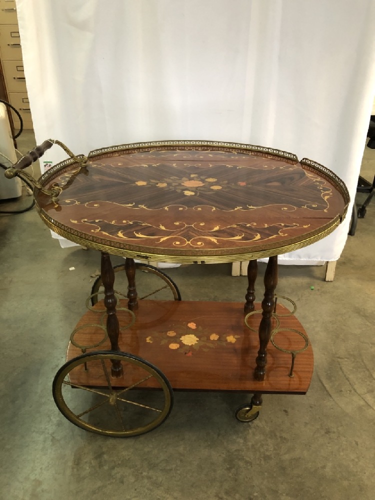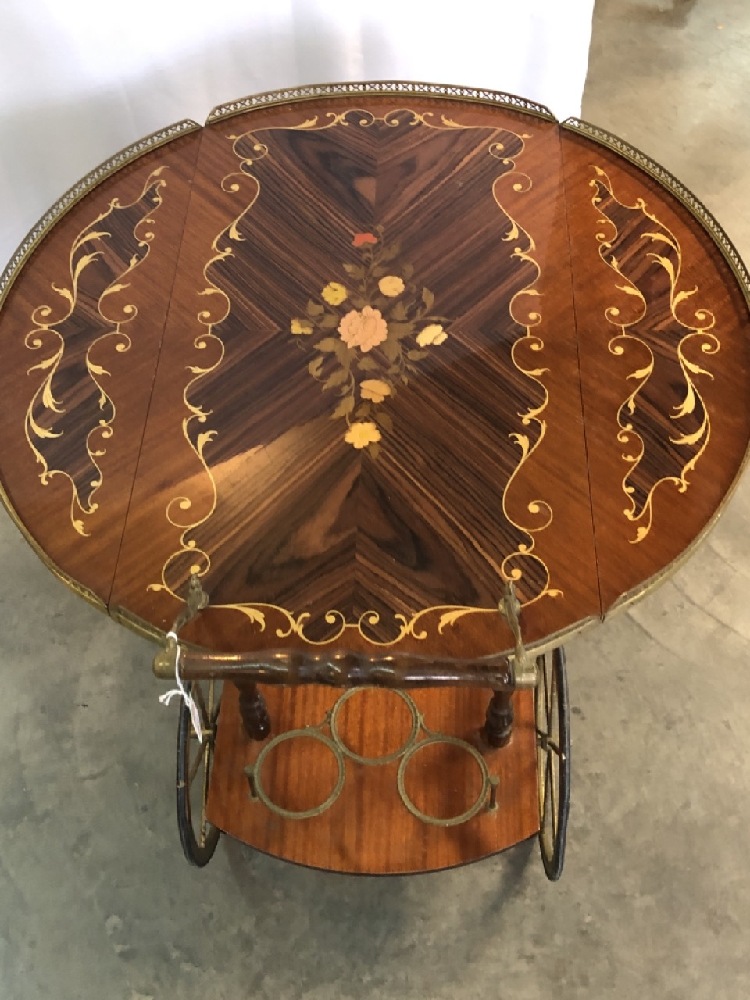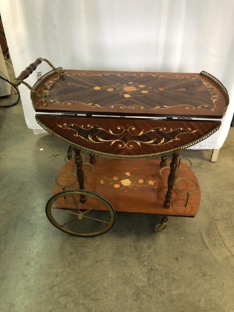 Vintage Mid Century Italian Sorrento Drink Trolly/Inlaid Wood/Brass Finishing and Accents/29.5” x 15 3/4” x 28” with Sides Dropped/Open 29 3/4”