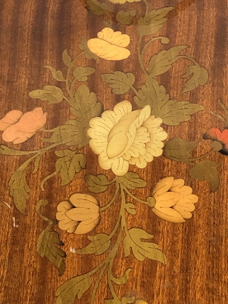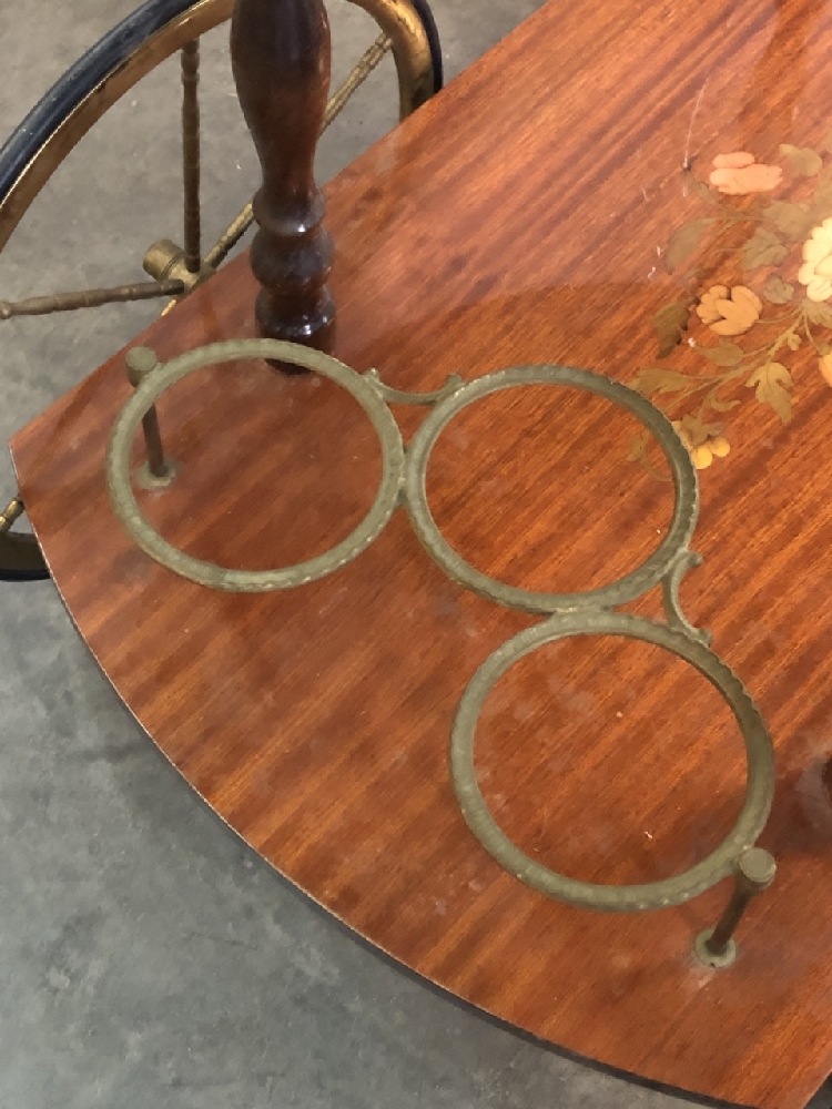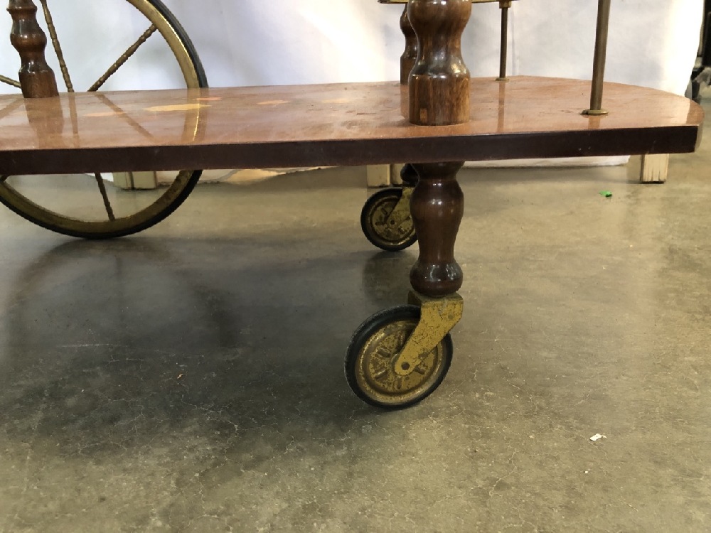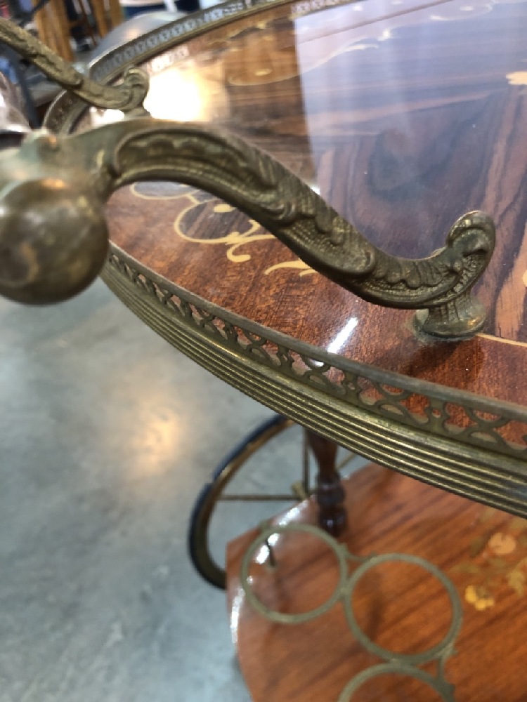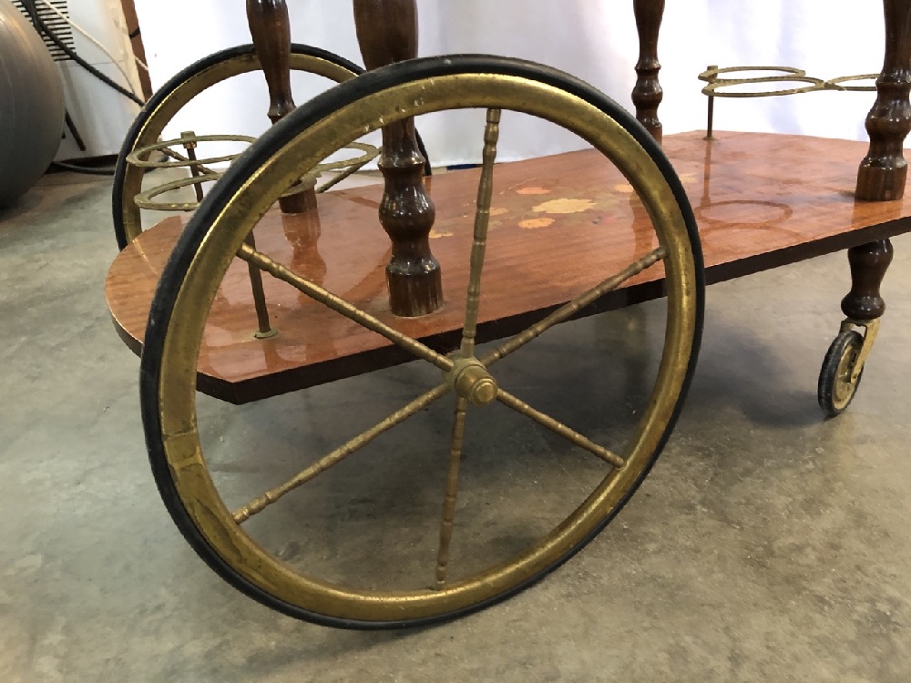 Vintage Mid Century Italian Sorrento Drink Trolly/Inlaid Wood/Brass Finishing and Accents/29.5” x 15 3/4” x 28” with Sides Dropped/Open 29 3/4”