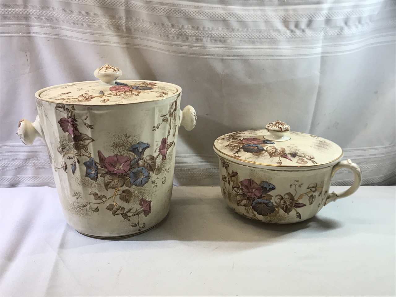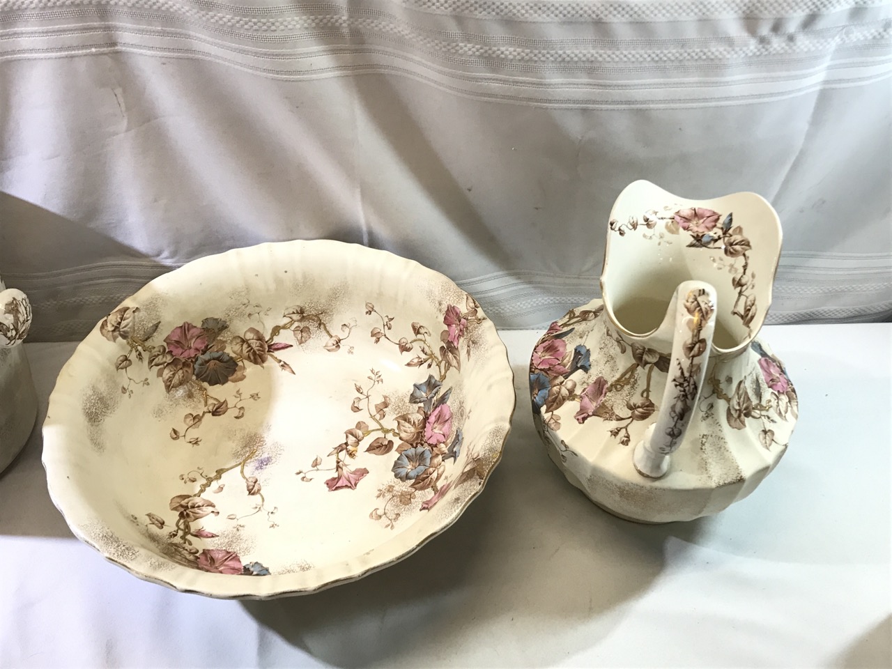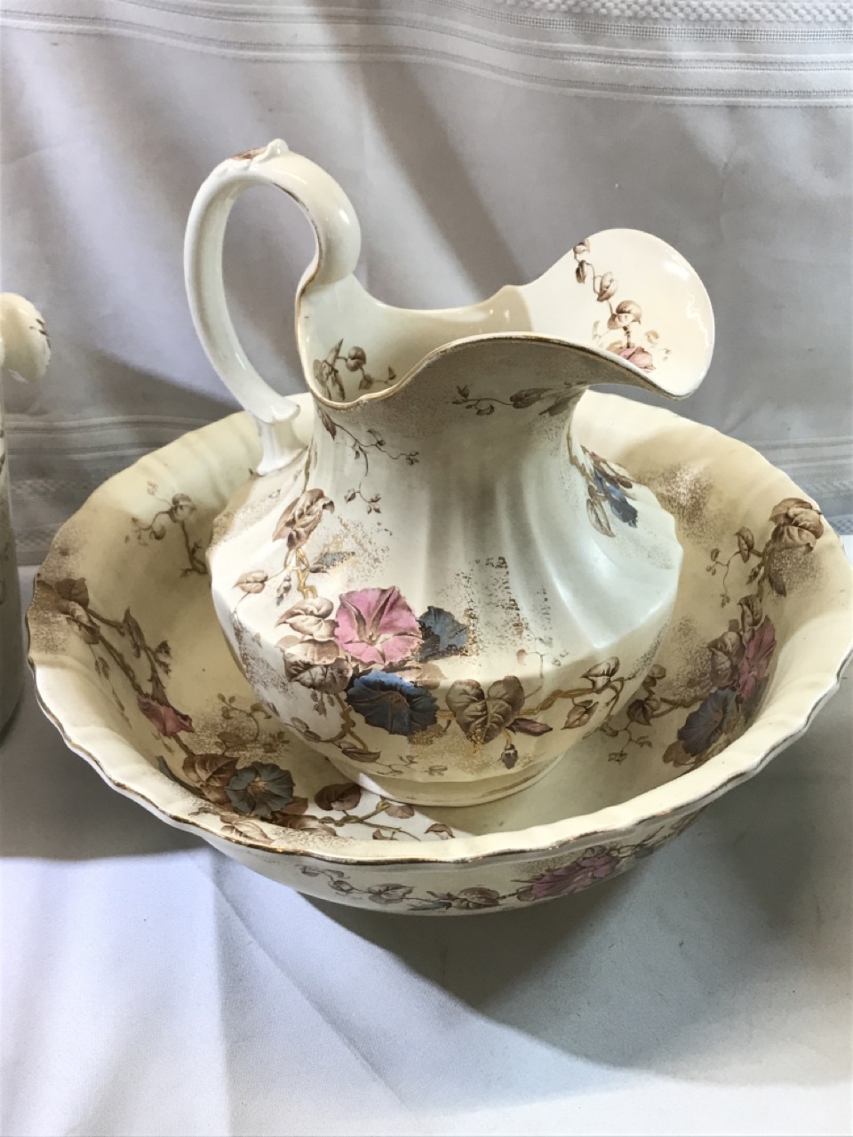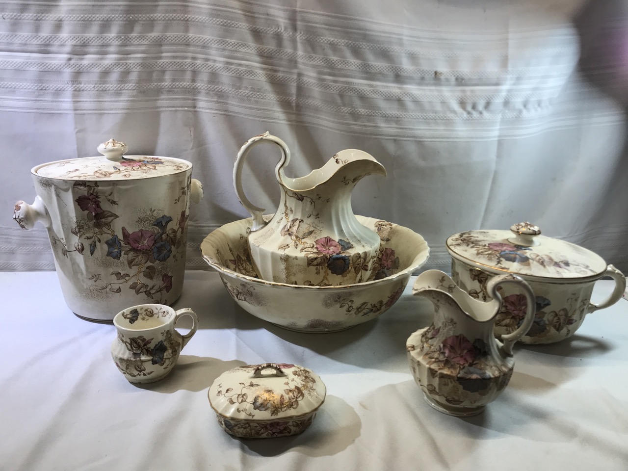 7pc BWM & Co. England Cauldon Ware Washstand Set - Morning Glory Design ~ Including Pitcher & Bowl, Shaving Mug, Pitcher, Soap Saver, Chamber Pot and Slop Jar