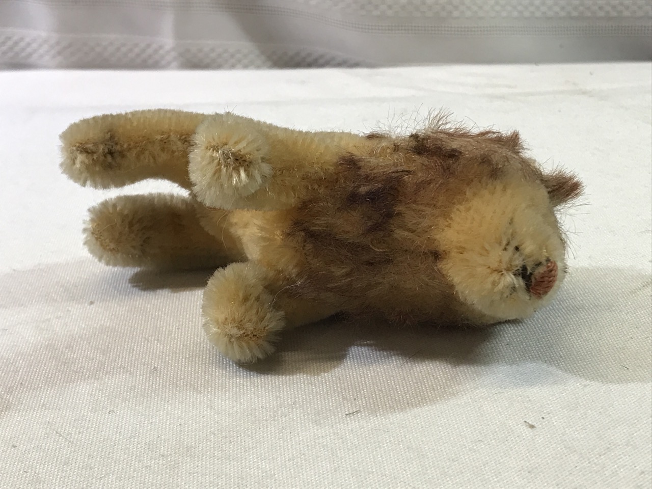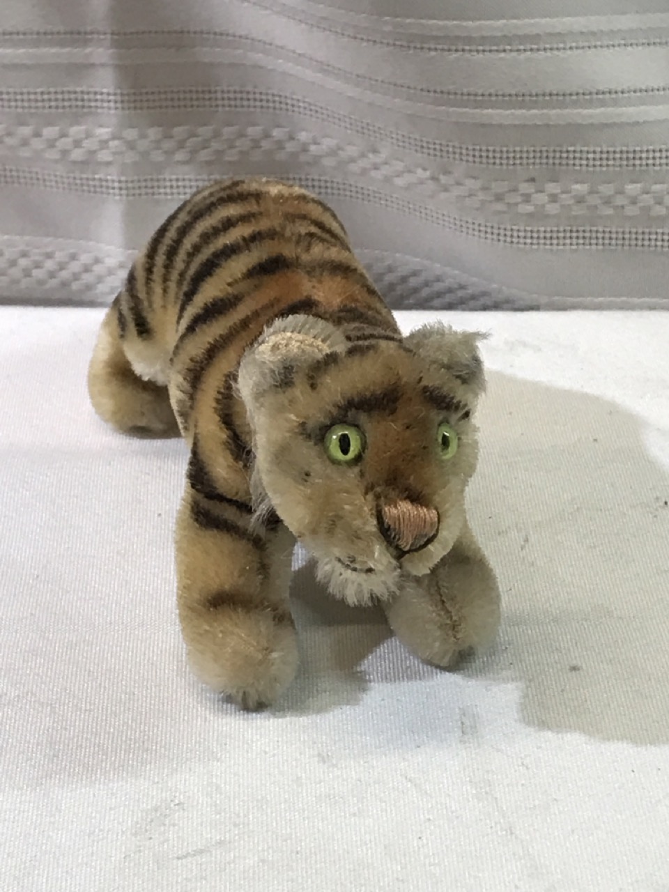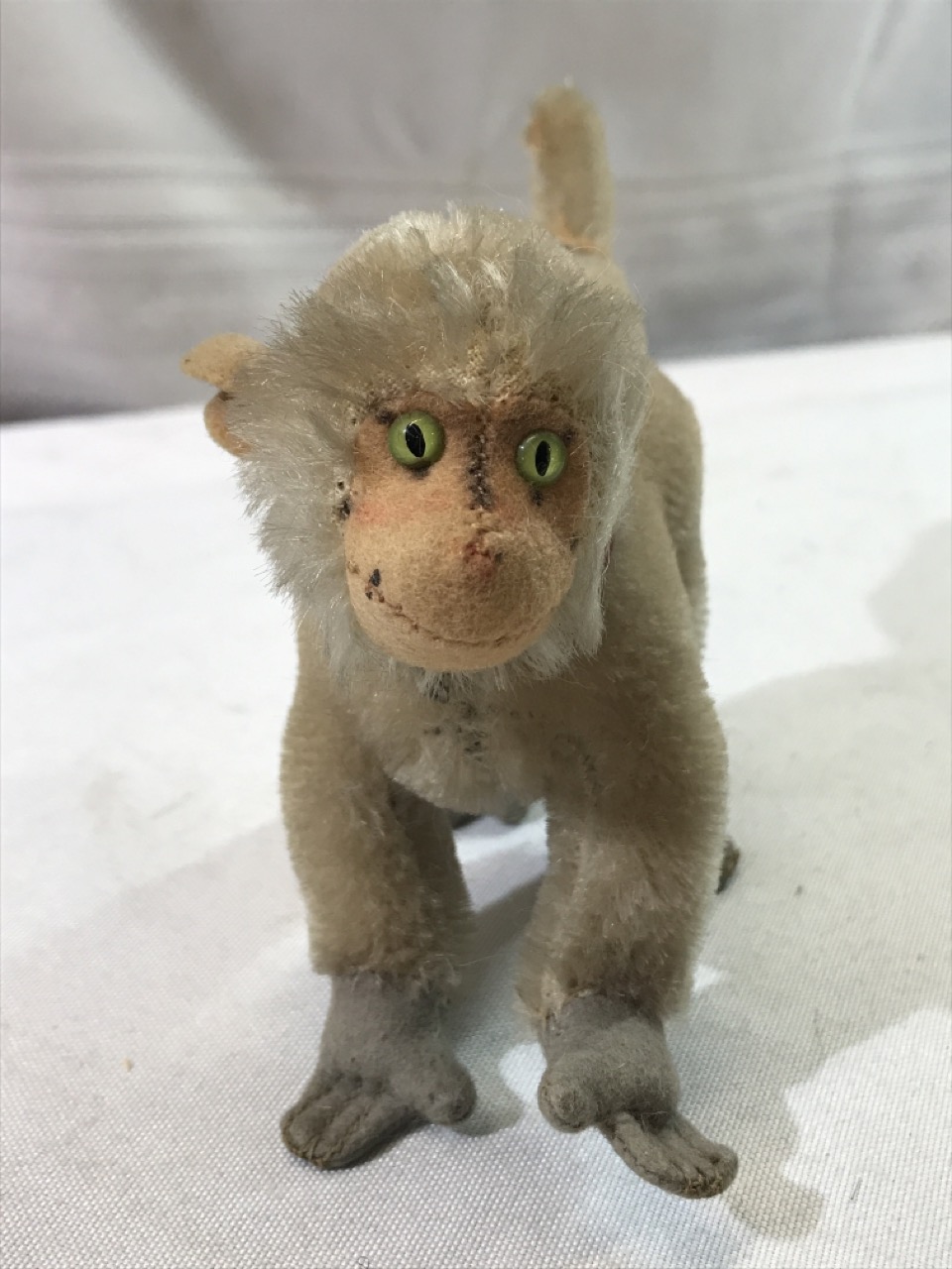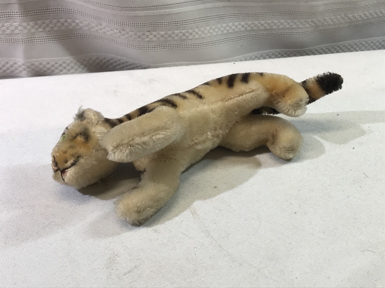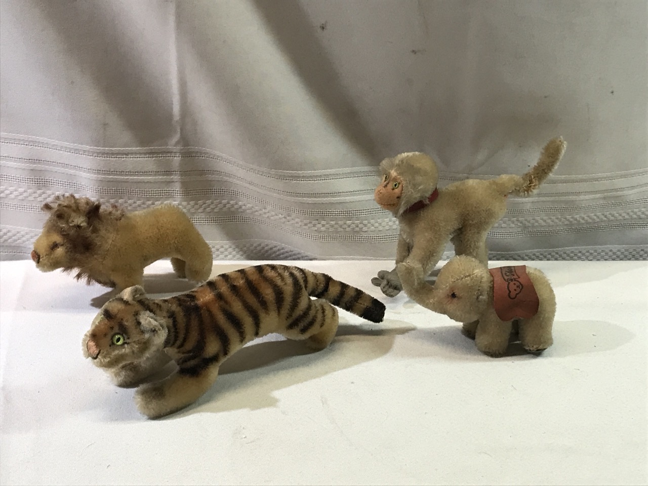 1950’s Steiff Miniature Stuffed Animals - Tiger, Elephant ( Missing Ear) , “Coco” Baboon Monkey (Damage to Tail and missing Ear) and Leo Lion (Missing Tail) - Range From 4” long to 8” Long