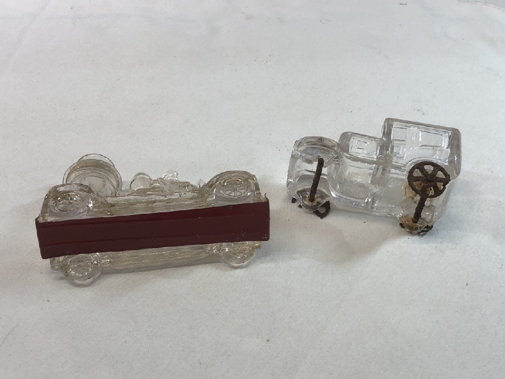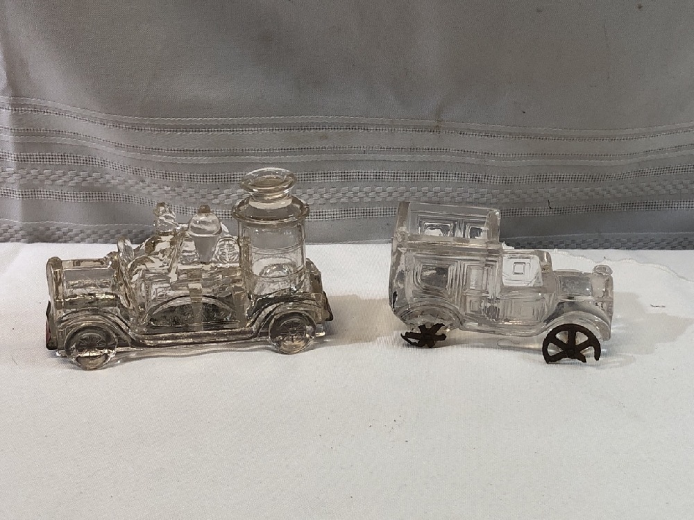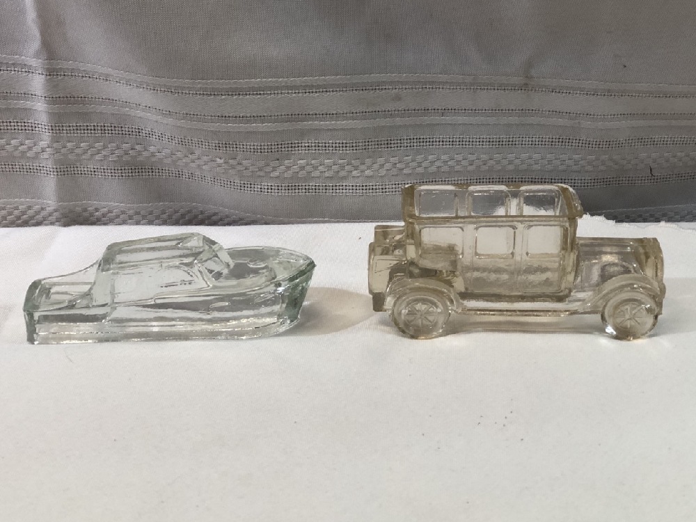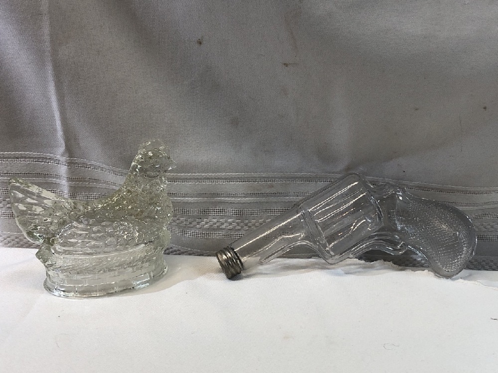Antique Figural Glass Candy Dishes including Pistol Shaped, Cars, Boats, Dogs and Hen (Some Signed)