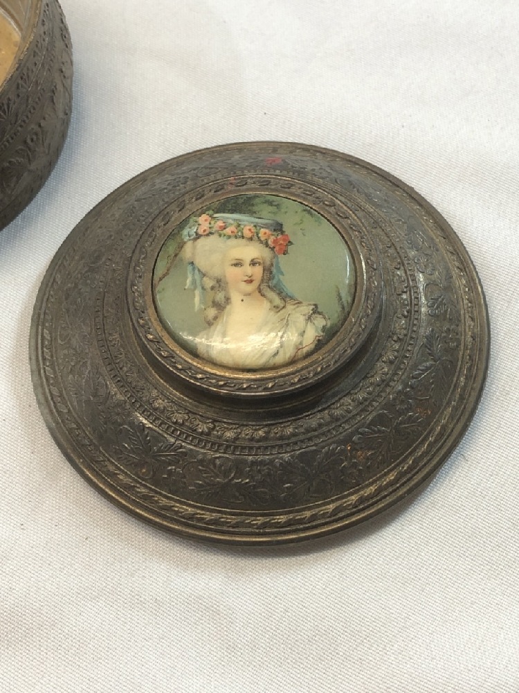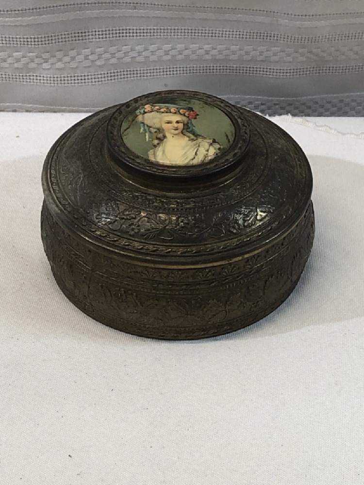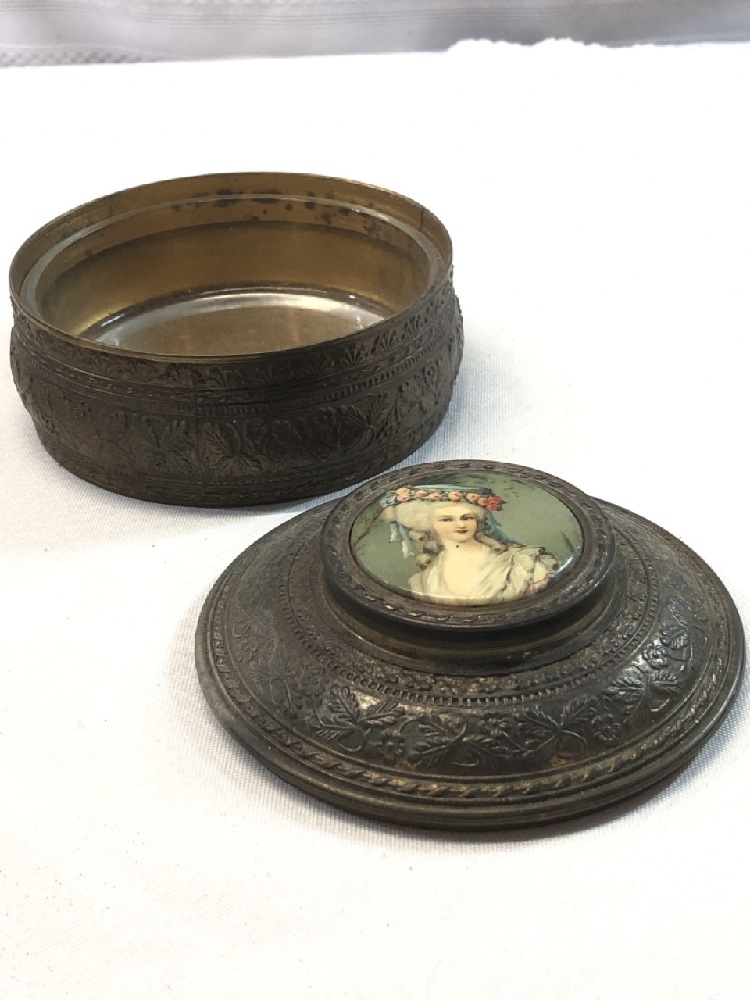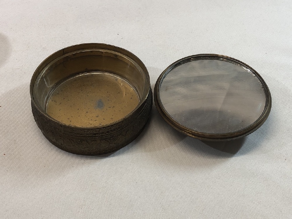 Victorian Brass Powder/Dresser Box- Original Glass Liner & Mirror - PNCH USA- 4 1/2” Round