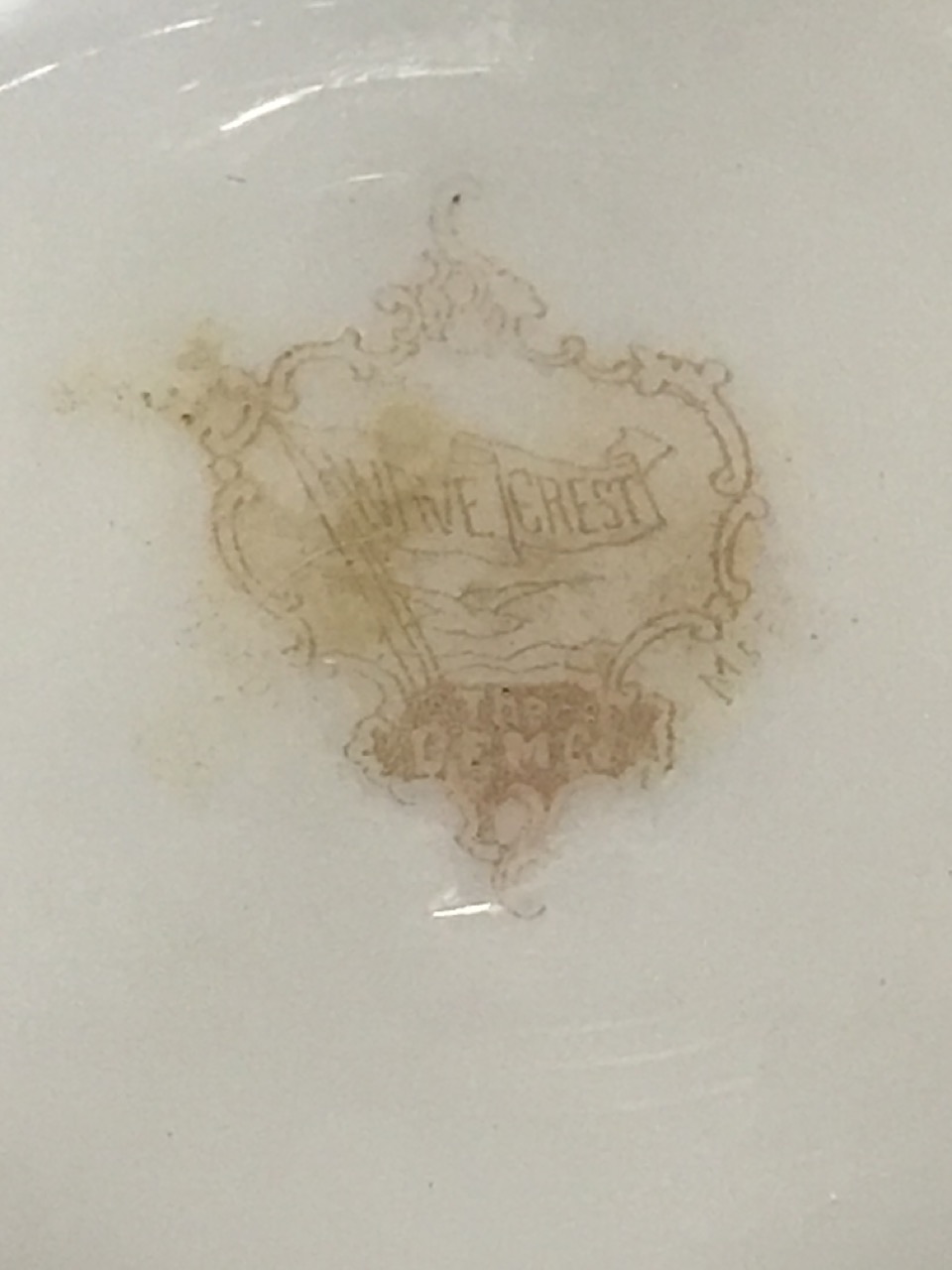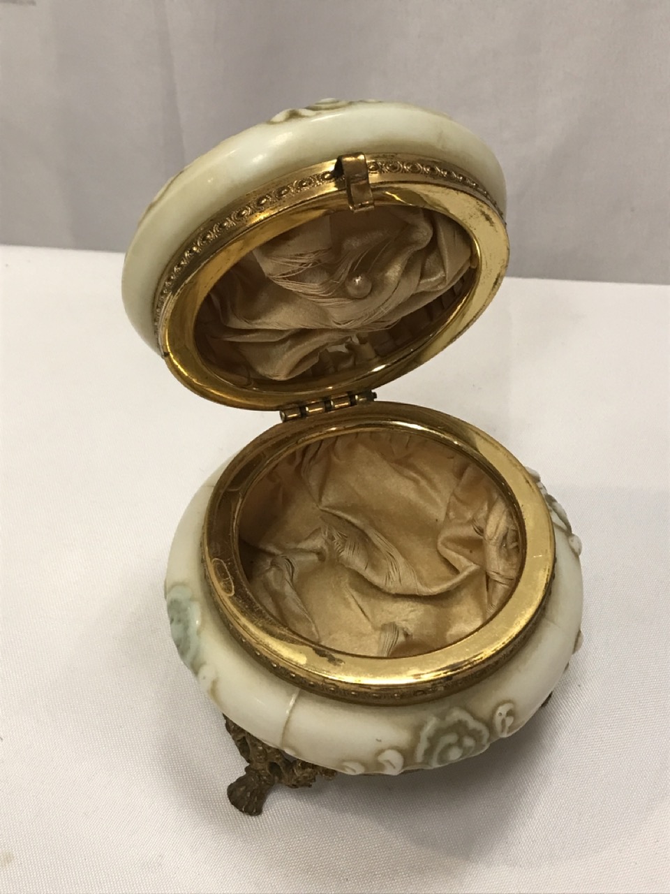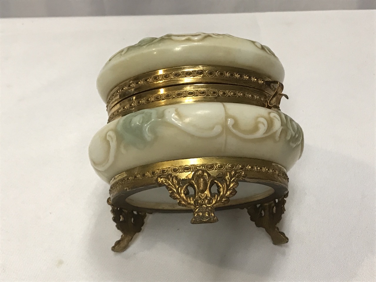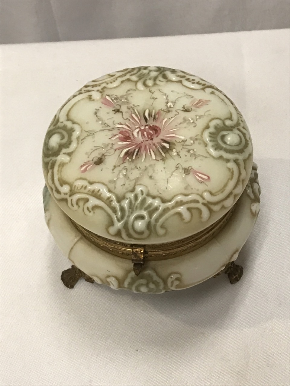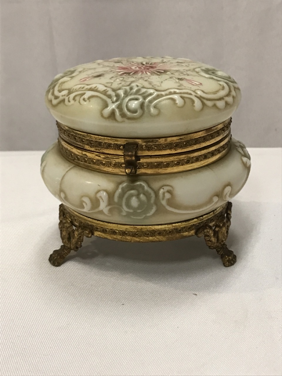 Antique WaveCrest Art Glass Dresser Box - The C.F.M Co. - Brass Accents ~ 3 3/4” Tall x 4” Round