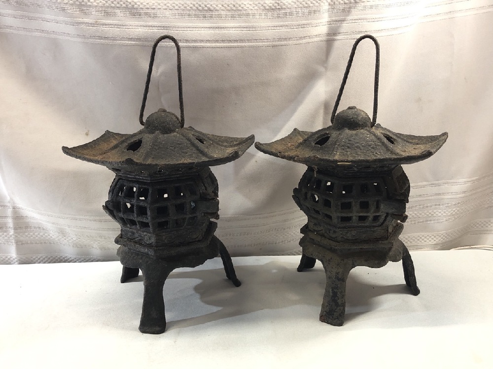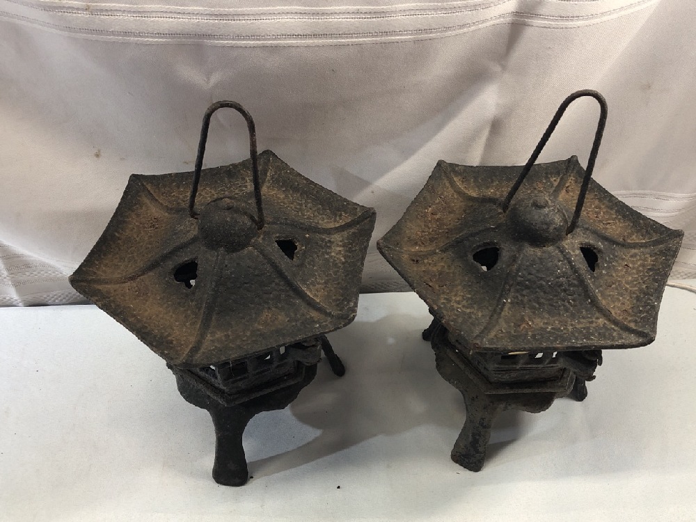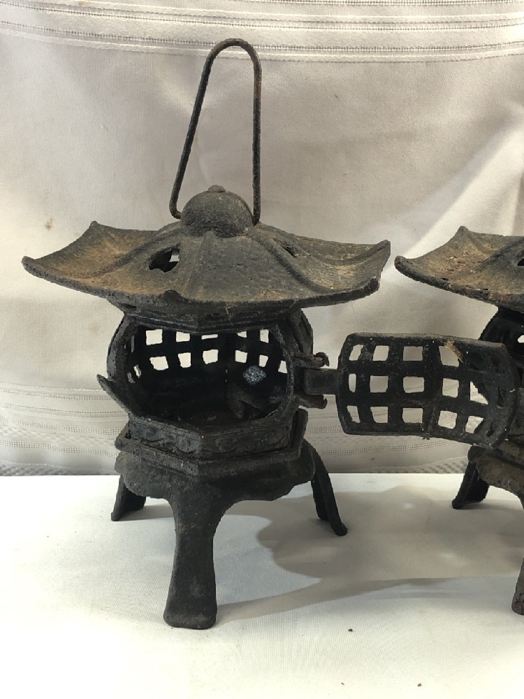 Pr. Antique Japanese Iron Lanterns ~ Pagoda Style ~ 12” To top of Handle x 7 1/2” Wide