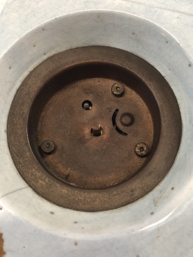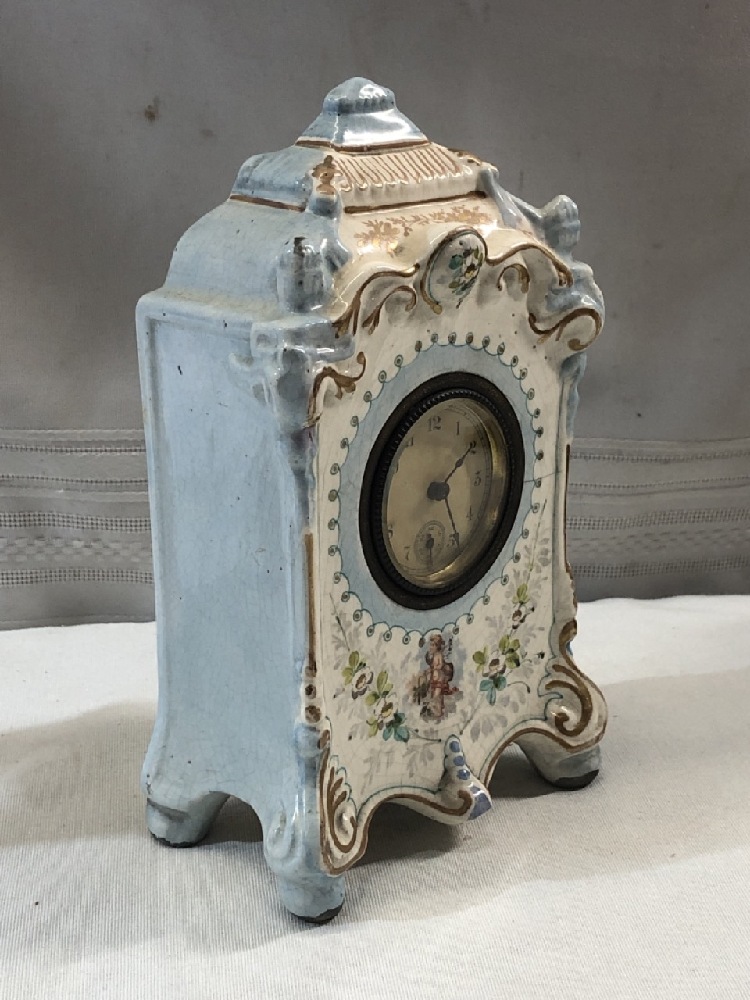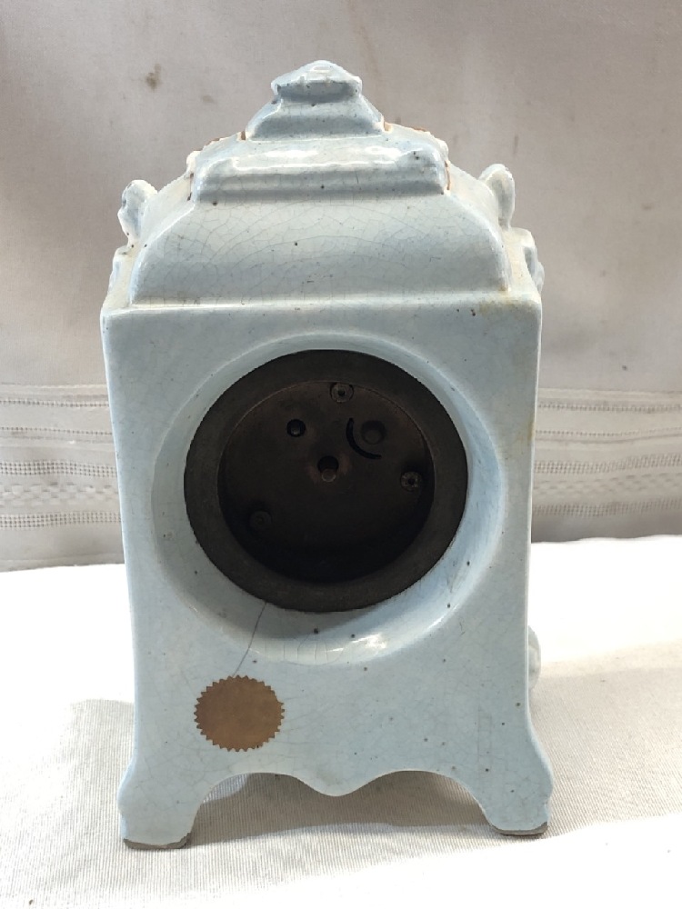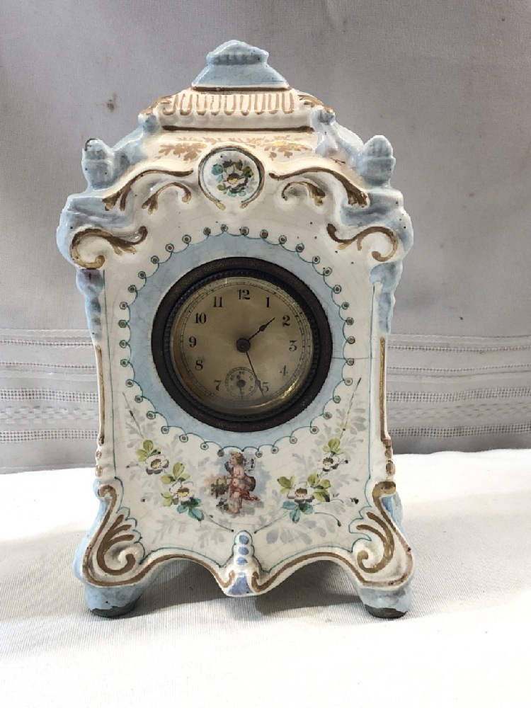 Antique Porcelain Mantle Clock~ Bronze insert~ 8” Tall x 4 3/4” Wide x 3” Deep