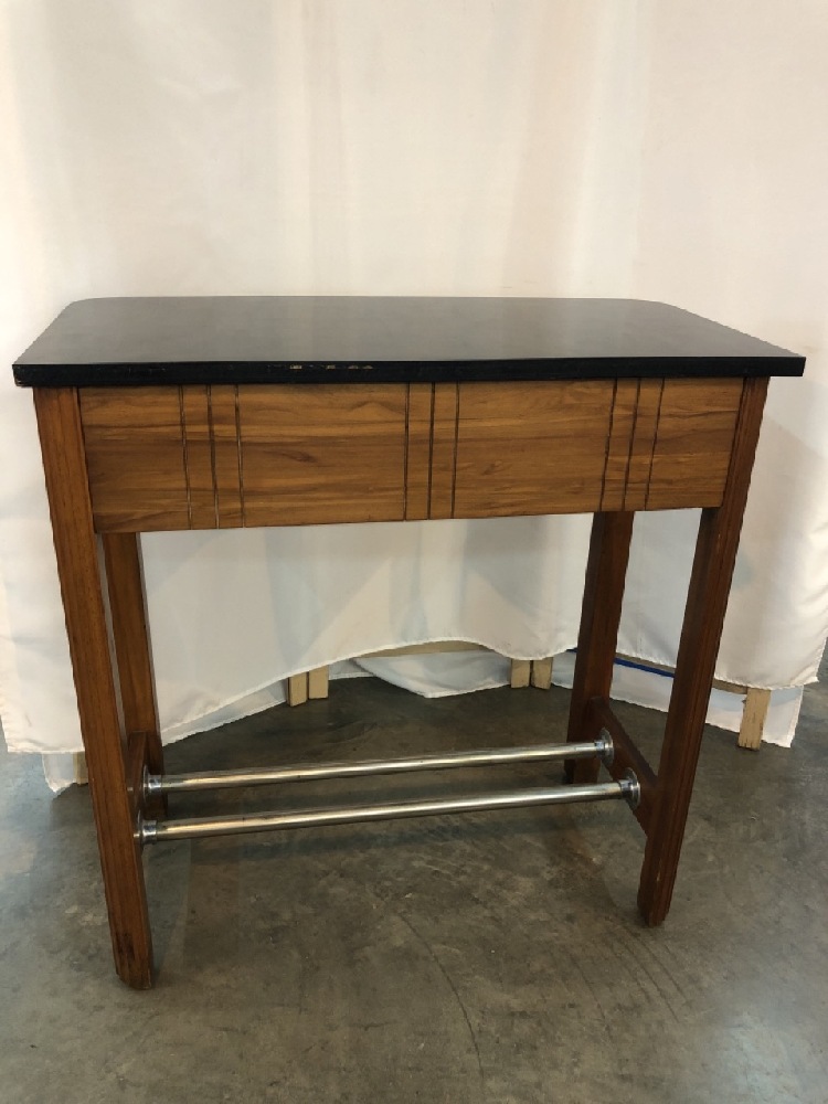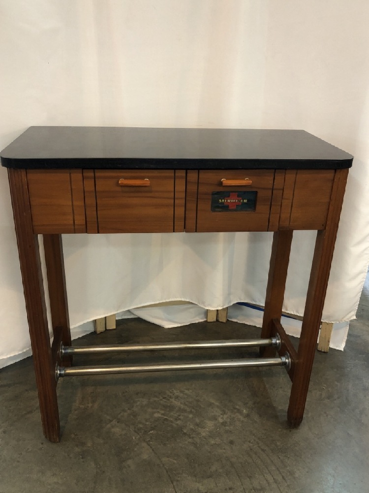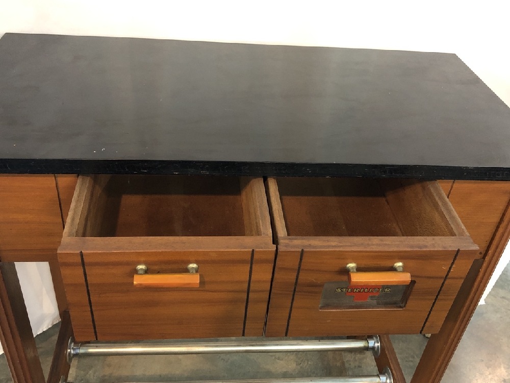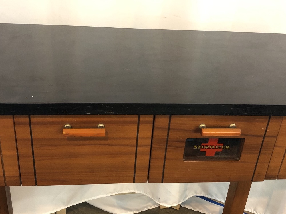 Antique 20th Century Barber/Medical Vanity - Bakelite Handles- Black Lacquer Top- Sterilizer Drawer ~ 30” Long x 14 1/4” Wide x 31 1/4” Tall