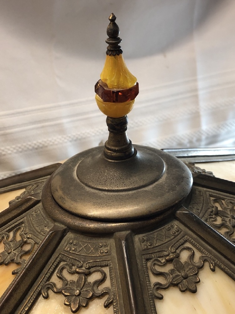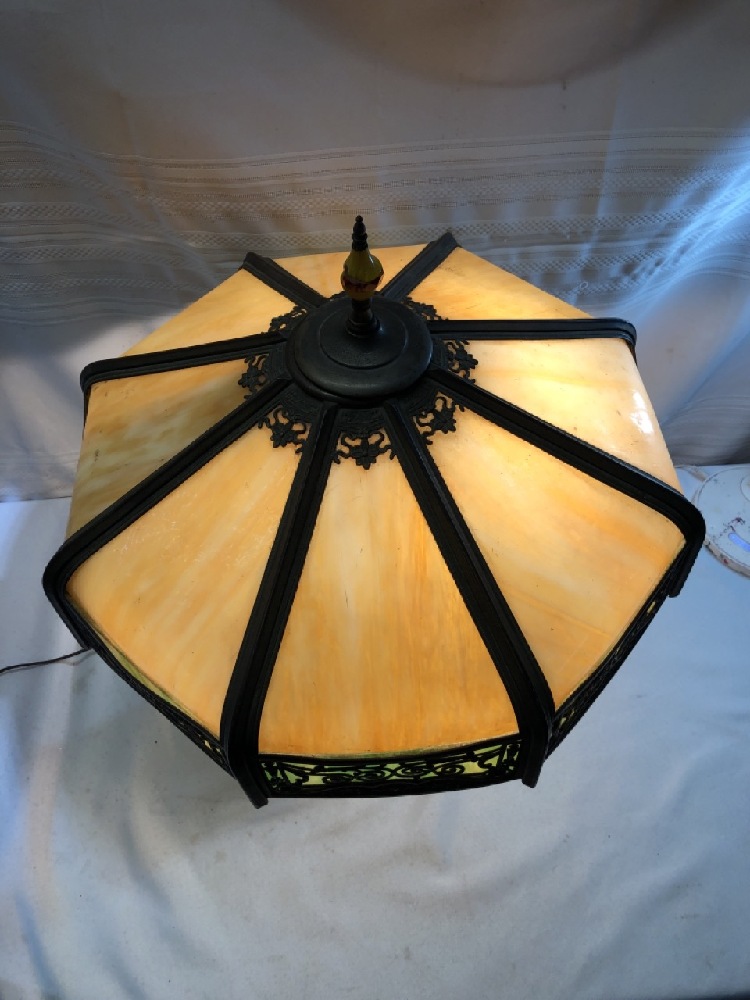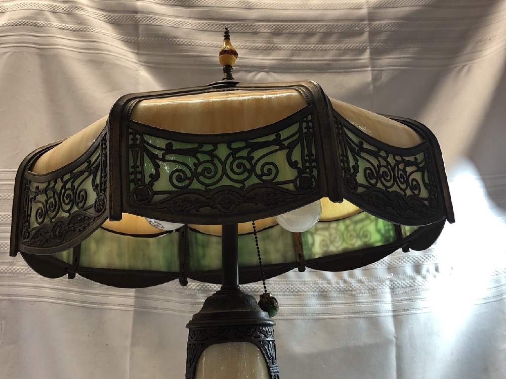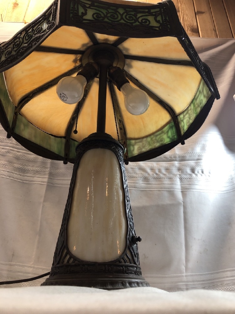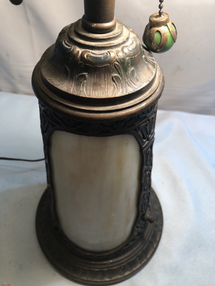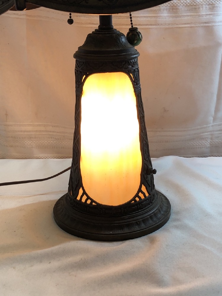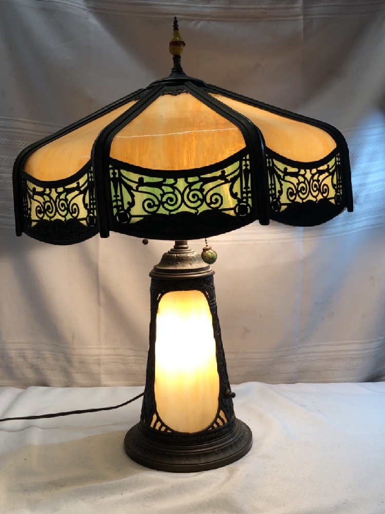 Antique Spelter Slag Glass Lamp ~ Bronze/ Slag Glass- Lighted Base- 24” Tall x 19 “ Diameter ~ Works