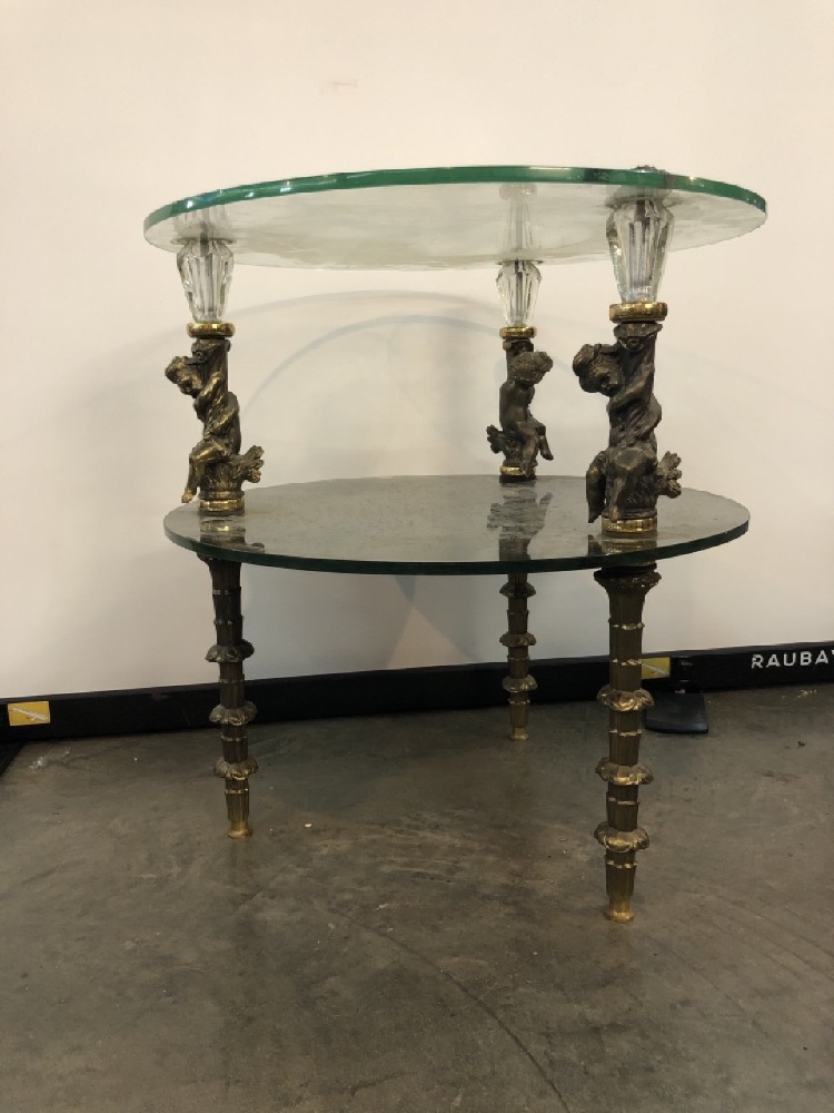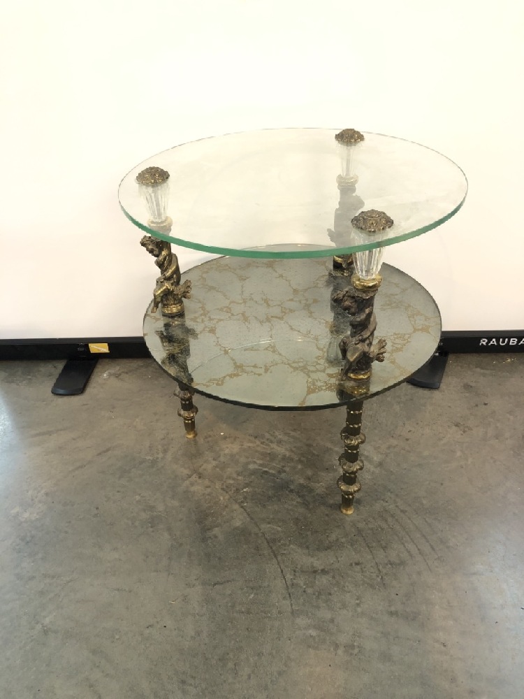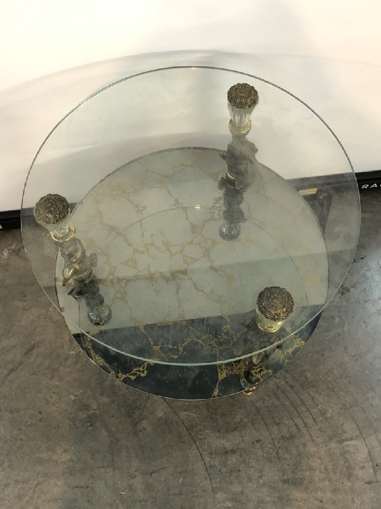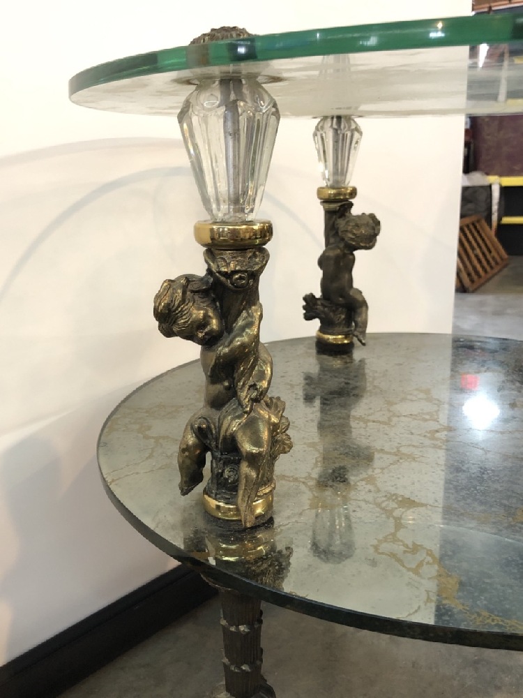 Antique Hollywood Regency Goran Belgium Glass 2 tier Table - 23 1/2” Tall x 22” Round ~ Brass Cherub Finials