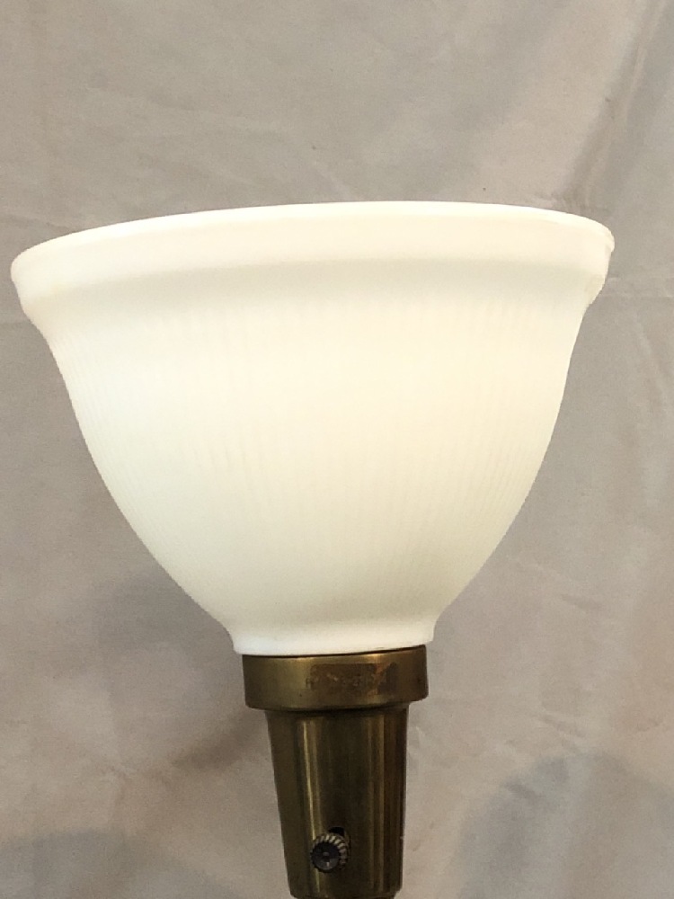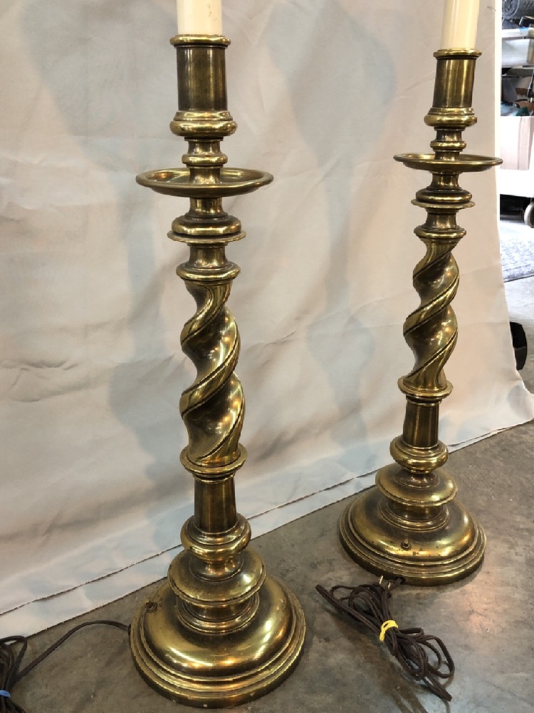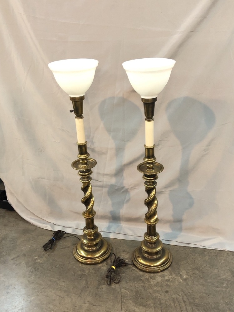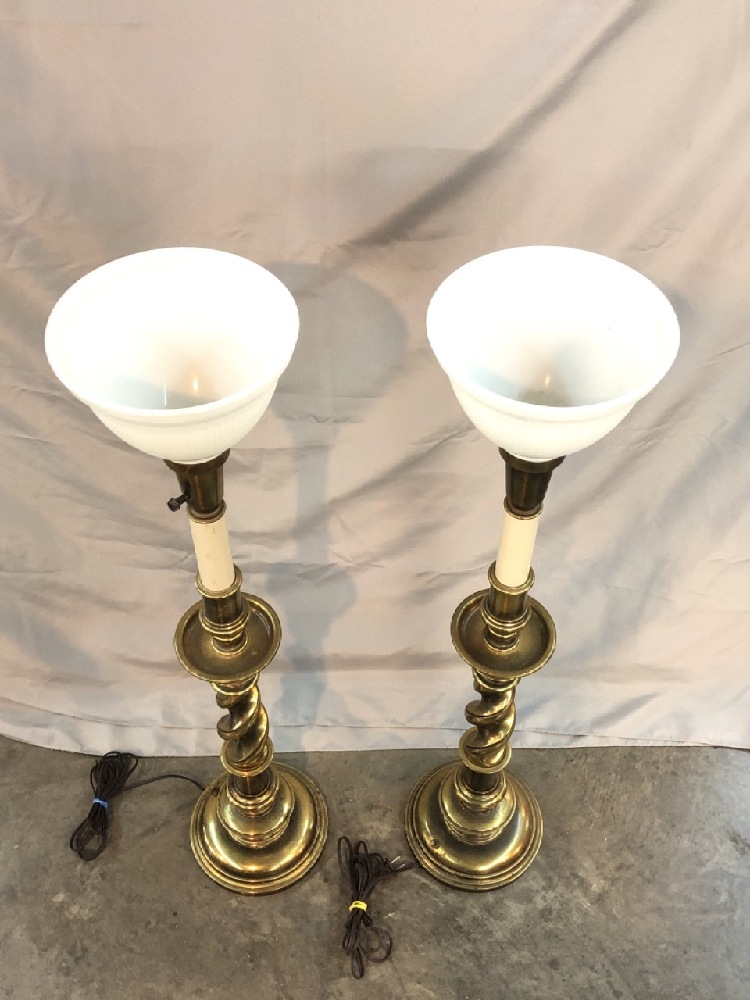 Pair of Stiffel Brass Lamps with Milk Glass Shades - Barley Twist Torchiere ~ 38” Tall