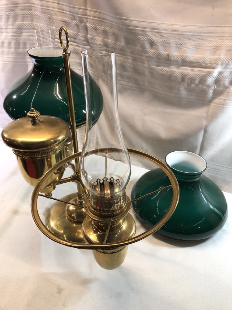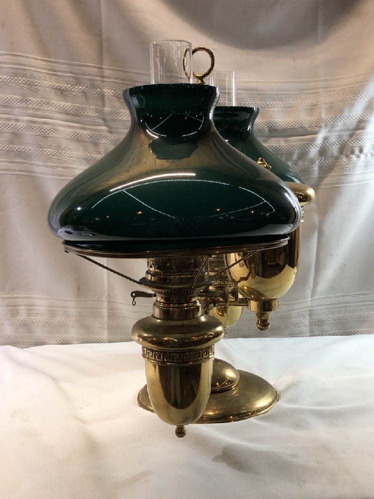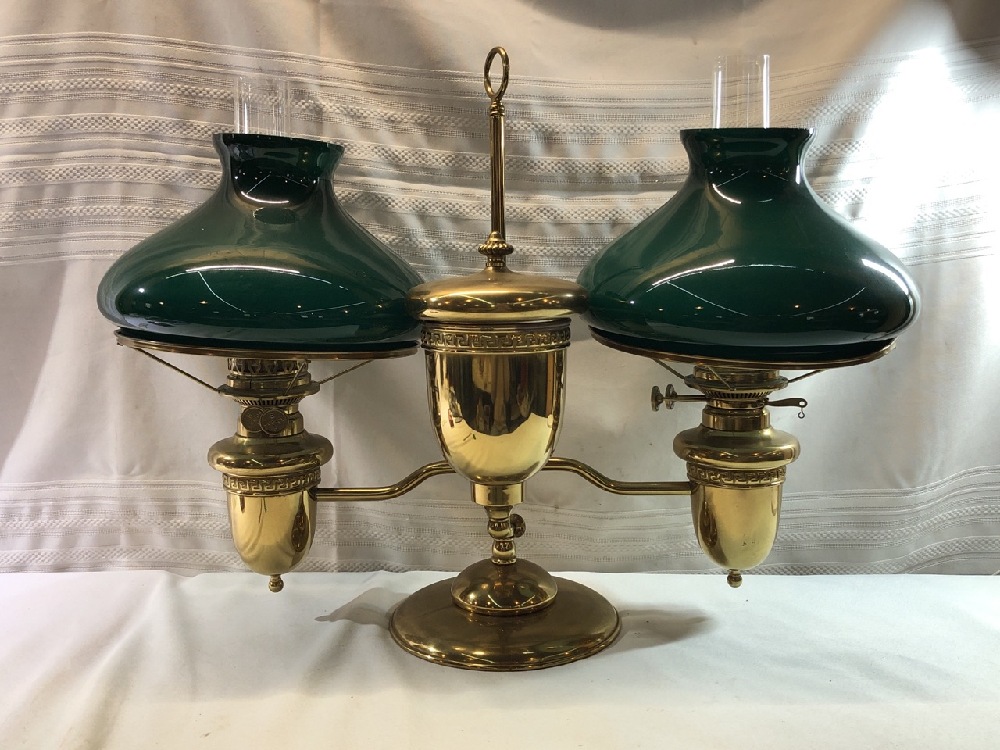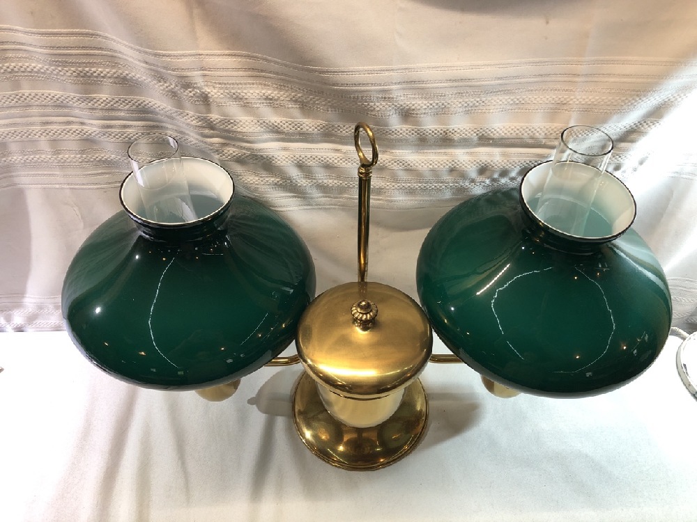Victorian Bradley & Hubbard Double Student Lamp - Brass W/ Original Green Emeralite Glass Shades/Chimneys are 3 Feather Brand/ All Original( Never Electrified) 19 1/2” tall x 28” Wide