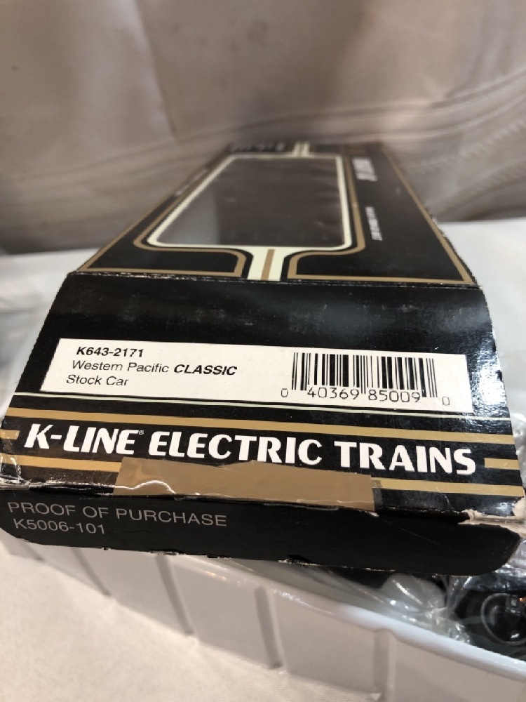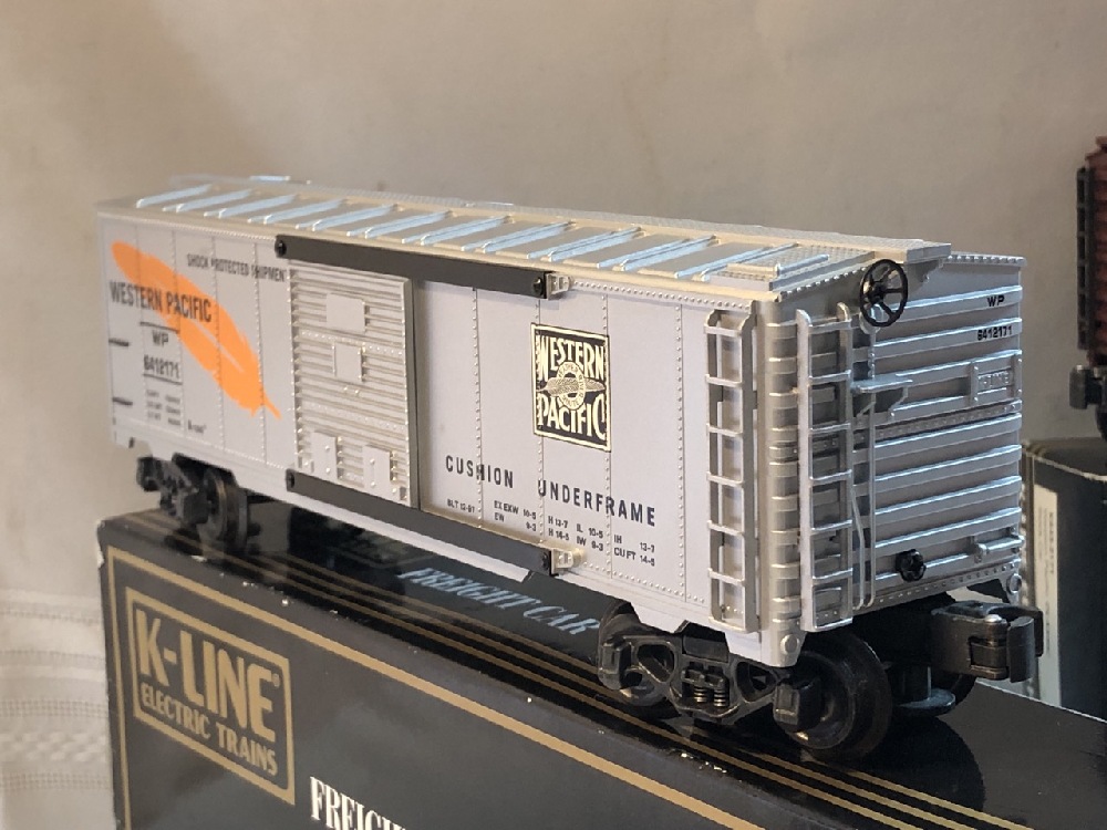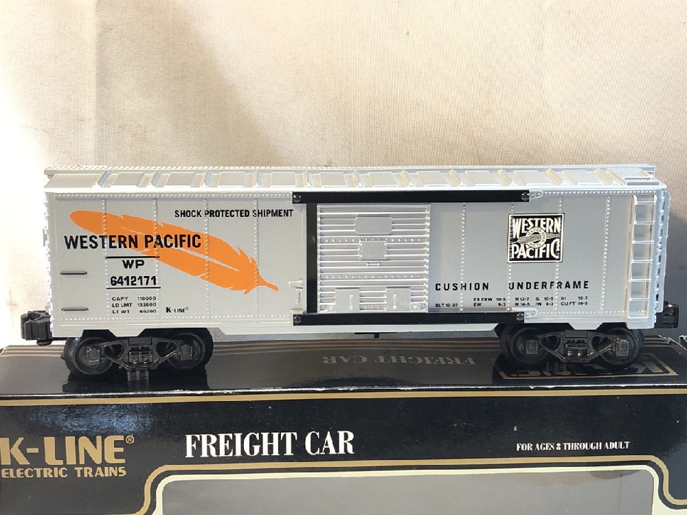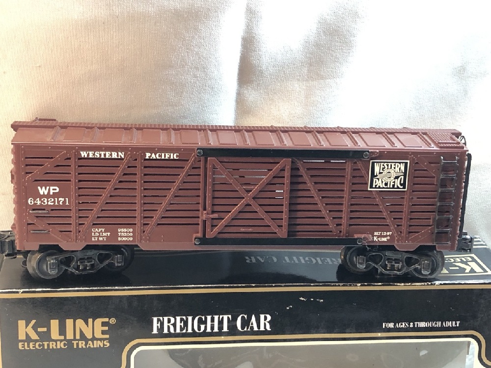 K-Line Freight Cars including K643-2171 Stock Car & K641-2171 Western Pacific Boxcar and Kennott Copper Corporation Work Caboose with Searchlight
