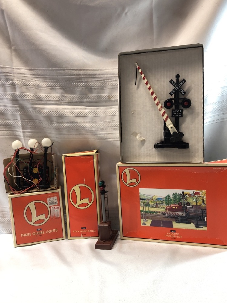 Lionel Train Accessories including Three Globe Lights6-12926 , Block Target Signal 6-12832 and Automatic Crossing Gate 6-62162 All in Original Boxes