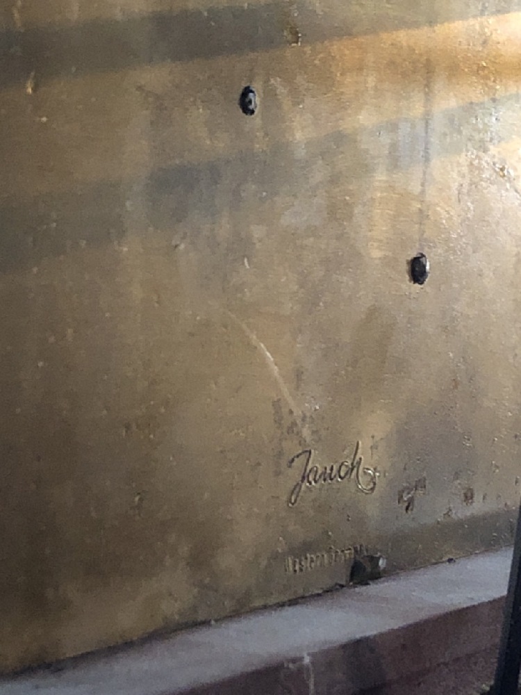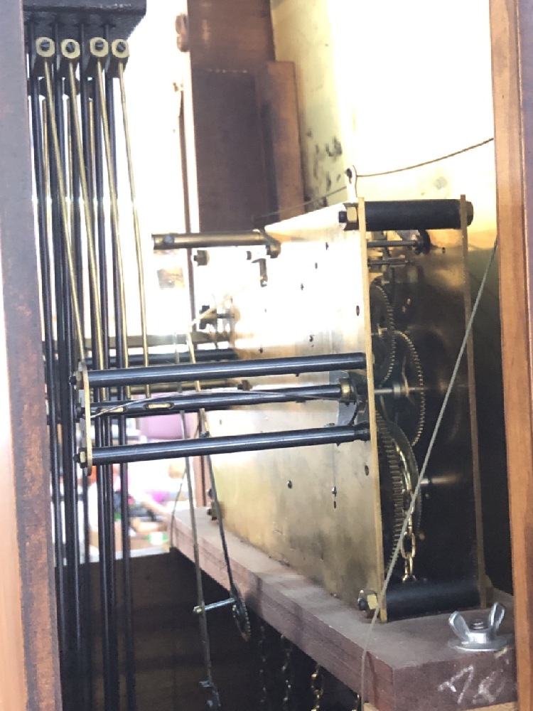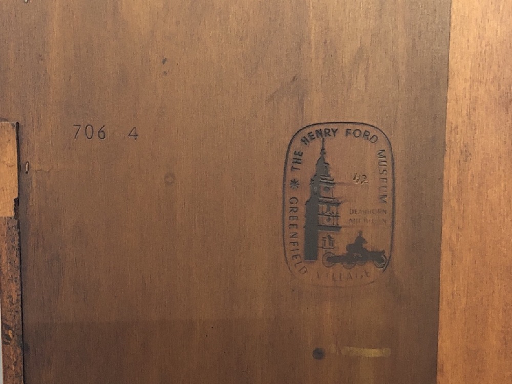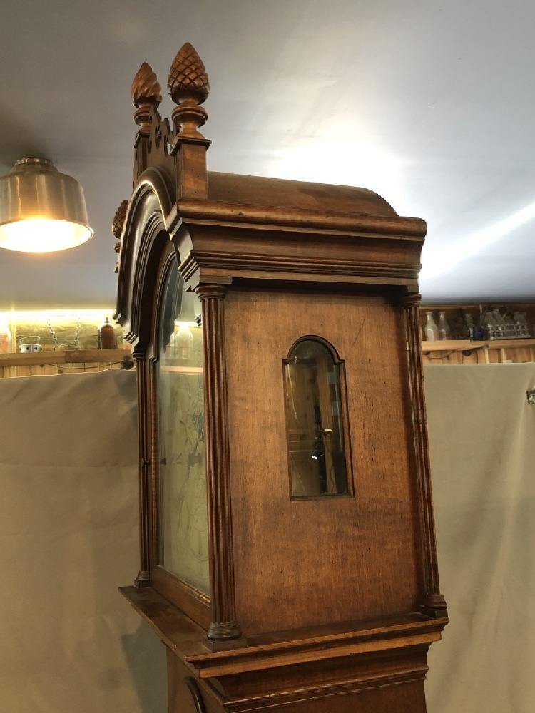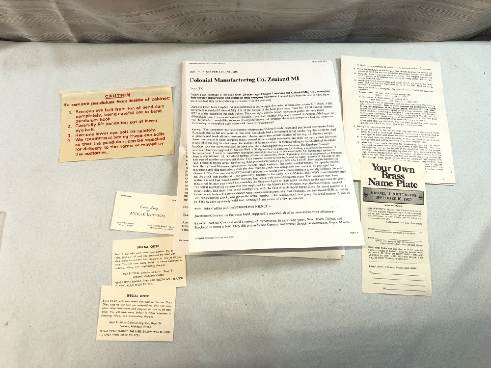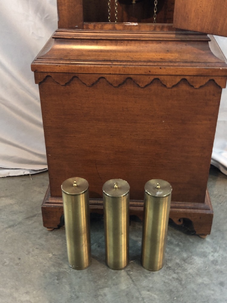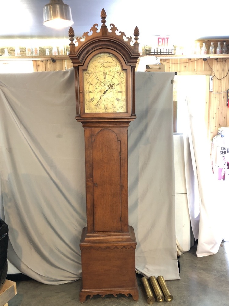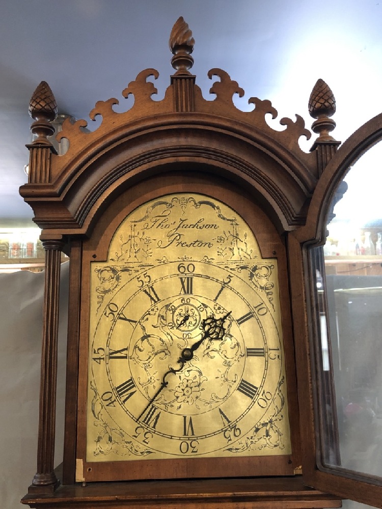 20th Century Colonial Style Grandfather Clock by Colonial Clock Company Of Zeeland Michigan, USA. Authorized Reproduction by the Henry Ford Museum, Of the Original Thomas Jackson In Preston, 1700’s. Tiger Maple Cabinet, Brass Hands,Pendulum and Weights ~ 85 1/2” Tall x 19 1/4” Wide x 11 1/4” Deep