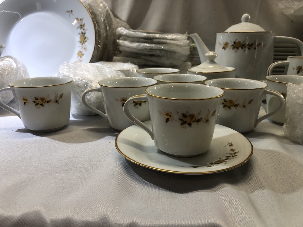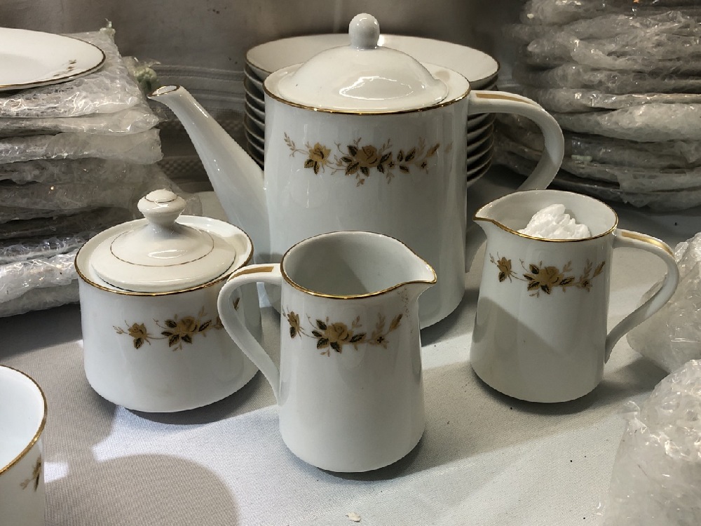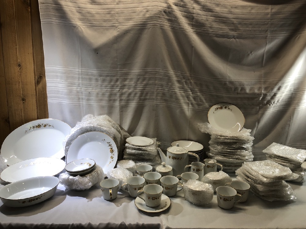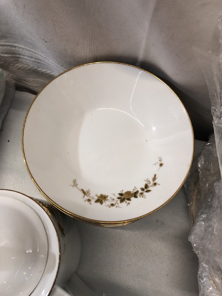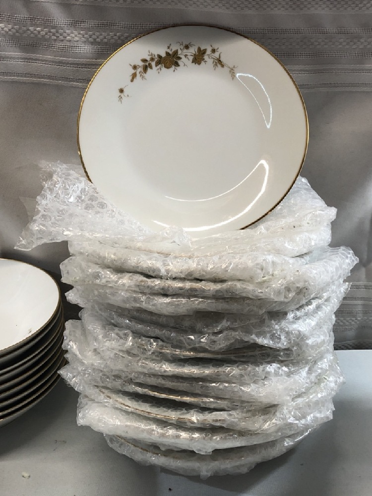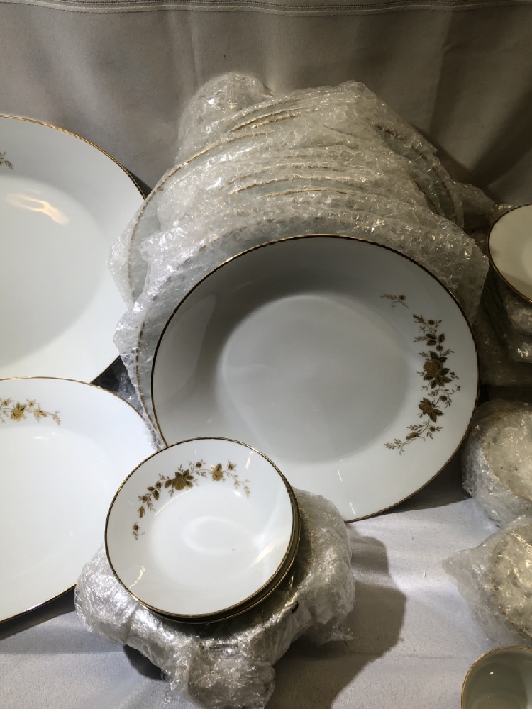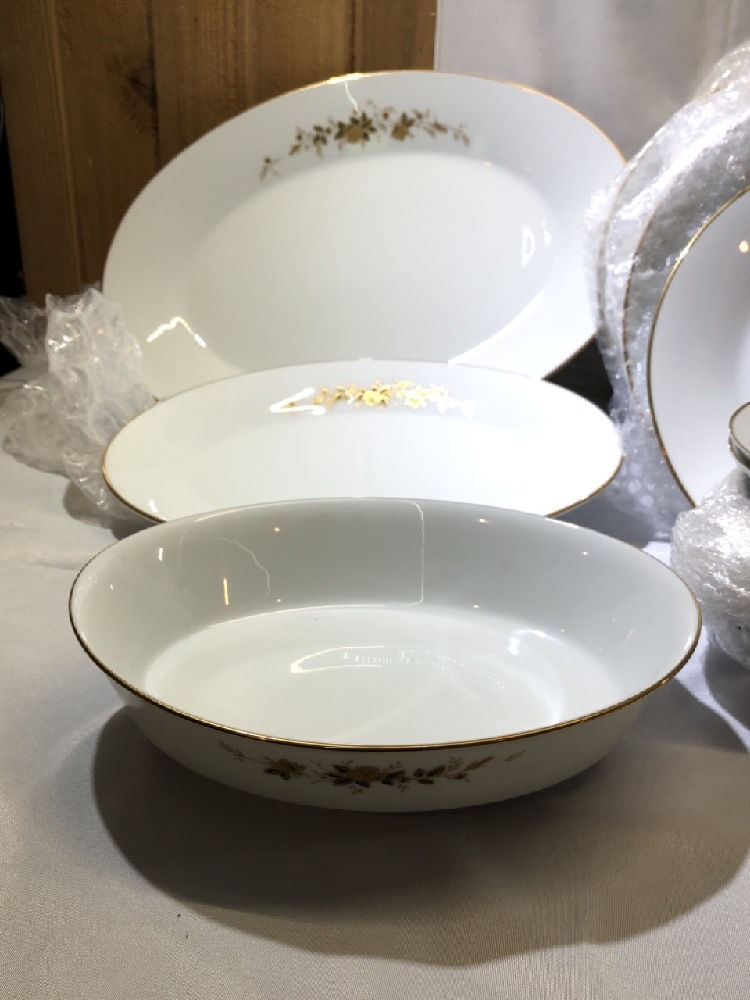 Noritake 6609 Ninon Table Service Set - Excellent Condition, 10.5” Table plates x10, 5.5” Berry Bowls x9 , 6.5” Bread Plates x12, 7.5” Soup/Salad bowl x 9, 16” Platter, 12” platter , 9.5” Veggie bowl , 8.25” Plate x 17 , Saucer x 19 , Teacups x 13, Teapot , Sugar and 2 Creamers