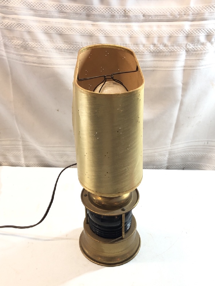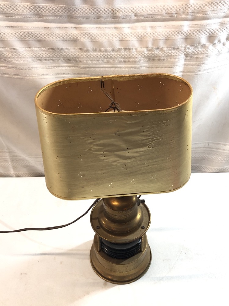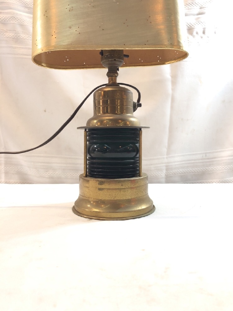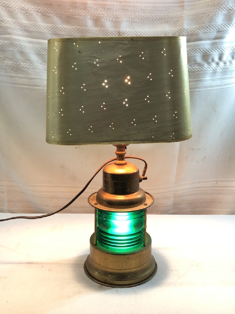 Nautical Glass Lantern Lamp ~ 15” Tall - Brass with Green Shade, Punch Hole Paper / Foil Lamp Shade