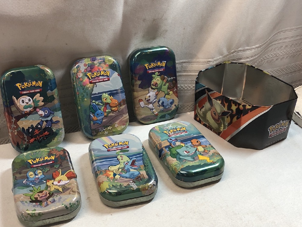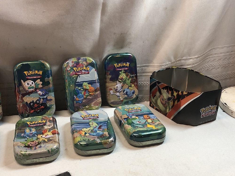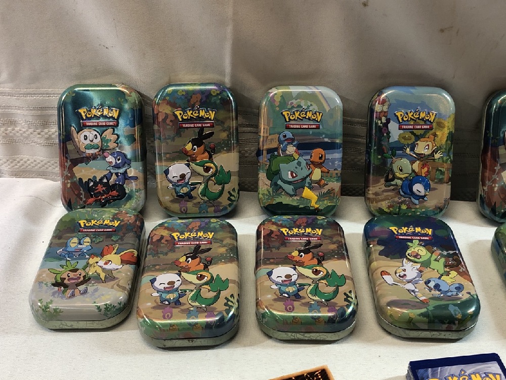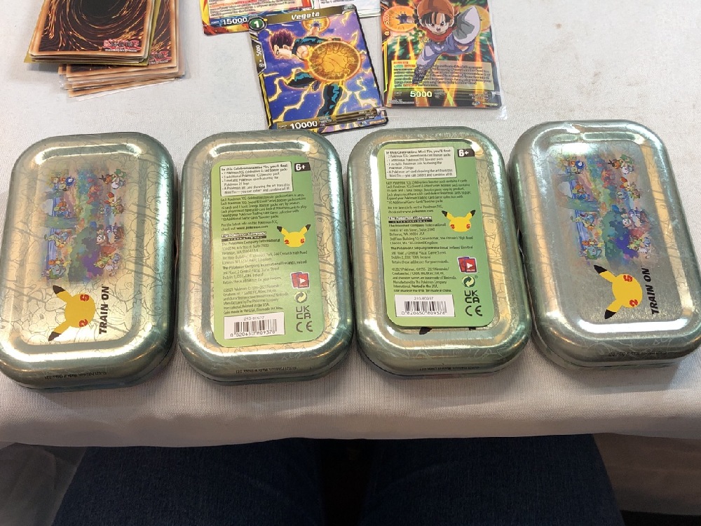 Pokemon / Yu-gi-Uh! Cards, Tins and Sleeves - 14 Mini Pokemon Tins Celebrating 25th Anniversary, 2021 Pokemon Tin (No Lid) , 54 Pokemon Cards, 136 Yu-Gi-Uh! Cards , and 4 Dragon Ball z Cards