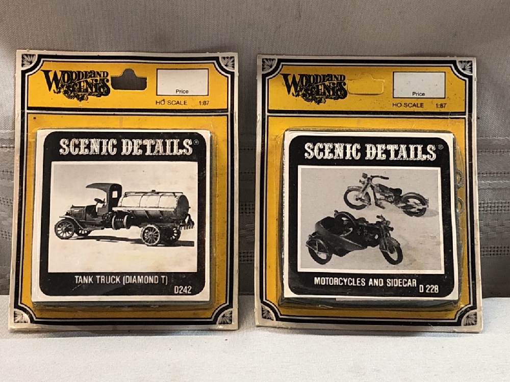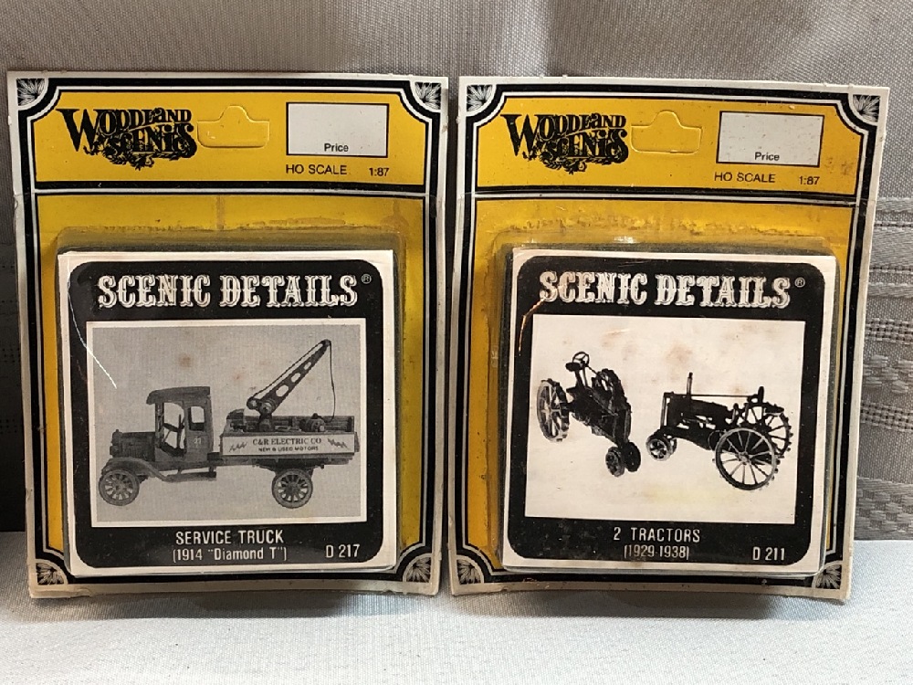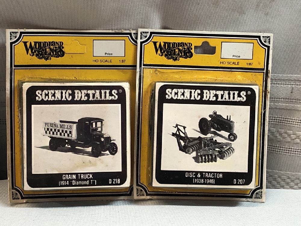 HO Railroad Woodland Scenics Model Kits 1:87 scale including Tank Truck D242, Motorcycles and Side car D 228, Service Truck D 217, 2 Tractors D 211 , Grain Truck D 218 and Disc & Tractor D 207 ~ New Old Stock