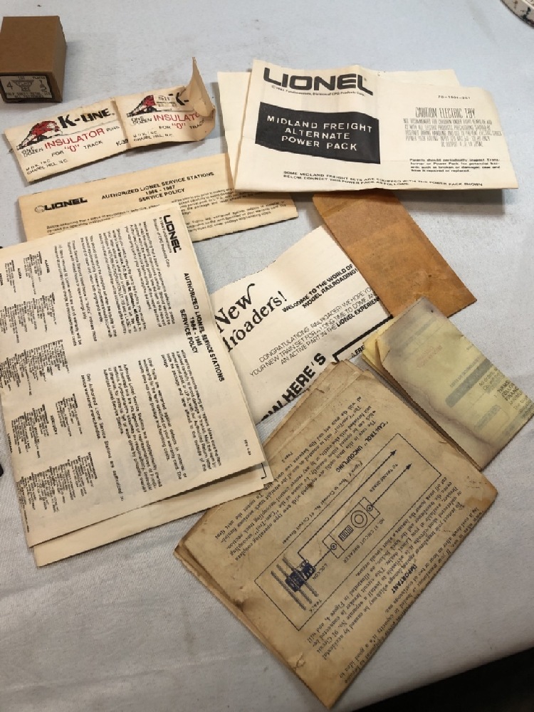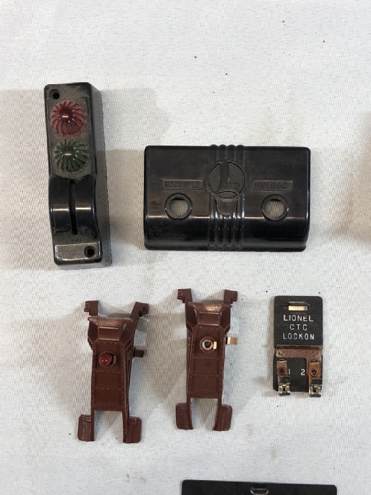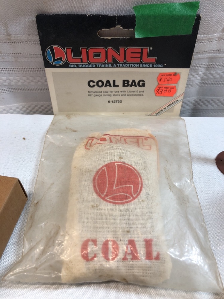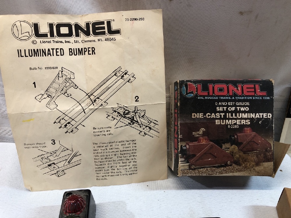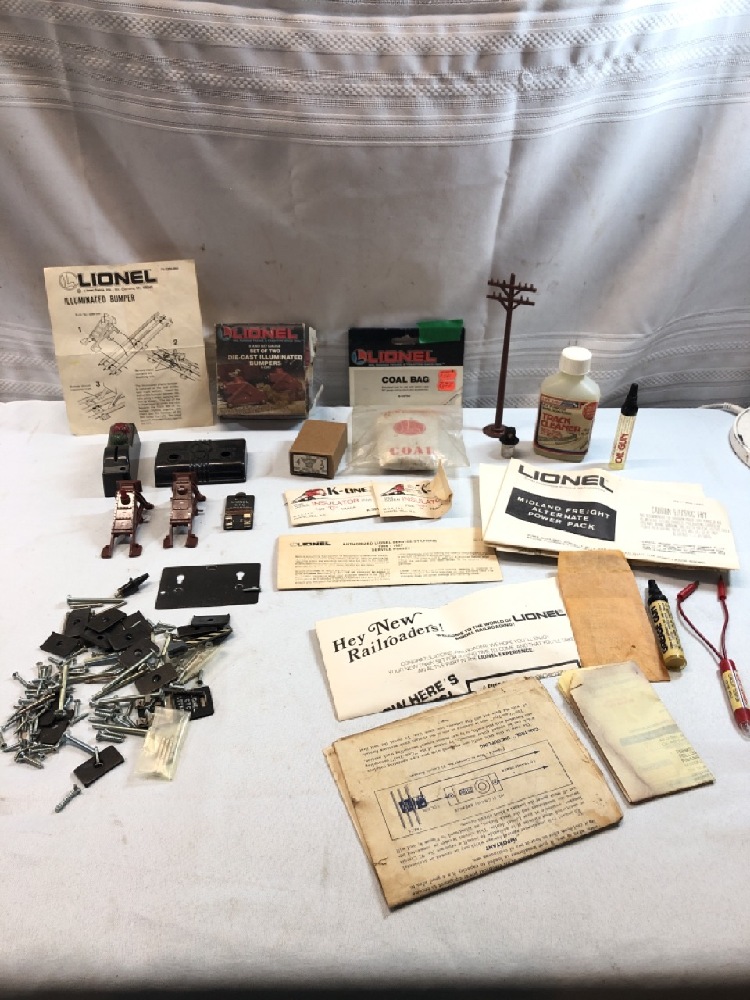 Lionel Railroad Accessories including Coal Bag, Die Cast Illuminated Bumpers, insulators and Much More