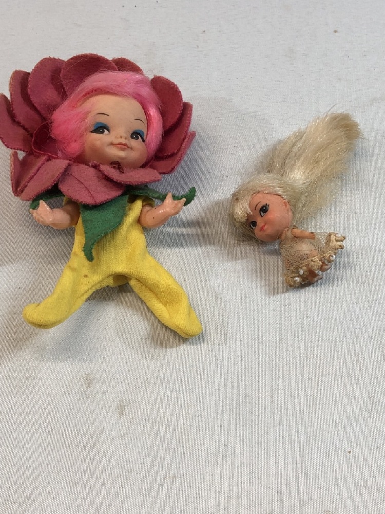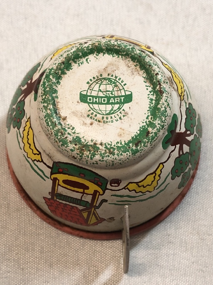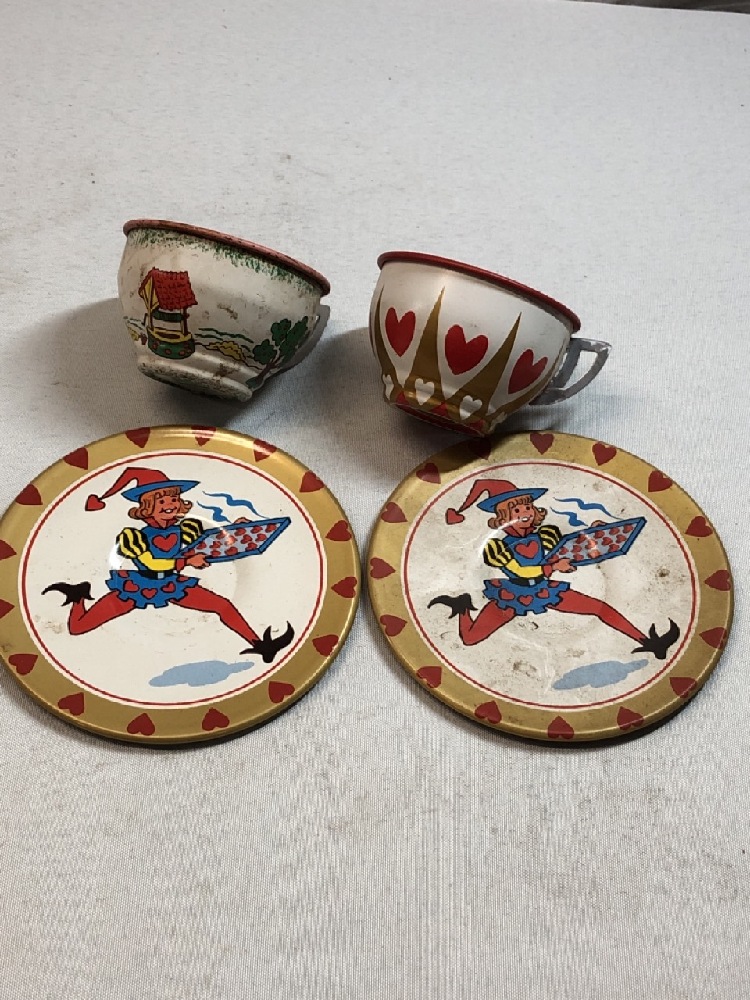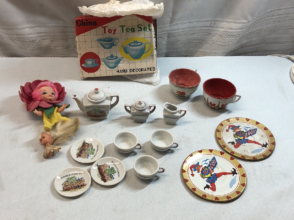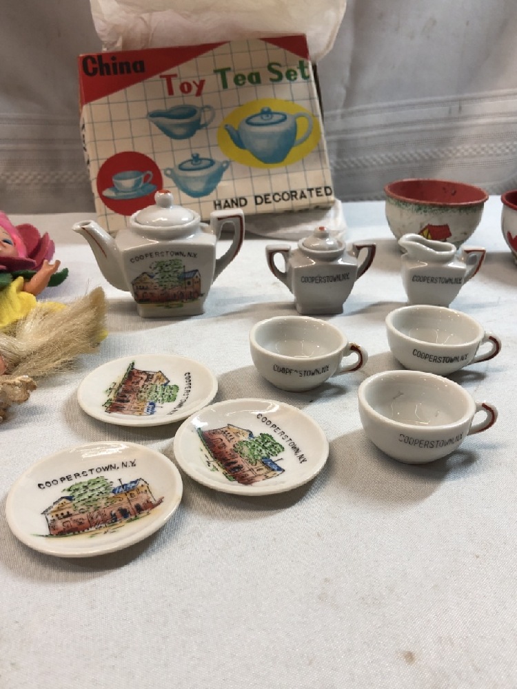Vintage toys, mini cooperstown tea set, tin tea cups/saucers pixie elf, Little Kiddie, Finger Ding Doll