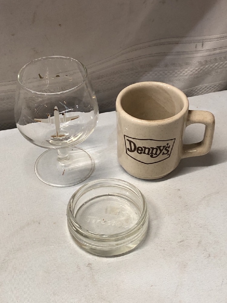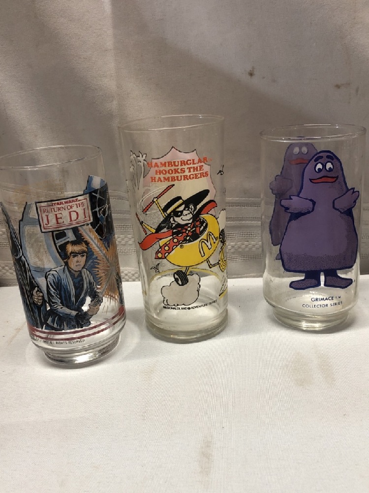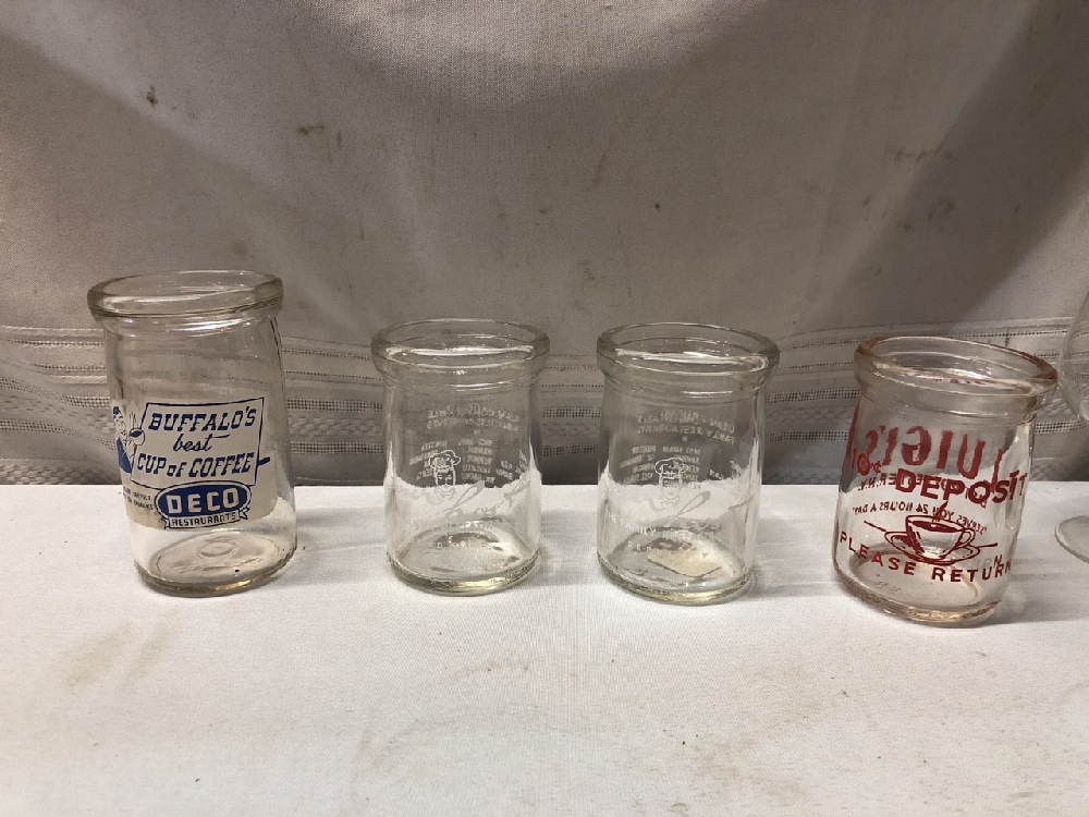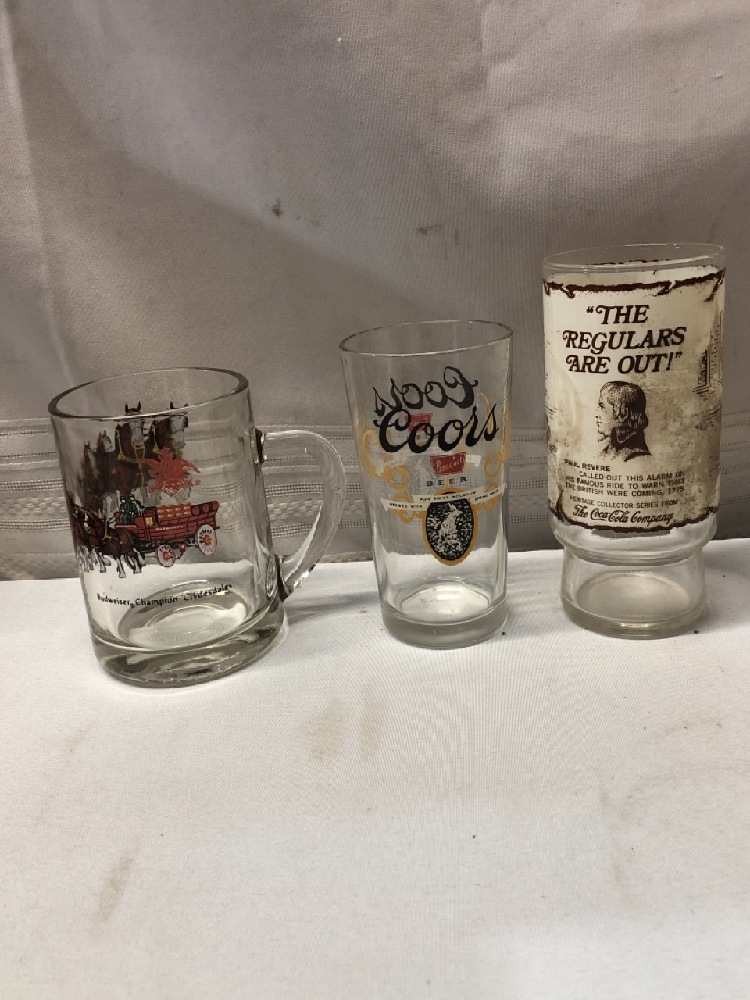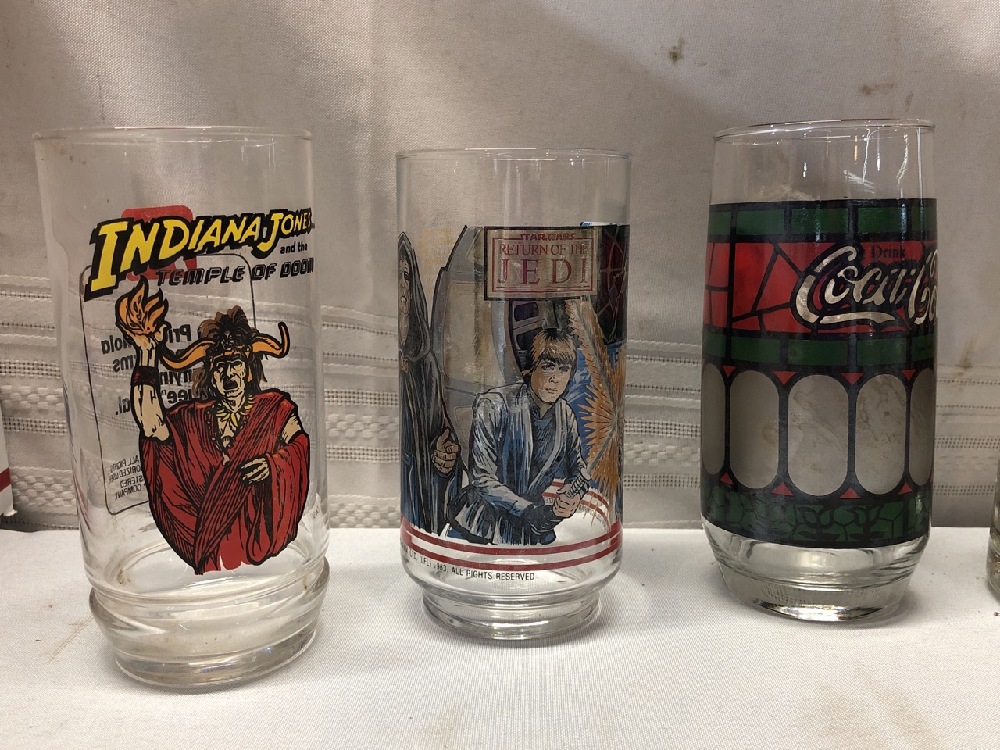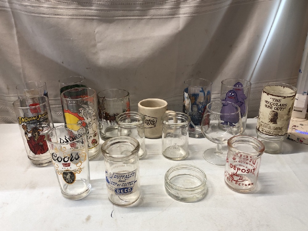 Vtg. Advertising Glasses, Mugs and Jars including Coors, “Buffalos best coffee” Deco Restaurants, Indiana Jones 7up, McDonalds, Budweiser, Coca-Cola, Luigi’s, Denny’s, Paul Revere and Firestone