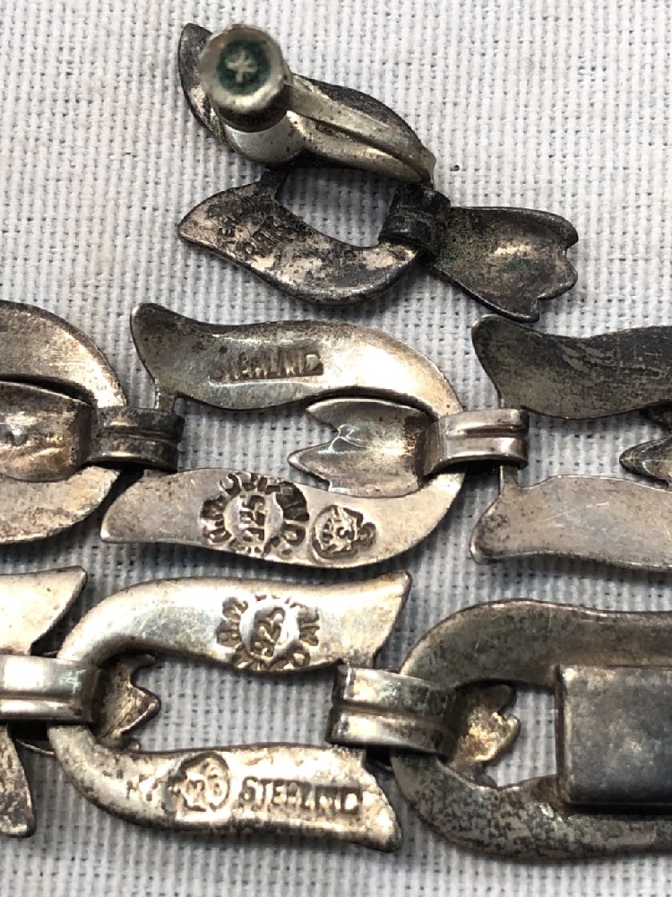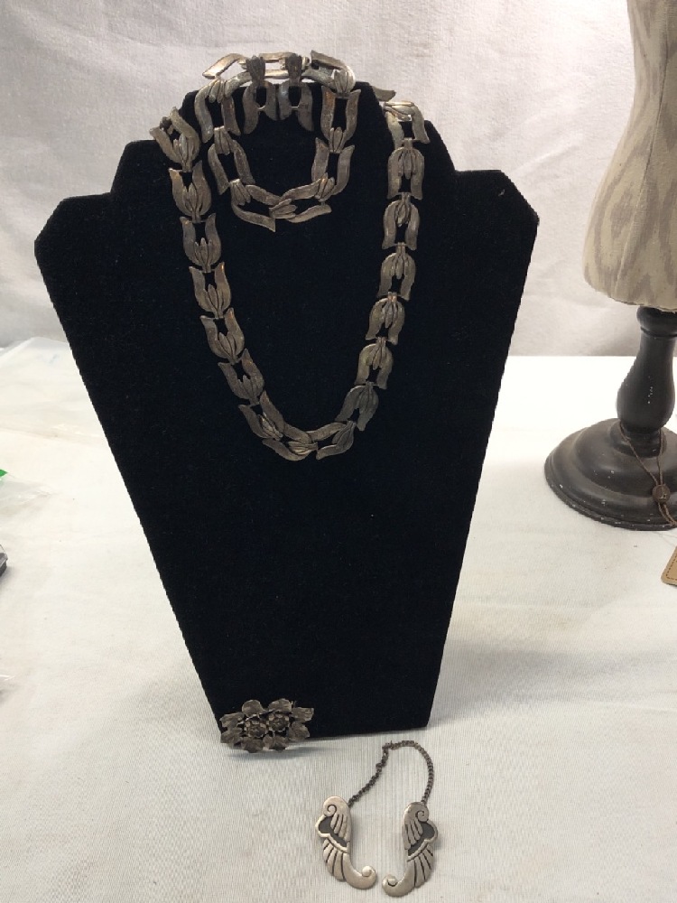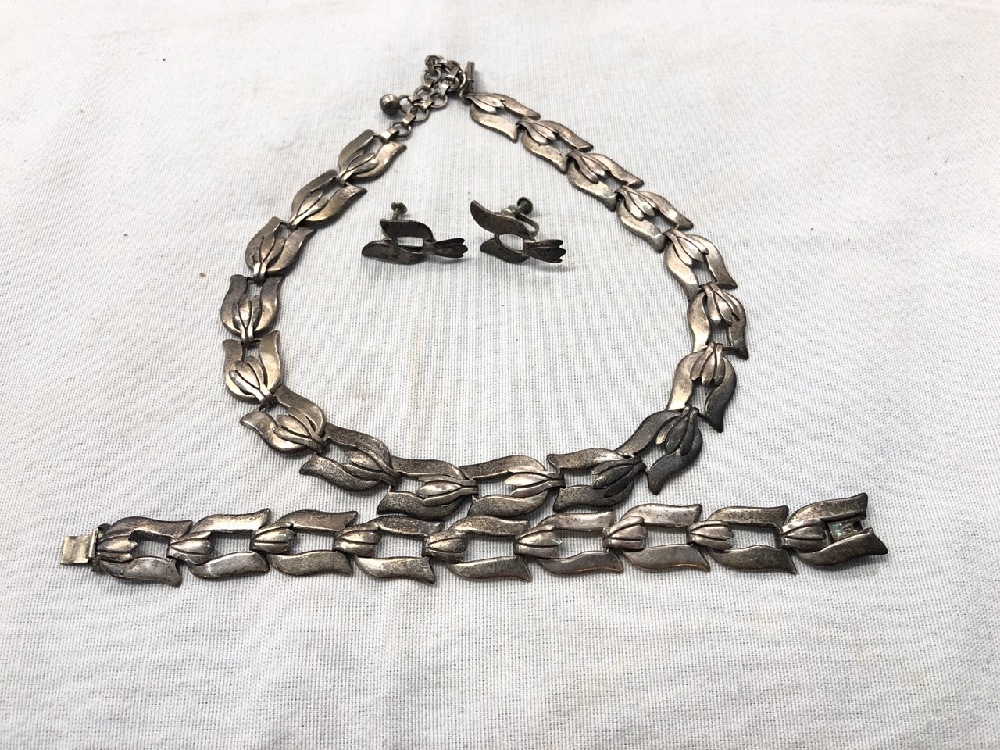 Vtg. Sterling Silver Jewelry Including Matching Earrings, Bracelet and Necklace , Sweater Clips and Repouse Flowers Brooch