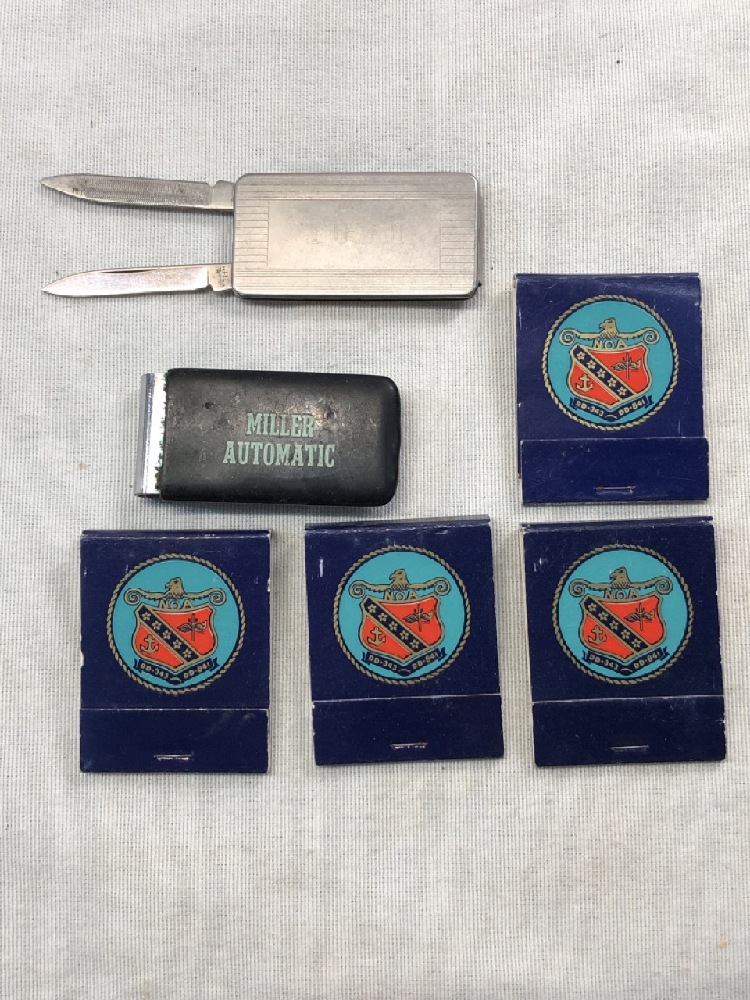4 US Navy Matchbooks, Imperial Money Clip pocket Knife/Nail File, and Miller Automatic Money Clip