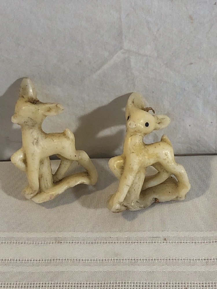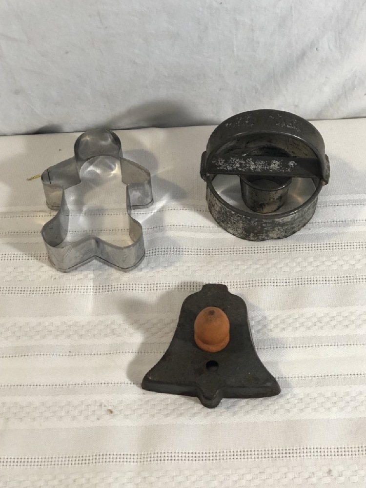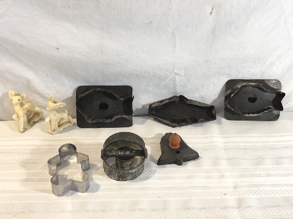 Antique Cookie Cutters and Vtg. Deer wax Candles - 19th Century Fish Tin Cookie cutters, Kreamer Cookie Cutter, 2 wax Deer Shaped Candles