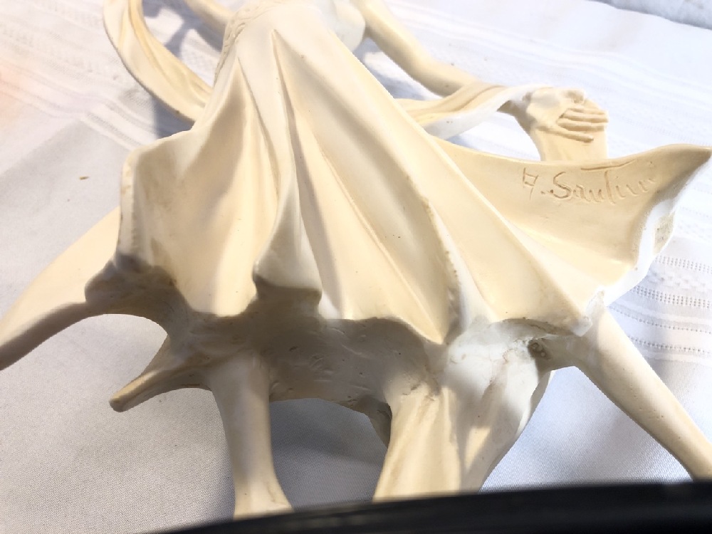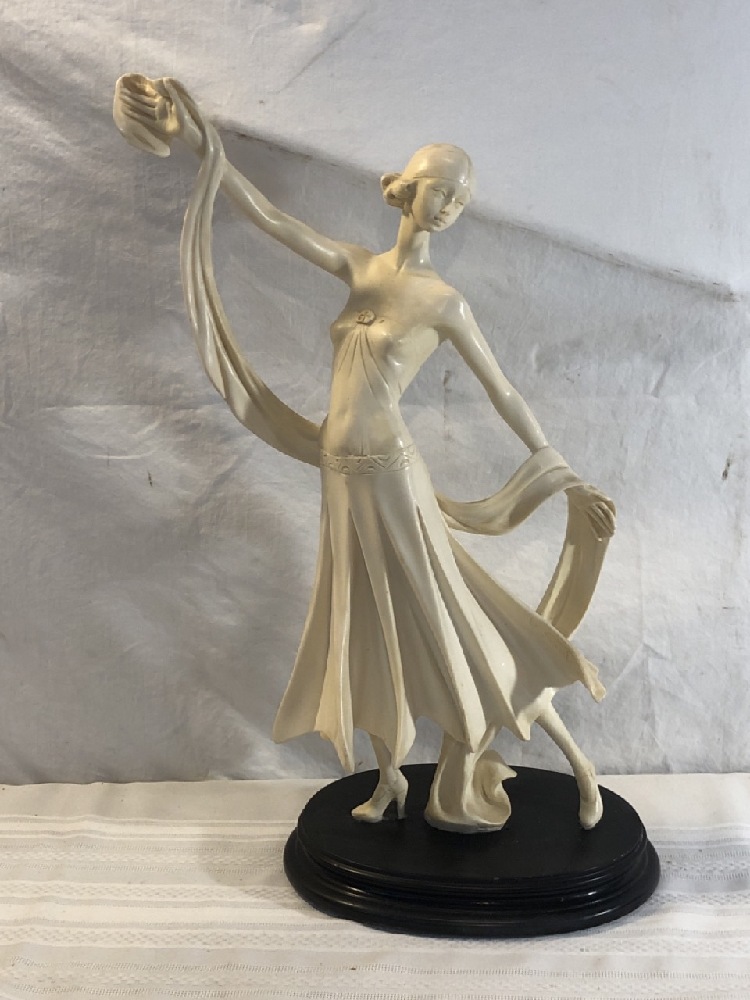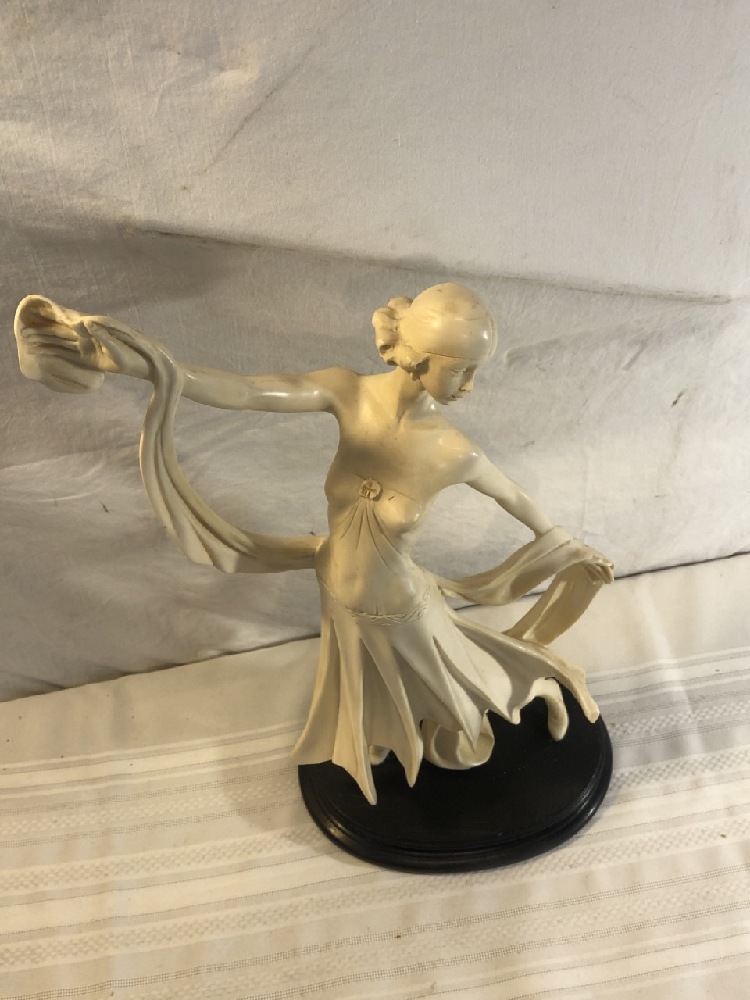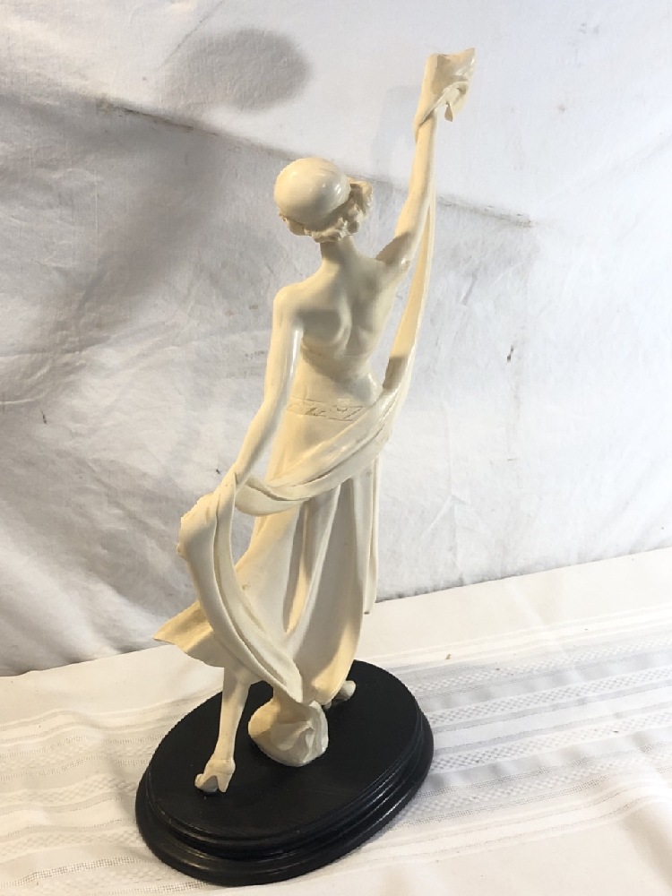 Art Deco Style Sculpture of Dancing Woman ~ Signed A. Santini - likely Made of Bonded Carrara Marble and Alabaster ~ 18” Tall to top of Hand , Base 9” Long