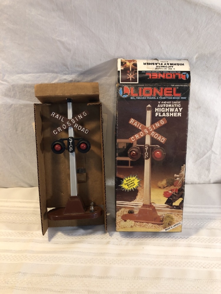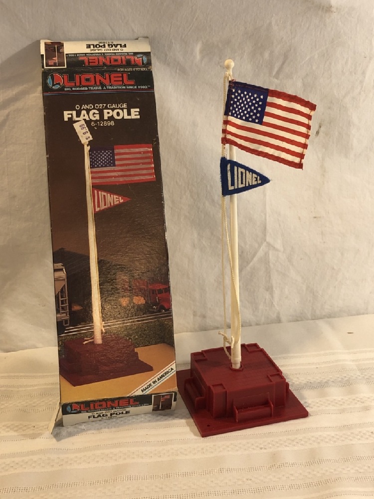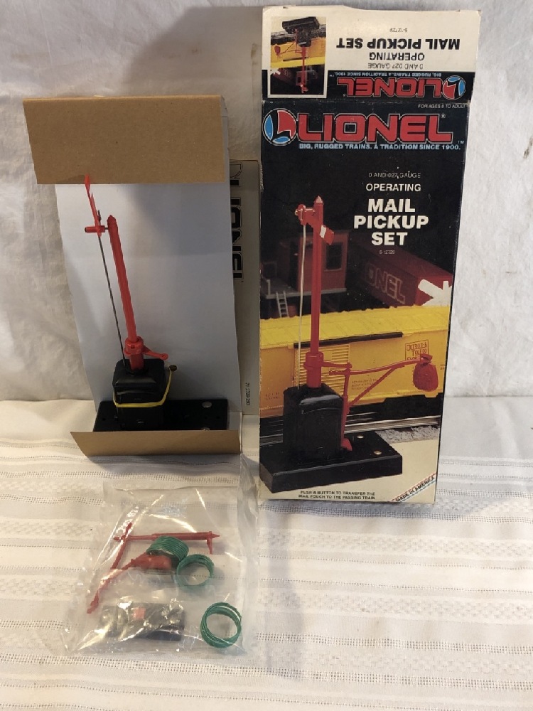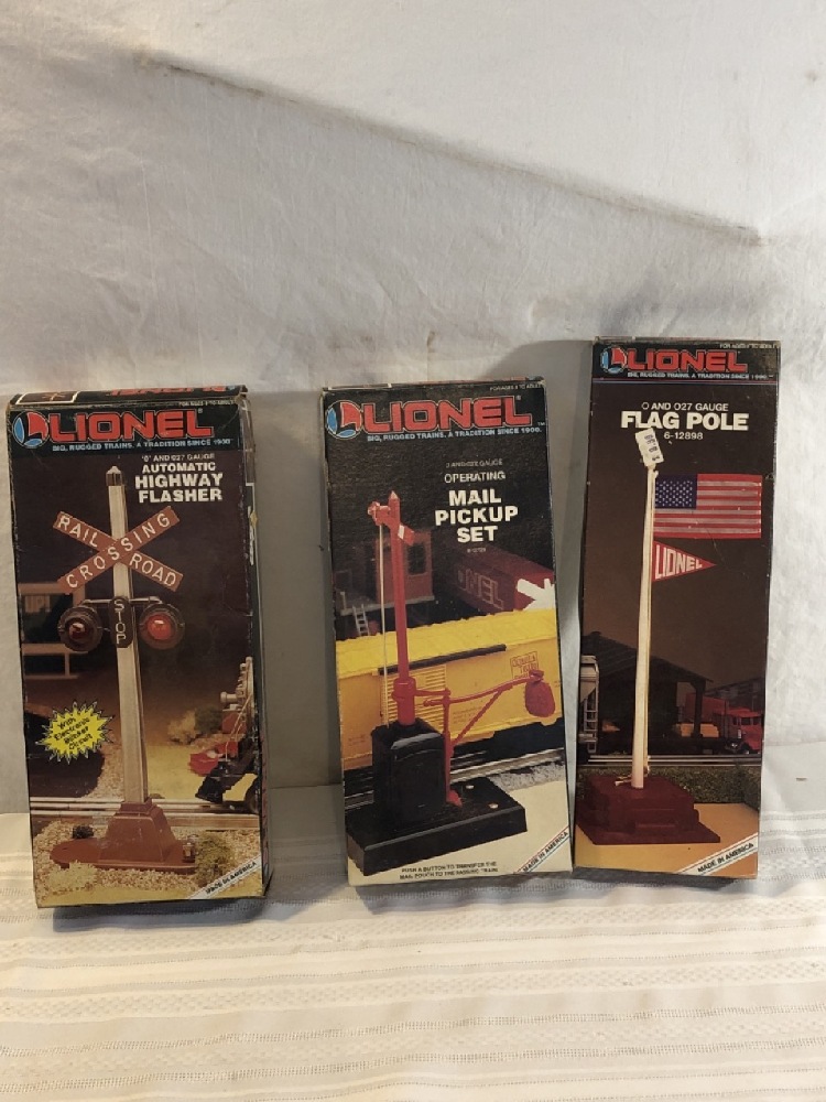 Vtg. Lionel Train Accessories - Automatic Highway Flasher 6-12760, Operating Mail Pick-up Set 6-12729, and Flag Pole 6-12898- All new in original Boxes