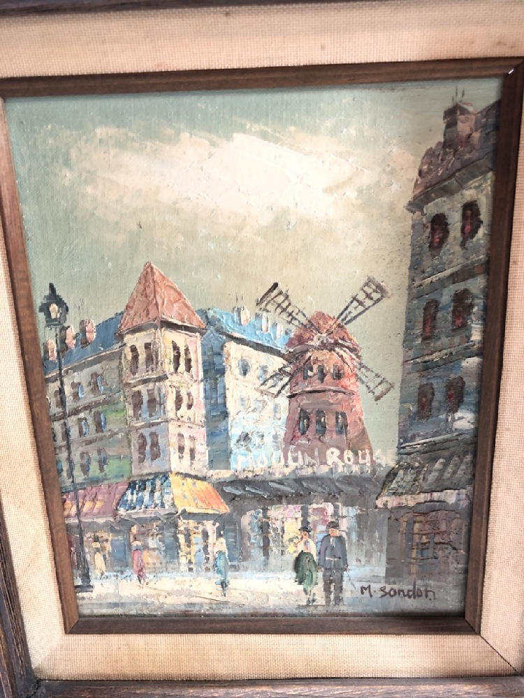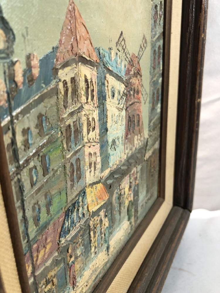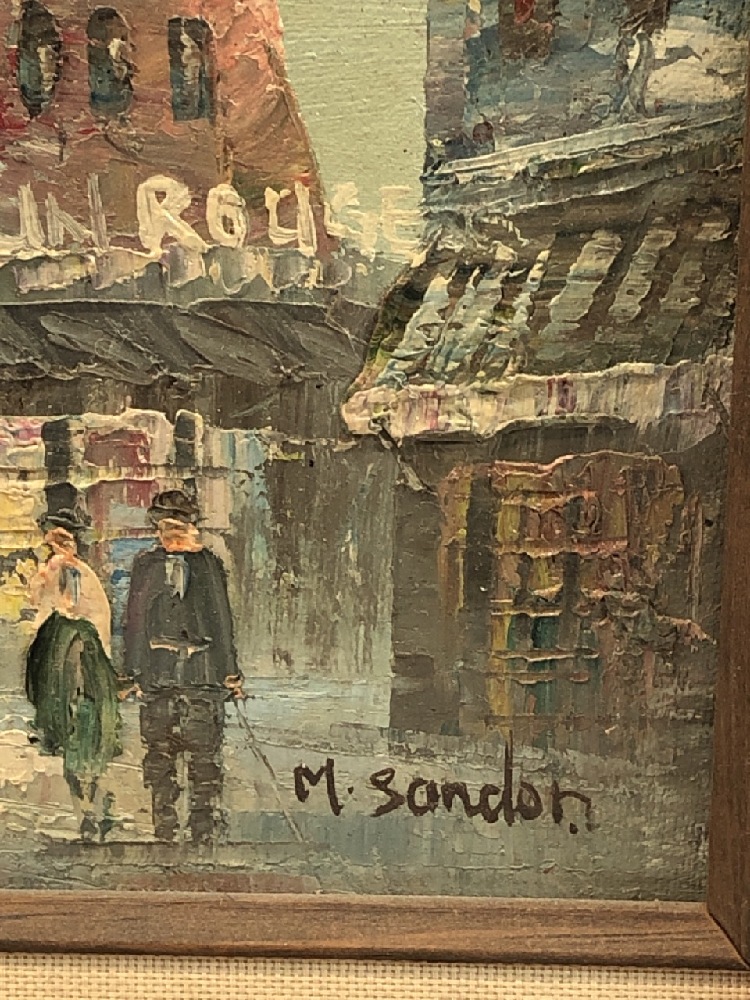 Vintage Oil Painting Depicting A street in Paris Featuring the Moulin Rouge Windmill - Signed M. Sandor ~ Framed 16” x 18”
