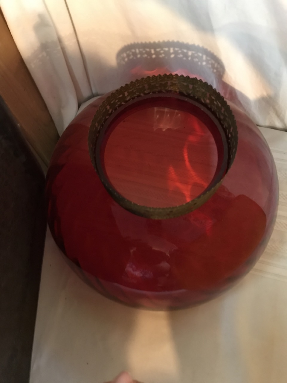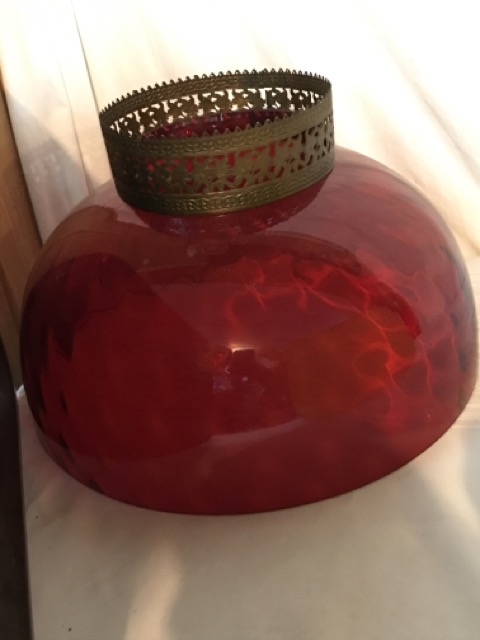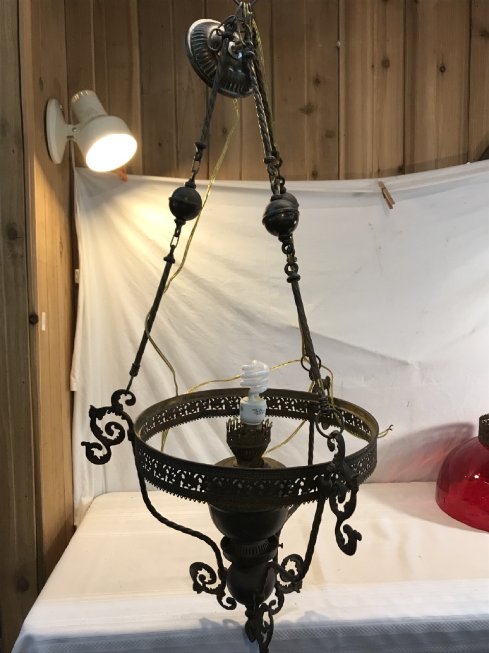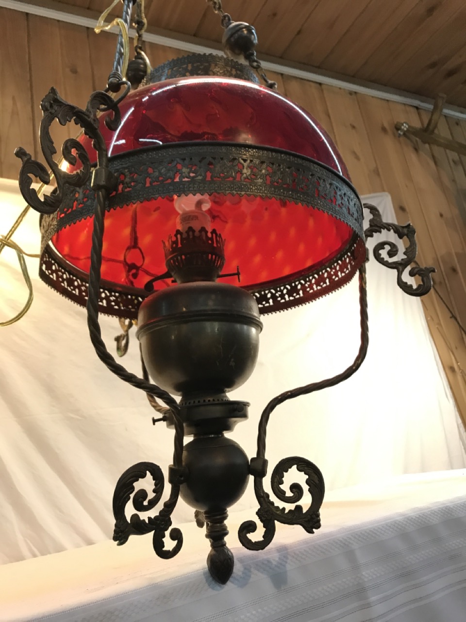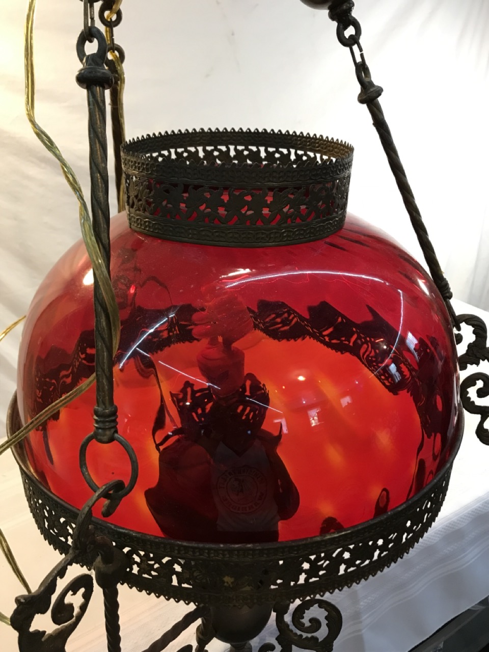 Antique Oil Hanging Lamp Electrified - Ruby Red Glass Shade, Brass fixture ~ 41” Tall x 14” Round Shade