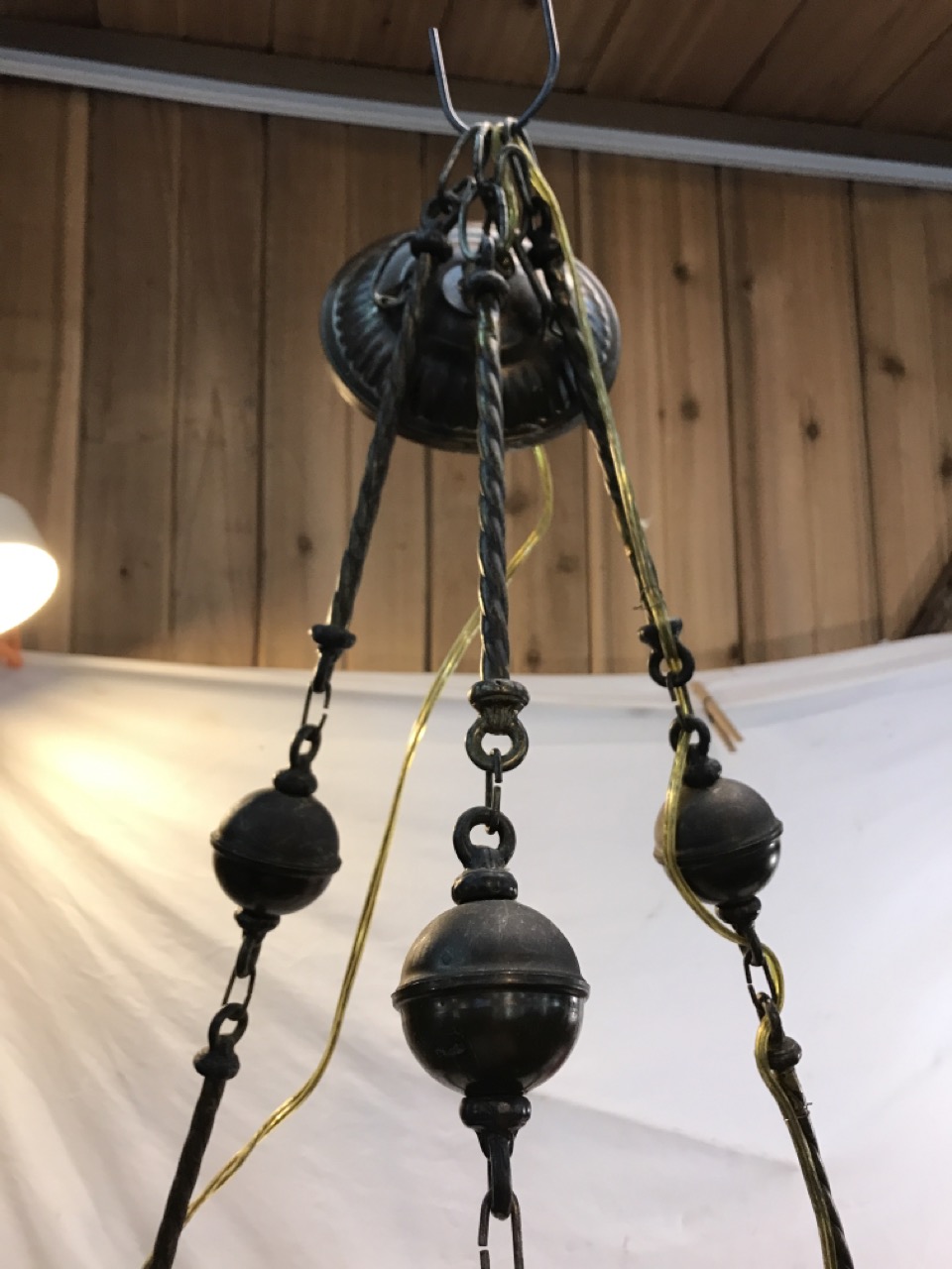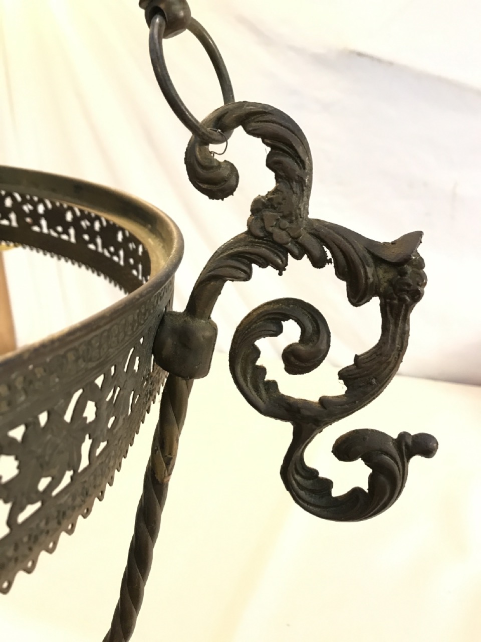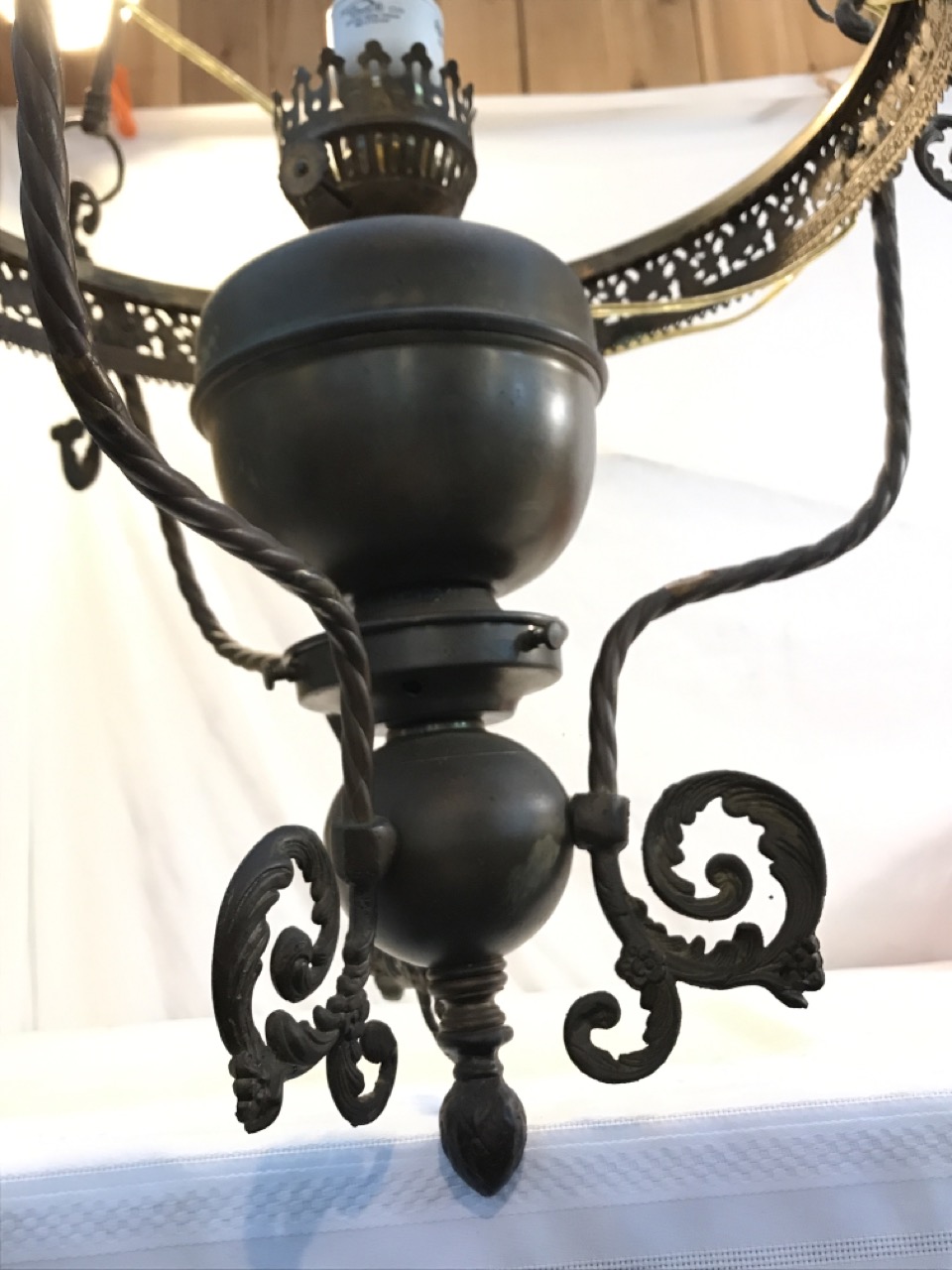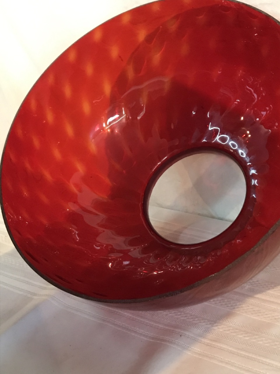 Antique Oil Hanging Lamp Electrified - Ruby Red Glass Shade, Brass fixture ~ 41” Tall x 14” Round Shade